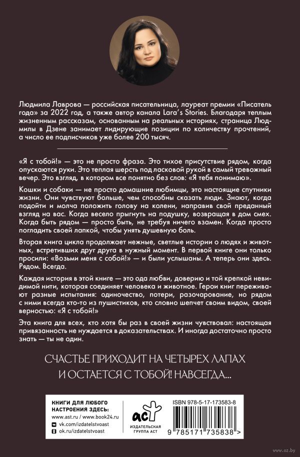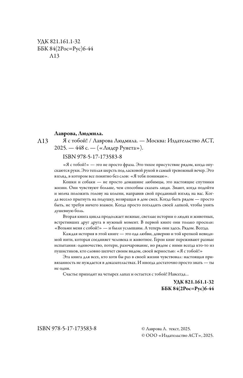 Каждая история в этой книге – это ода любви, доверию и той крепкой невидимой нити, которая соединяет человека и животное. Герои книг переживают разные испытания: одиночество, потери, разочарование, но рядом с ними всегда кто-то из пушистиков, кто словно шепчет своим видом, своей верностью: "Я с тобой!"