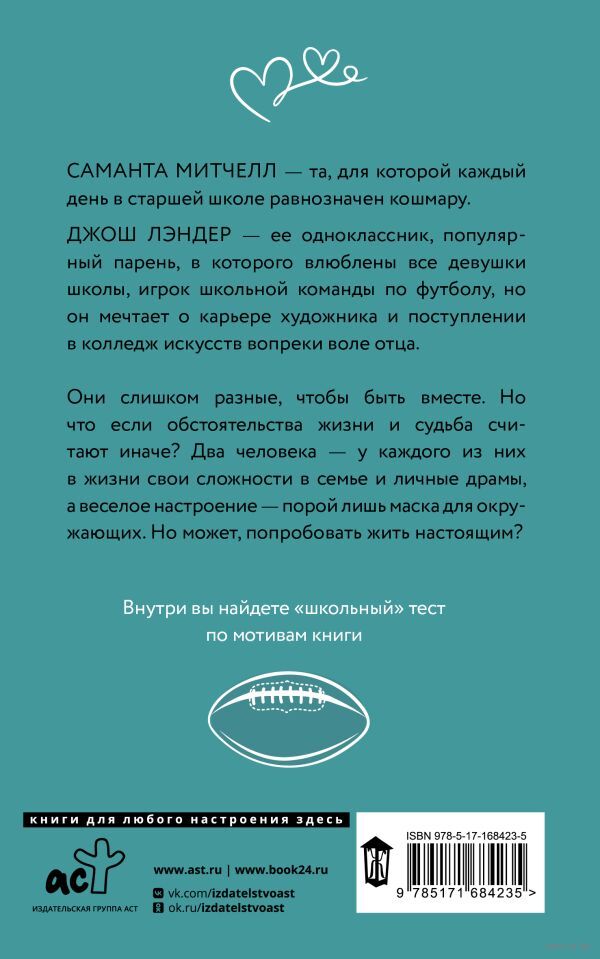 САМАНТА МИТЧЕЛЛ – та, для которой каждый день в старшей школе равнозначен кошмару. ДЖОШ ЛЭНДЕР – ее одноклассник, популярный парень, в которого влюблены все девушки школы, игрок школьной команды по футболу, но он мечтает о карьере художника и поступлении в колледж искусств вопреки воле отца. Они слишком разные, чтобы быть вместе. Но что если обстоятельства жизни и судьба считают иначе? Два человека – у каждого из них в жизни свои сложности в семье и личные драмы, а веселое настроение – порой лишь маска для окружающих. Но может, попробовать жить настоящим?
