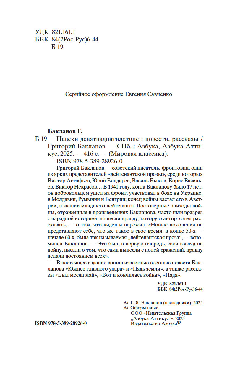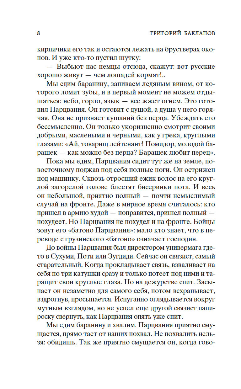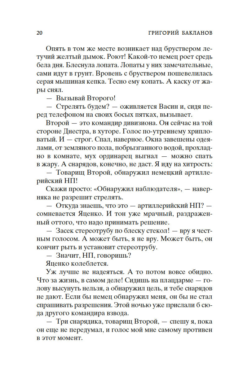 Григорий Бакланов – советский писатель, фронтовик, один из ярких представителей "лейтенантской прозы", среди которых Виктор Астафьев, Юрий Бондарев, Василь Быков, Борис Васильев, Виктор Некрасов… В 1941 году, когда Бакланову было 17 лет, он добровольцем ушел на фронт, участвовал в боях на Украине, в Молдавии, Румынии и Венгрии; конец войны застал его в Австрии, в звании младшего лейтенанта. Достоверные эпизоды войны, отраженные в произведениях Бакланова, часто шли вразрез с парадной историей, но несли правду, которую автор хотел рассказать, – о том, что видел и пережил. "Новые поколения не представляют себе, что же такое в свое время, в конце 50-х – начале 60-х, была так называемая "лейтенантская проза", – вспоминал Бакланов. – Это был, в первую очередь, свой взгляд на войну, писали о том, что сами вынесли с полей сражений, правду делали достоянием всех".