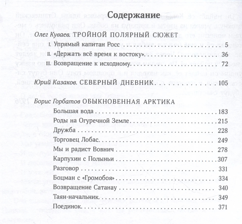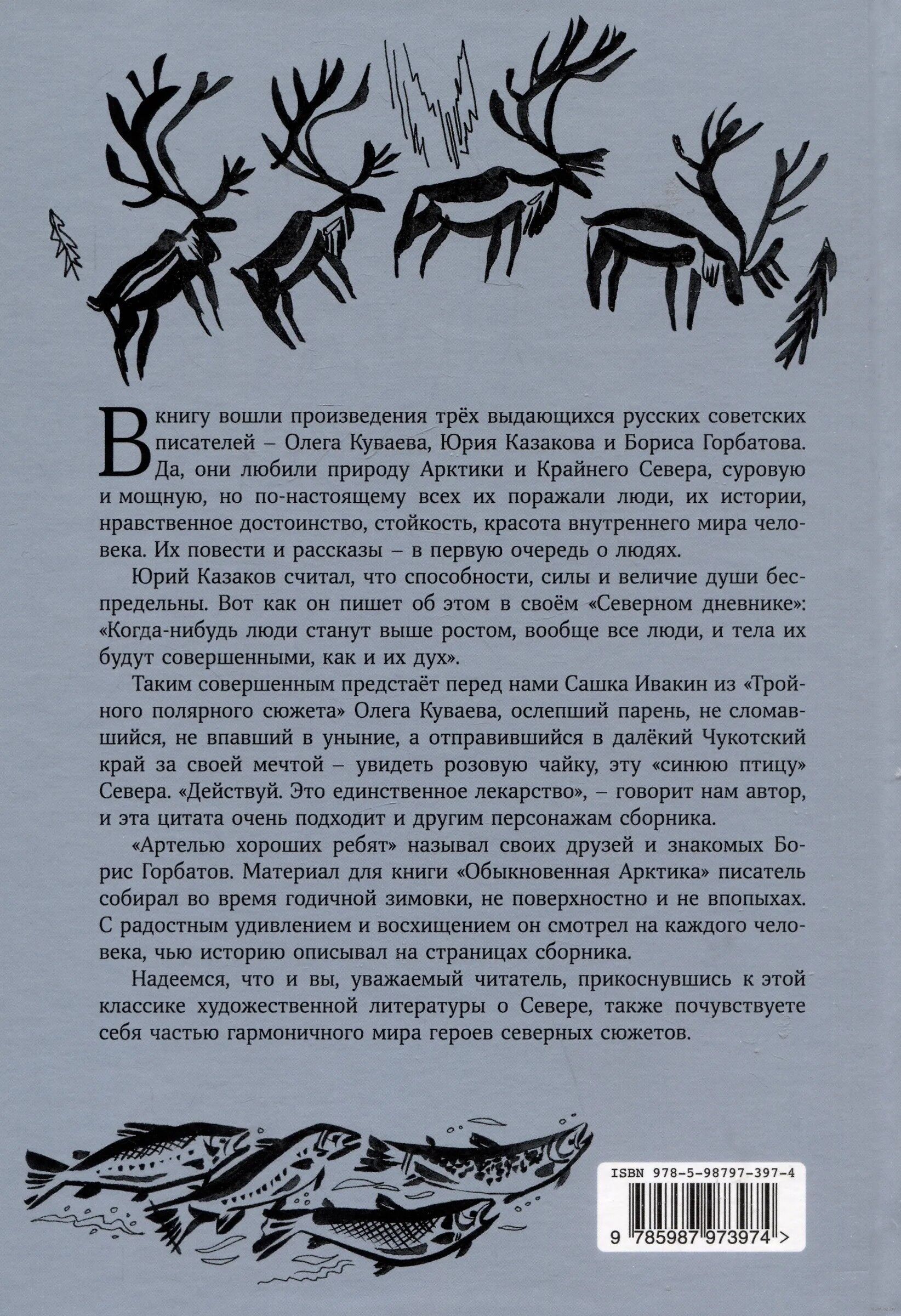 В книгу "Тройной полярный сюжет" вошли одноименная повесть Олега Куваева, повесть Юрия Казакова "Северный дневник" и одиннадцать рассказов из книги "Обыкновенная Арктика" Бориса Горбатова.