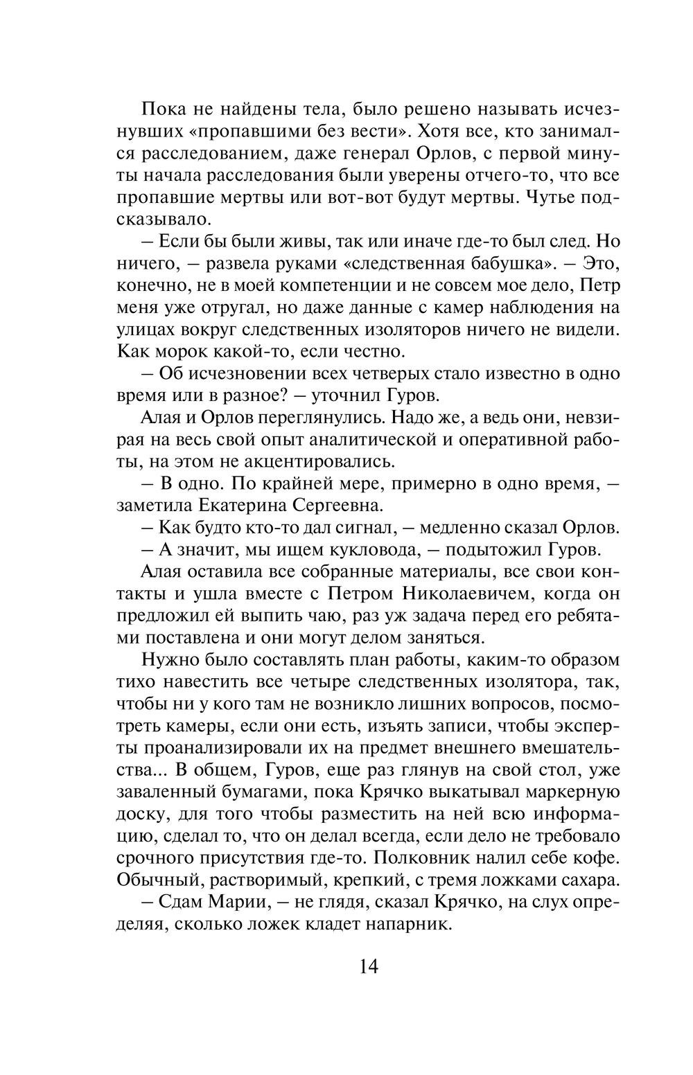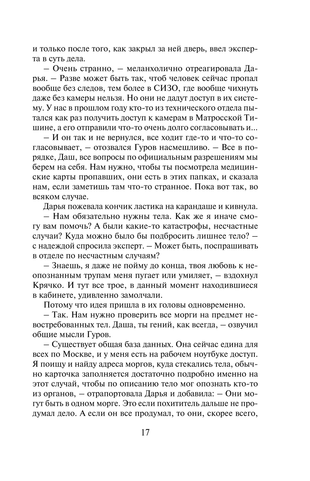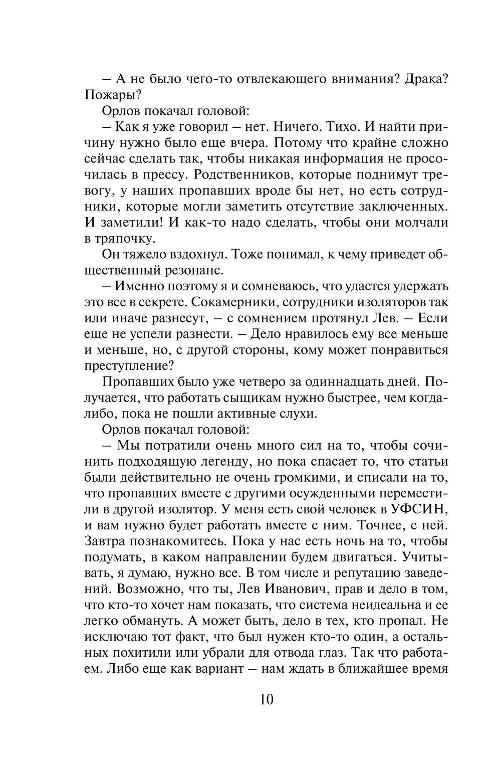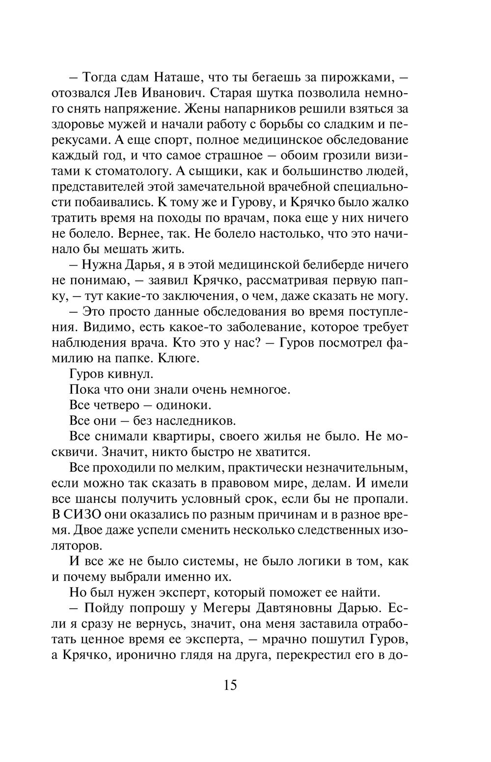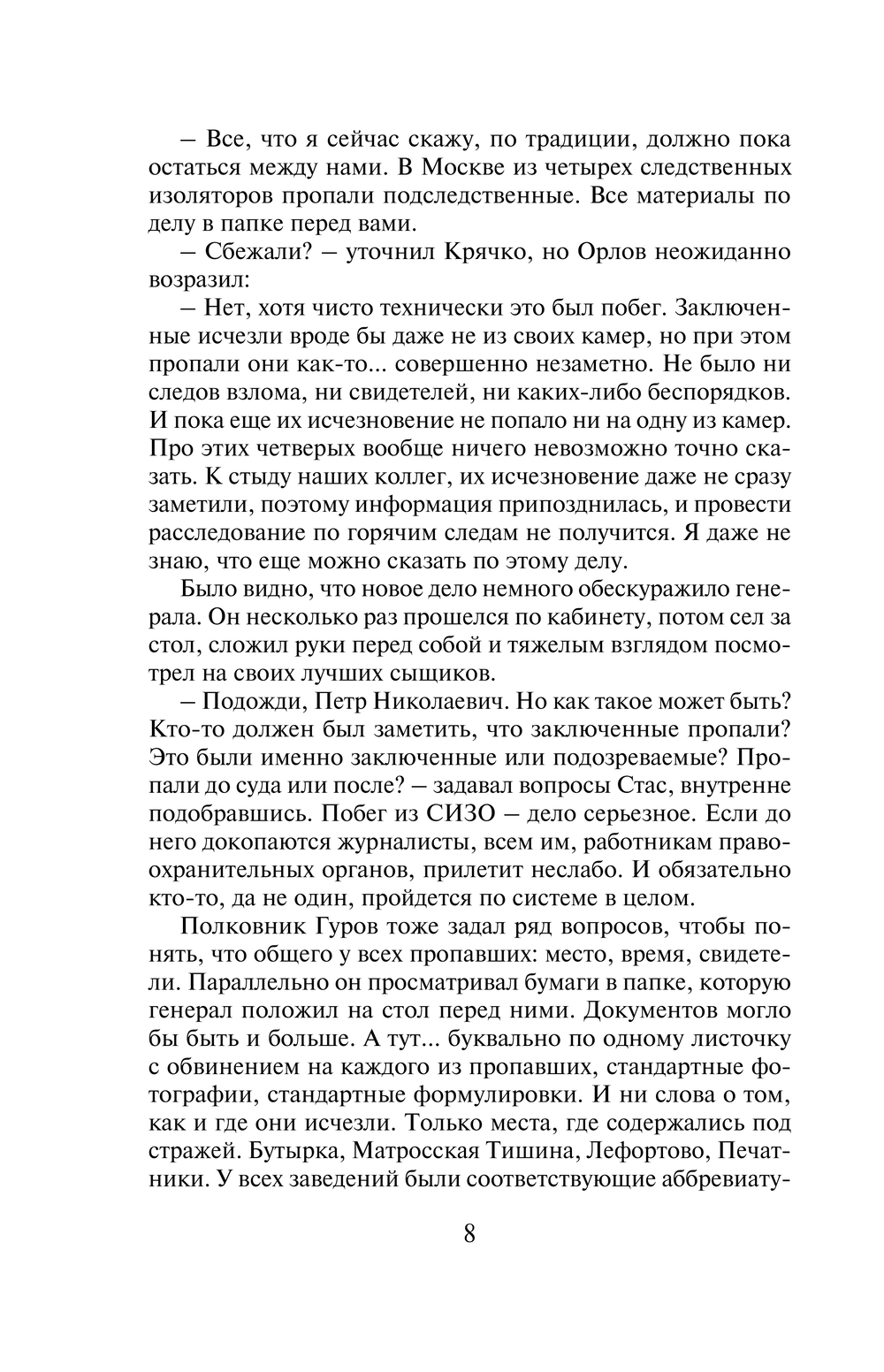 Сразу из нескольких следственных изоляторов Москвы за короткий срок незаметно пропадают четверо заключенных. Обстоятельства исчезновения у всех разные: кто-то пропал на перекличке после прогулки, кто-то из лазарета, кто-то после банного дня. Формально это побег, но – без следов взлома, без свидетелей и соучастников. Розыск беглецов поручен полковникам МВД Гурову и Крячко. Они выясняют, что все четверо зэков были одиноки, наследников не имели, снимали жилье, то есть на воле их никто особо не ждал. К тому же, по суду все они получили незначительные сроки. В чем же причина такого внезапного исчезновения?.. Решающий поворот эта история получает после того, как при странных обстоятельствах погибает одна из сотрудниц Службы исполнения наказаний, причастных к данному делу…