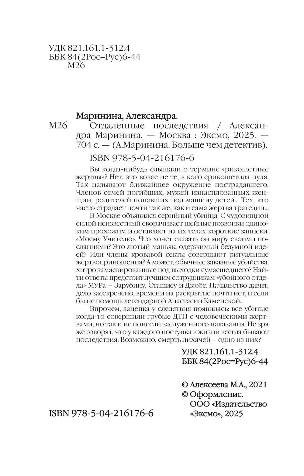 В Москве объявился серийный убийца. С чудовищной силой неизвестный сворачивает шейные позвонки одиноким прохожим и оставляет на их телах короткие записки: "Моему Учителю". Что хочет сказать он миру своими посланиями? Это лютый маньяк, одержимый безумной идеей? Или члены кровавой секты совершают ритуальные жертвоприношения? А может, обычные заказные убийства, хитро замаскированные под выходки сумасшедшего? Найти ответы предстоит лучшим сотрудникам "убойного отдела" МУРа – Зарубину, Сташису и Дзюбе. Начальство давит, дело засекречено, времени на раскрытие почти нет, и если бы не помощь легендарной Анастасии Каменской...
