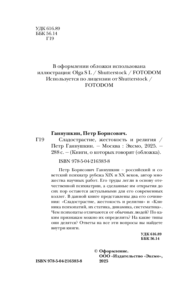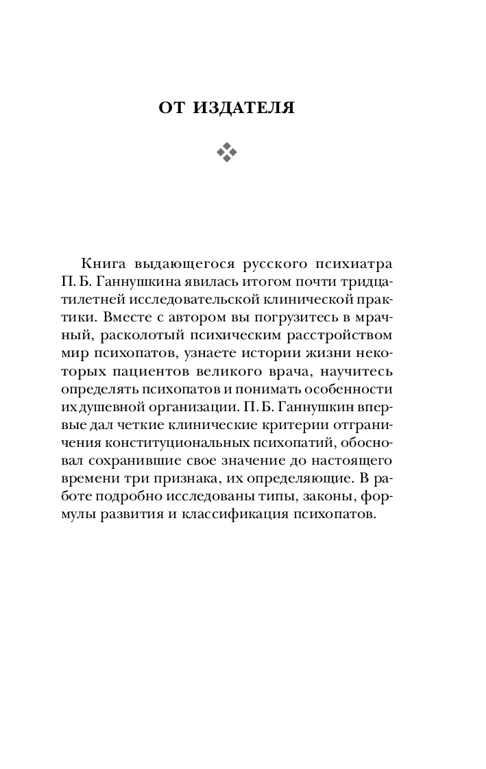Петр Борисович Ганнушкин – российский и советский психиатр рубежа XIX и XX веков, автор множества научных работ. Его труды легли в основу отечественной психиатрии, а сделанные им открытия до сих пор остаются актуальными для его современных коллег. В данной книге представлены два его сочинения: "Сладострастие, жестокость и религия" и "Клиника психопатий, их статика, динамика, систематика". Чем психопаты отличаются от обычных людей? По каким признакам можно их определить? А на какие типы они делятся? Ответы на все эти вопросы вы найдете внутри книги.