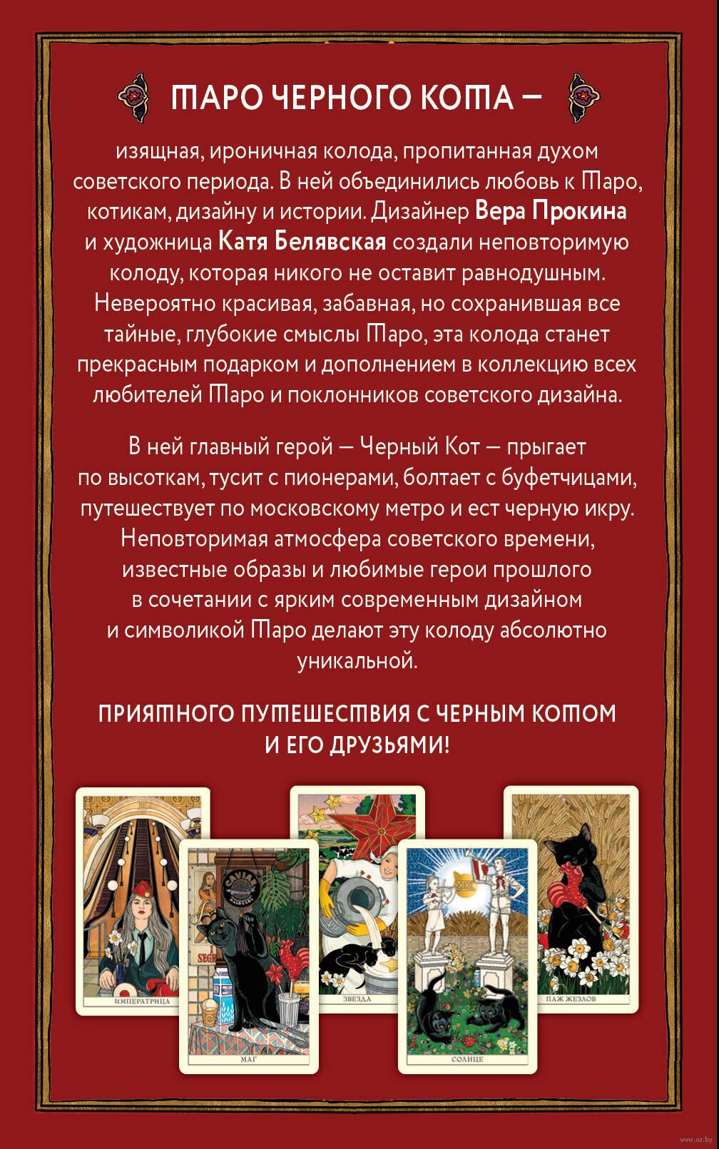 Абсолютное очарование для ценителей изящных коллекционных колод Таро. Очень стильная, яркая, ироничная колода, вдохновленная советским дизайном. В ней сочетается любовь к котикам, дизайну, истории и Таро. Художница Екатерина Белявская и дизайнер Вера Прокина создали неповторимую коллекционную колоду Таро для тонких ценителей дизайнерских вещей. Главный герой колоды – легендарный Черный кот, который тусит с пионерами, болтает с буфетчицами, ест черную икру и путешествует по московскому метро. Неповторимая атмосфера, ирония, великолепные иллюстрации в сочетании с символикой Таро Уэйта делает эту колоду уникальной.