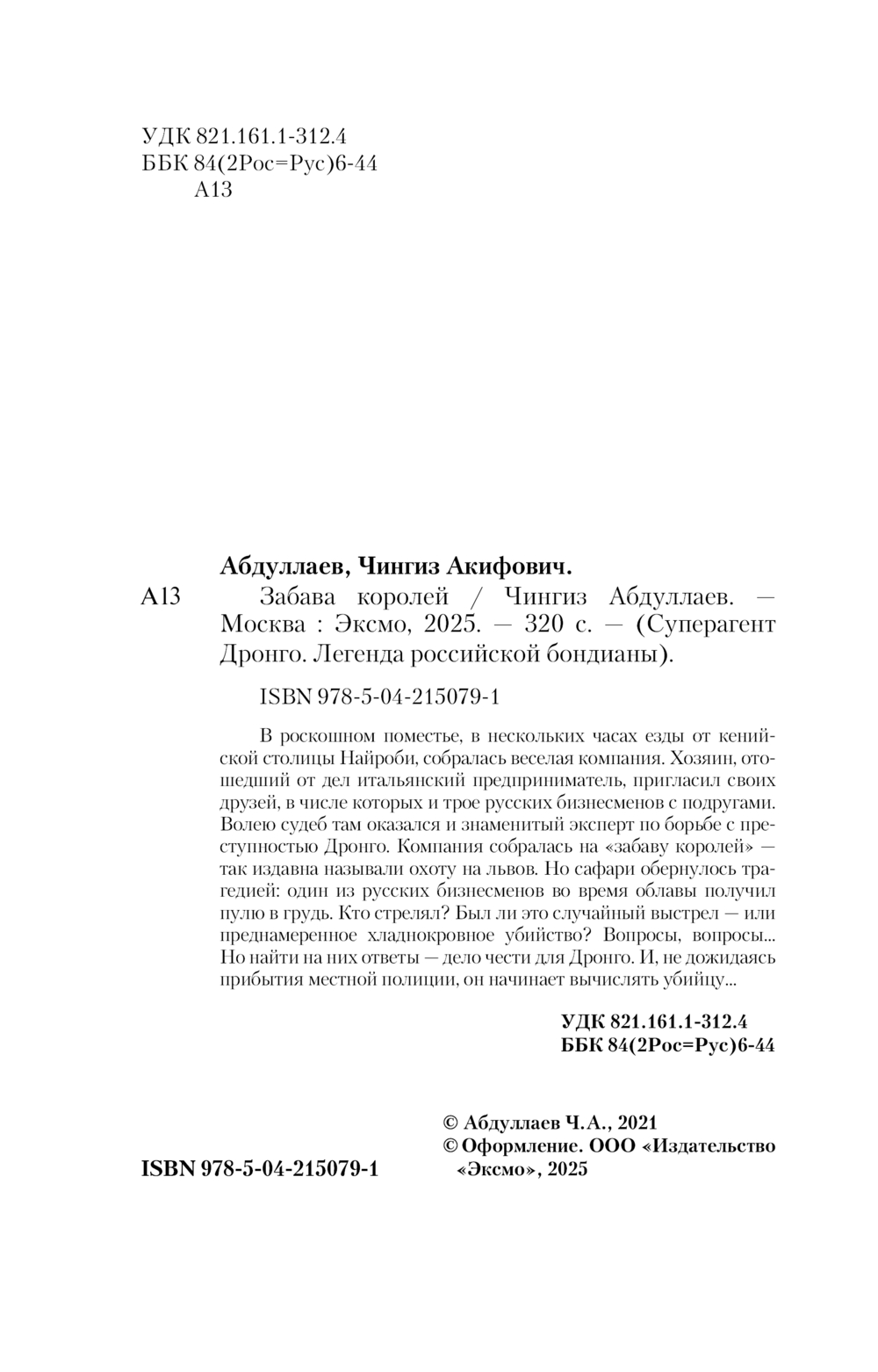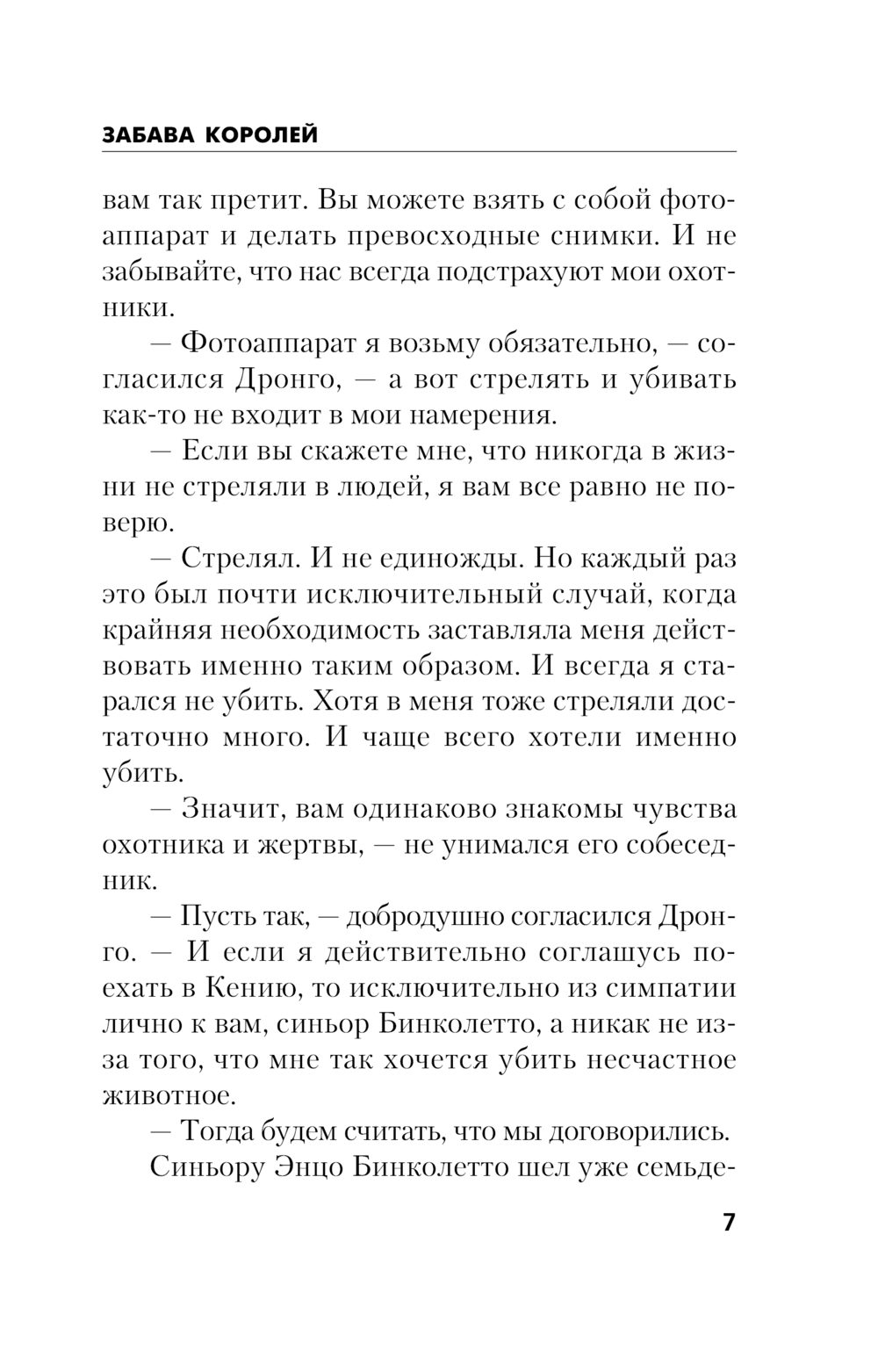 В роскошном поместье, в нескольких часах езды от кенийской столицы Найроби, собралась веселая компания. Хозяин, отошедший от дел итальянский предприниматель, пригласил своих друзей, в числе которых и трое русских бизнесменов с подругами. Волею судеб там оказался и знаменитый эксперт по борьбе с преступностью Дронго. Компания собралась на "забаву королей" – так издавна называли охоту на львов. Но сафари обернулось трагедией: один из русских бизнесменов во время облавы получил пулю в грудь. Кто стрелял? Был ли это случайный выстрел – или преднамеренное хладнокровное убийство? Вопросы, вопросы… Но найти на них ответы – дело чести для Дронго. И, не дожидаясь прибытия местной полиции, он начинает вычислять убийцу…