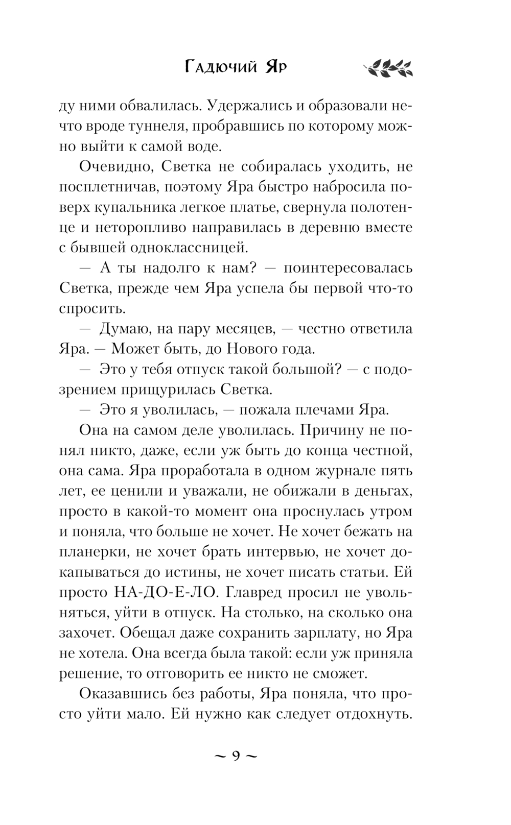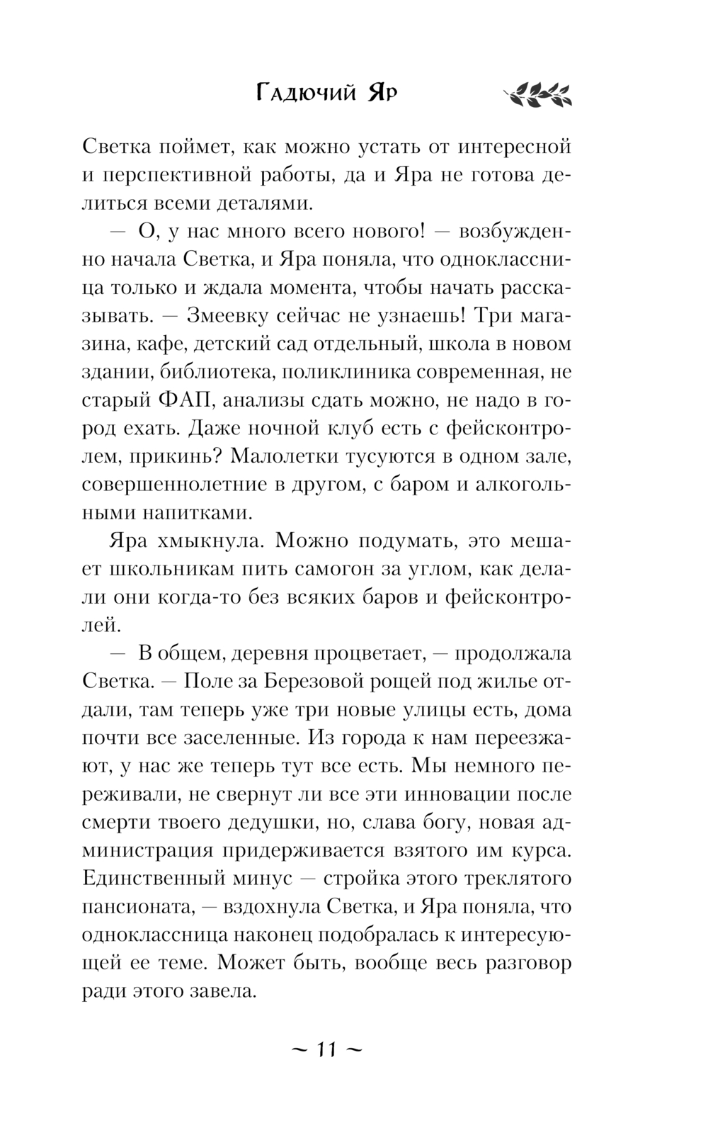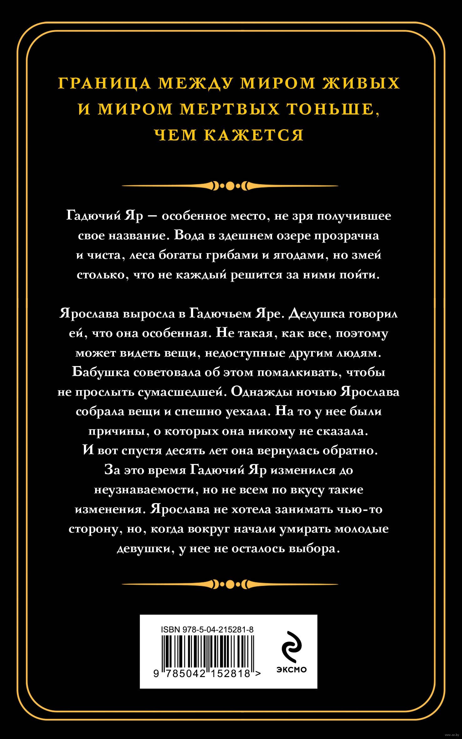 Ярослава выросла в Гадючьем Яре. Дедушка говорил ей, что она особенная. Не такая, как все, поэтому может видеть вещи, недоступные другим людям. Бабушка советовала об этом помалкивать, чтобы не прослыть сумасшедшей. Однажды ночью Ярослава собрала вещи и спешно уехала. На то у нее были причины, о которых она никому не сказала. И вот спустя десять лет она вернулась обратно. За это время Гадючий Яр изменился до неузнаваемости, но не всем по вкусу такие изменения. Ярослава не хотела занимать чью-то сторону, но, когда вокруг начали умирать молодые девушки, у нее не осталось выбора.