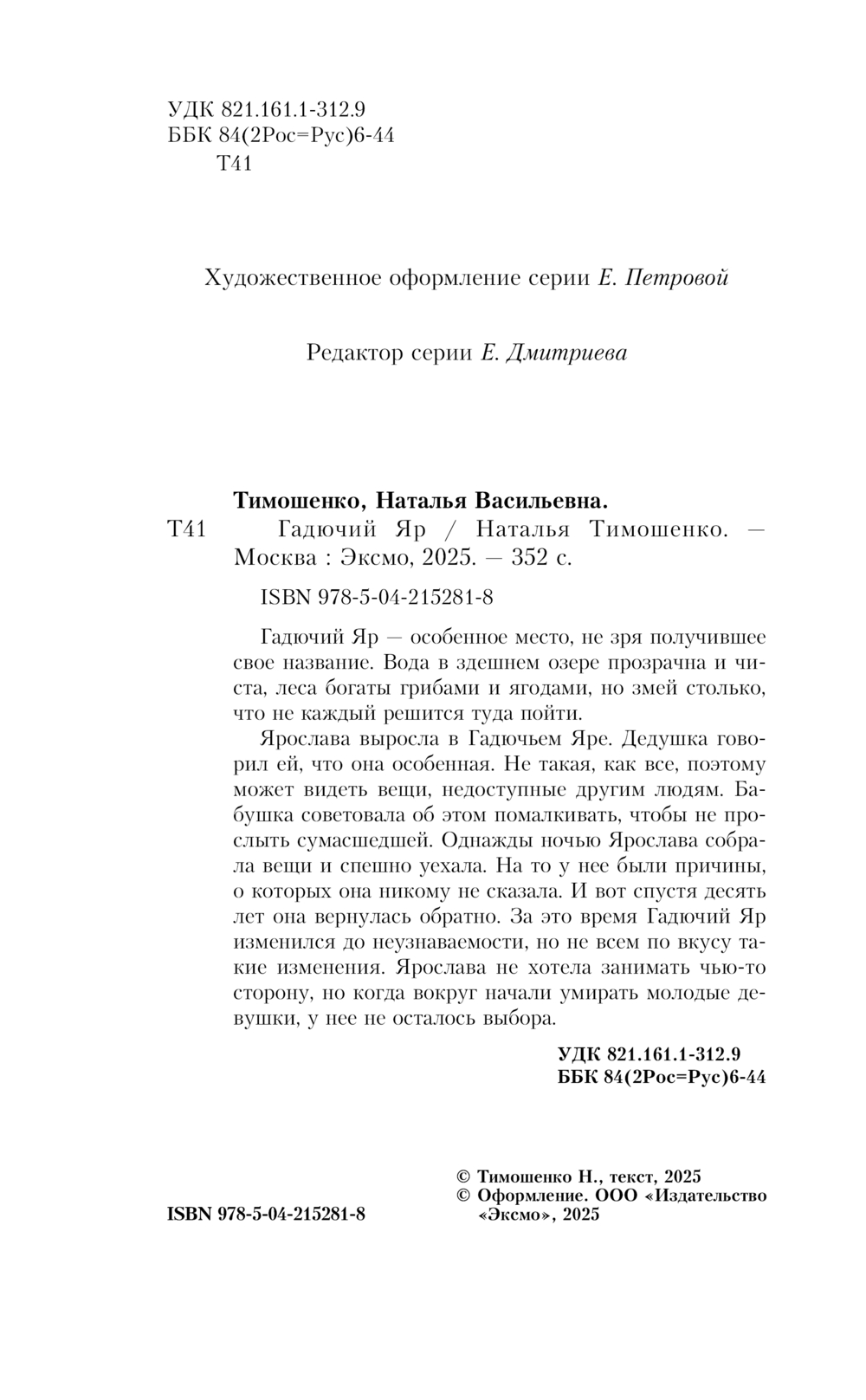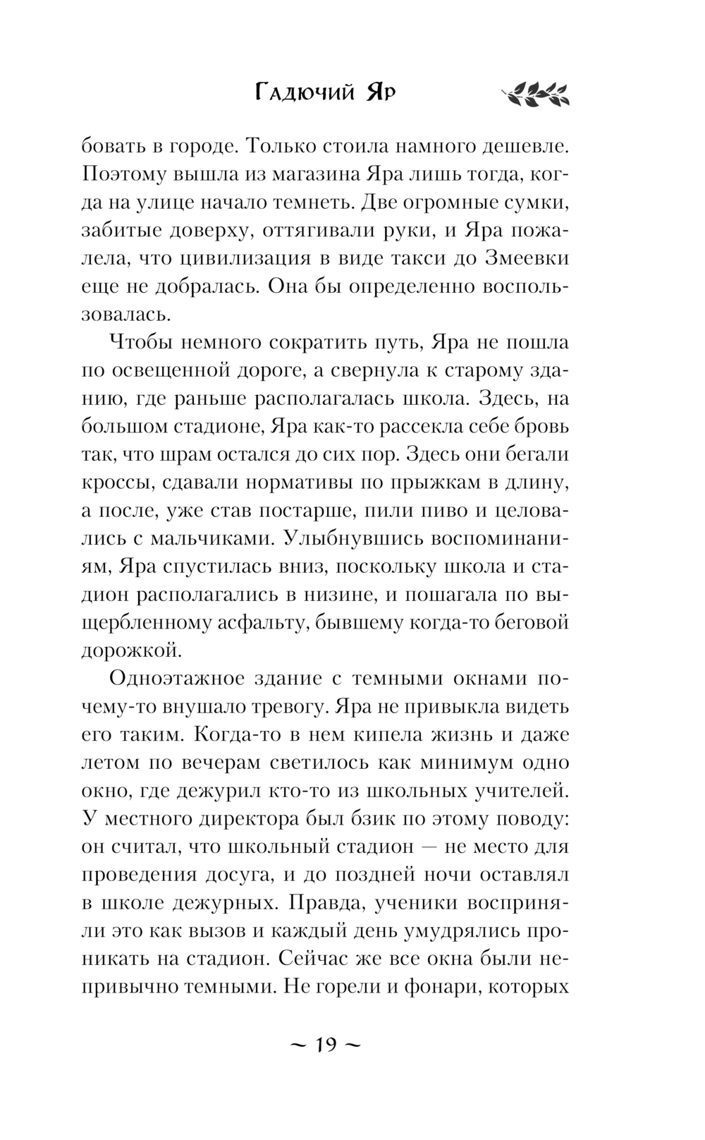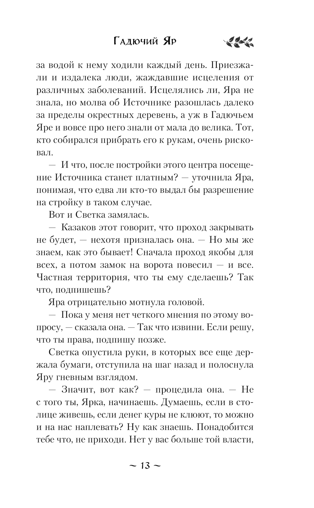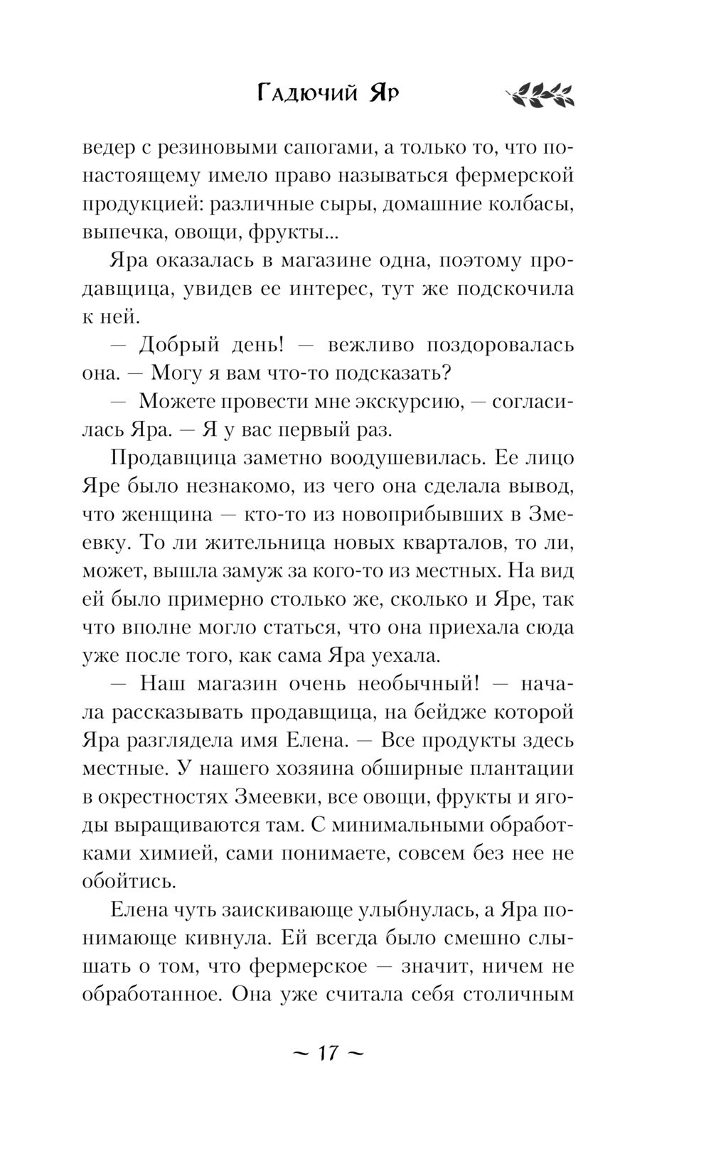 Ярослава выросла в Гадючьем Яре. Дедушка говорил ей, что она особенная. Не такая, как все, поэтому может видеть вещи, недоступные другим людям. Бабушка советовала об этом помалкивать, чтобы не прослыть сумасшедшей. Однажды ночью Ярослава собрала вещи и спешно уехала. На то у нее были причины, о которых она никому не сказала. И вот спустя десять лет она вернулась обратно. За это время Гадючий Яр изменился до неузнаваемости, но не всем по вкусу такие изменения. Ярослава не хотела занимать чью-то сторону, но, когда вокруг начали умирать молодые девушки, у нее не осталось выбора.