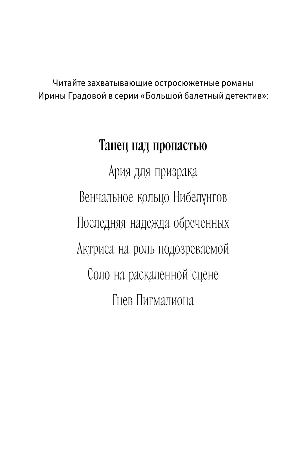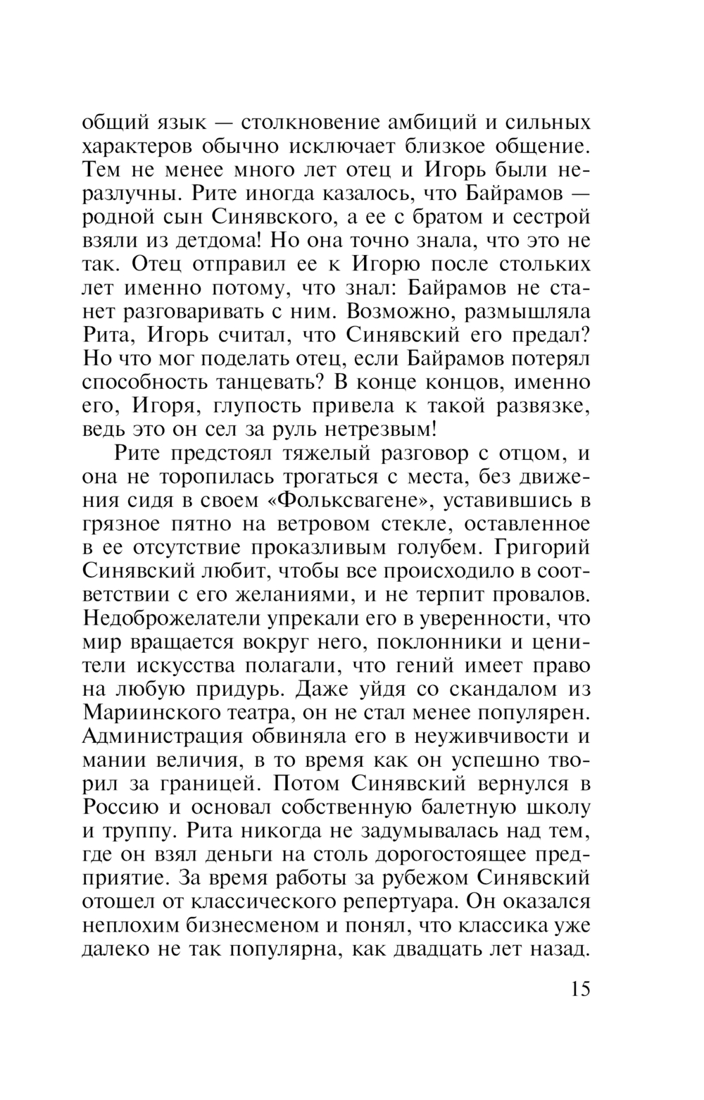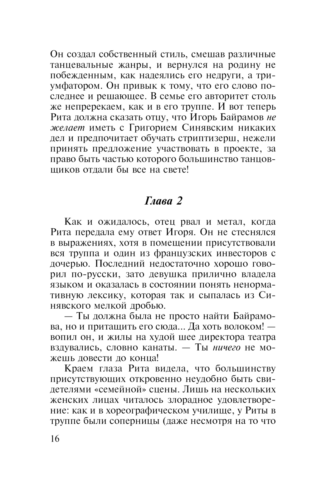 Отец никогда не любил Риту. Главной любовью знаменитого балетмейстера Синявского всегда оставался его театр – "Гелиос". А Рита скорее была его самым большим разочарованием, о чем отец не уставал ей напоминать. Как девушка ни старалась, она так ни разу и не смогла угодить отцу. Она надеялась, что это получится сделать хотя бы теперь, выполнив задание Синявского – привести в труппу его бывшего ученика Игоря Байрамова, с которым восемь лет назад отец крупно поссорился. Но судя по всему, сделать это будет не так-то просто, ведь между этими двоими существует какая-то темная тайна, вспоминать о которой неприятно обоим...