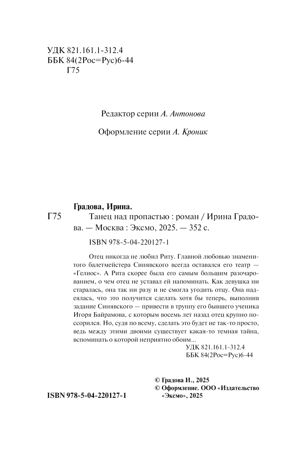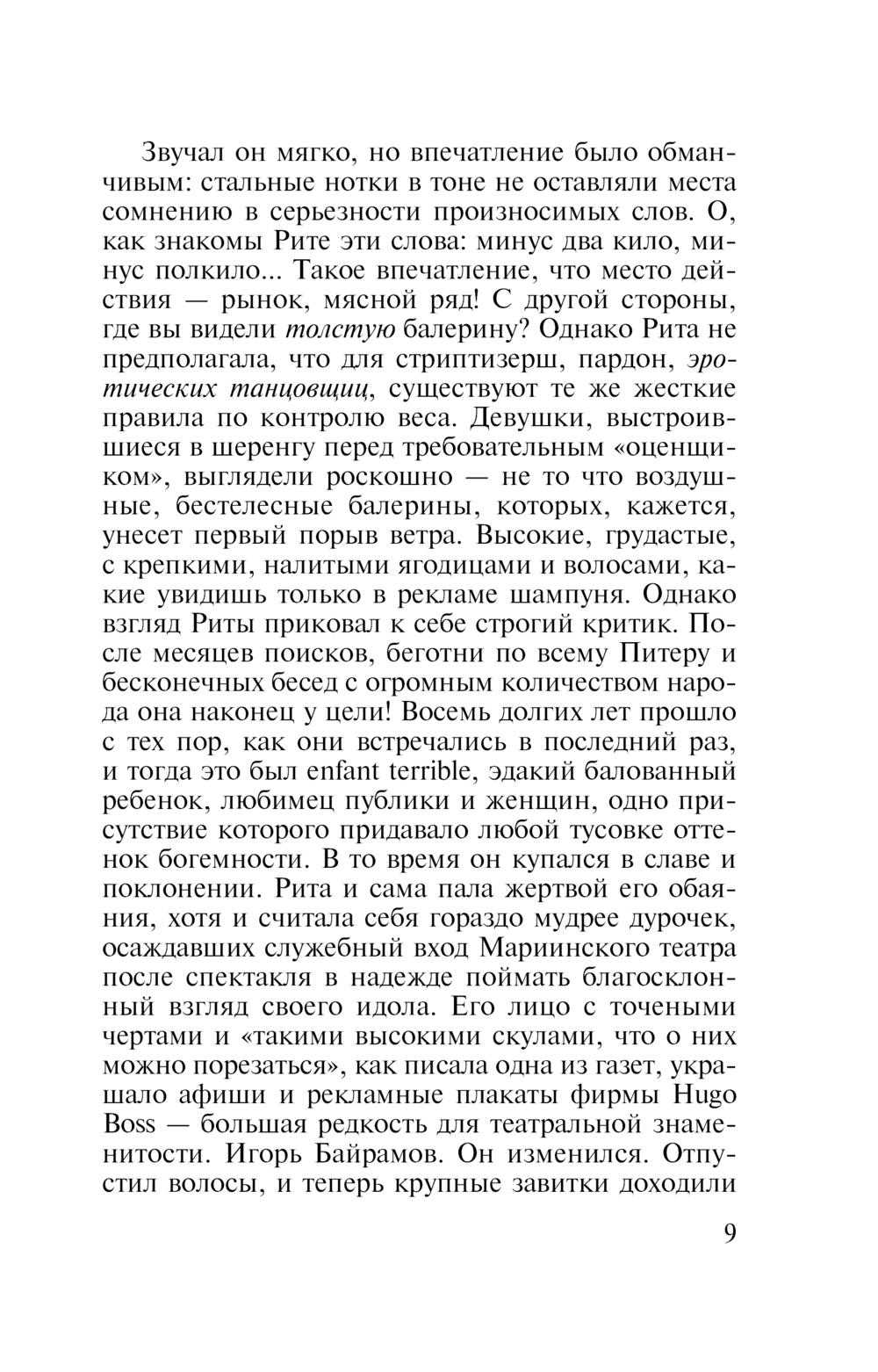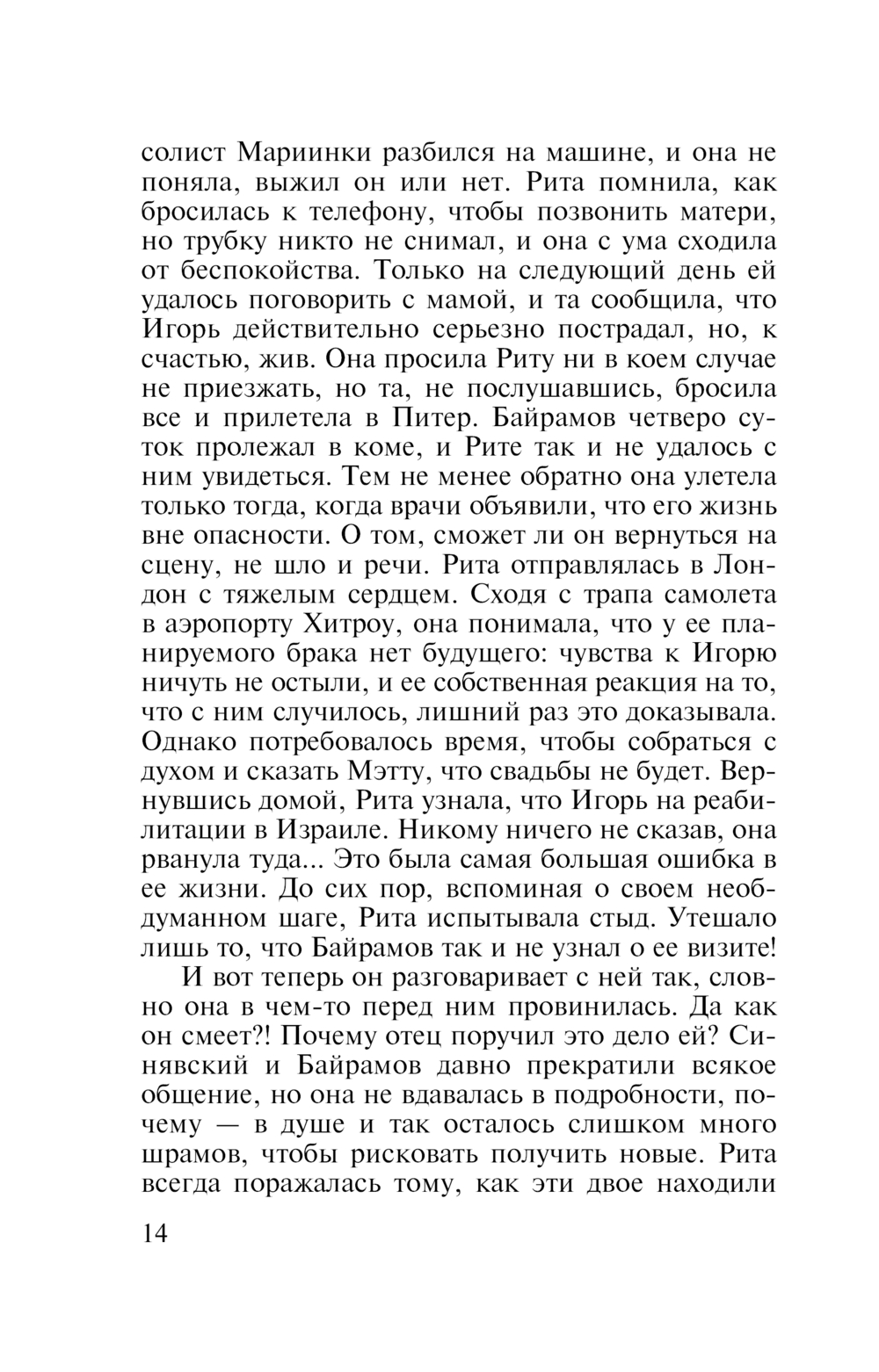 Отец никогда не любил Риту. Главной любовью знаменитого балетмейстера Синявского всегда оставался его театр – "Гелиос". А Рита скорее была его самым большим разочарованием, о чем отец не уставал ей напоминать. Как девушка ни старалась, она так ни разу и не смогла угодить отцу. Она надеялась, что это получится сделать хотя бы теперь, выполнив задание Синявского – привести в труппу его бывшего ученика Игоря Байрамова, с которым восемь лет назад отец крупно поссорился. Но судя по всему, сделать это будет не так-то просто, ведь между этими двоими существует какая-то темная тайна, вспоминать о которой неприятно обоим...