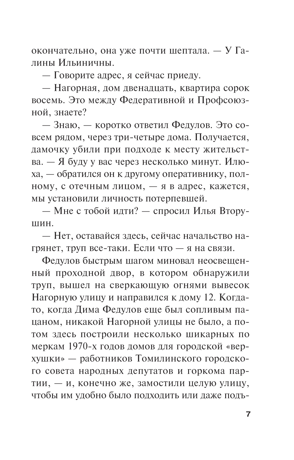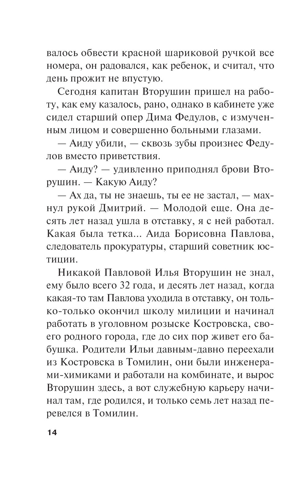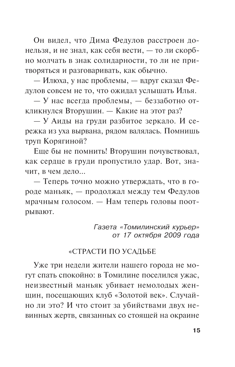 Разбитое зеркальце на груди, сережка, вырванная из уха – своеобразная "визитная карточка" убийцы. Кто убил этих двух почтенных женщин – маньяк, одержимый мрачноватыми легендами рода Вяземских, или его изощренный имитатор? Все версии неизменно заходят в тупик. Бизнесмен, чьи начинания в связи с этими преступлениями находятся под угрозой, решил прибегнуть к помощи частного детектива. Так Анастасия Каменская оказалась в провинциальном Томилине. Да-да, полковник милиции в отставке Каменская теперь работает в частном детективном агентстве, и это расследование – ее дебют на данном поприще. Теперь за её спиной нет могущественного и влиятельного ведомства, и это как-то непривычно. Но от Насти по-прежнему требуется ее умение разговаривать и слушать, систематизировать факты, интуитивно – а это есть вершина ее "сыскного таланта" – выбирать верное направление поисков. Словом, открывать все двери, которые встречаются на ее пути. Ведь за одной из них находится истина. Она-то неподвластна никаким переменам.