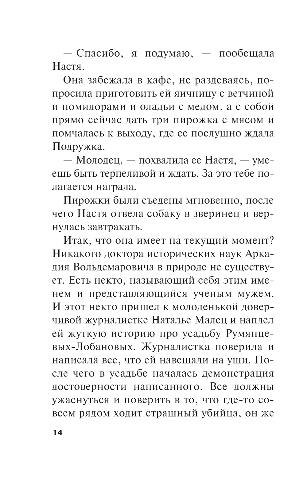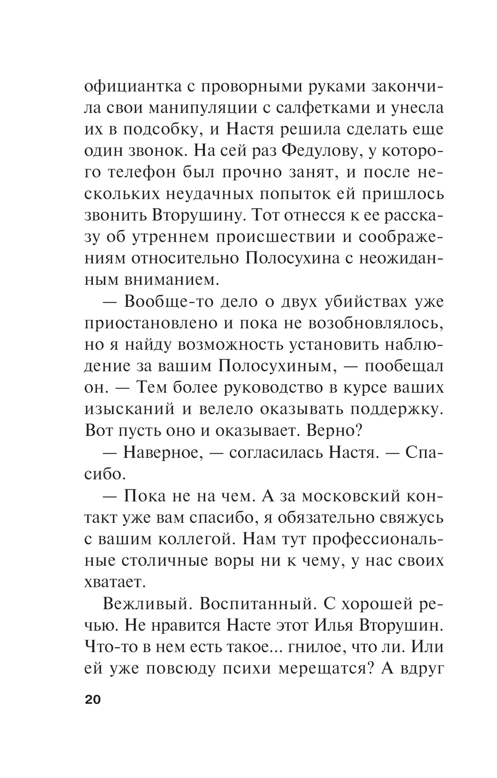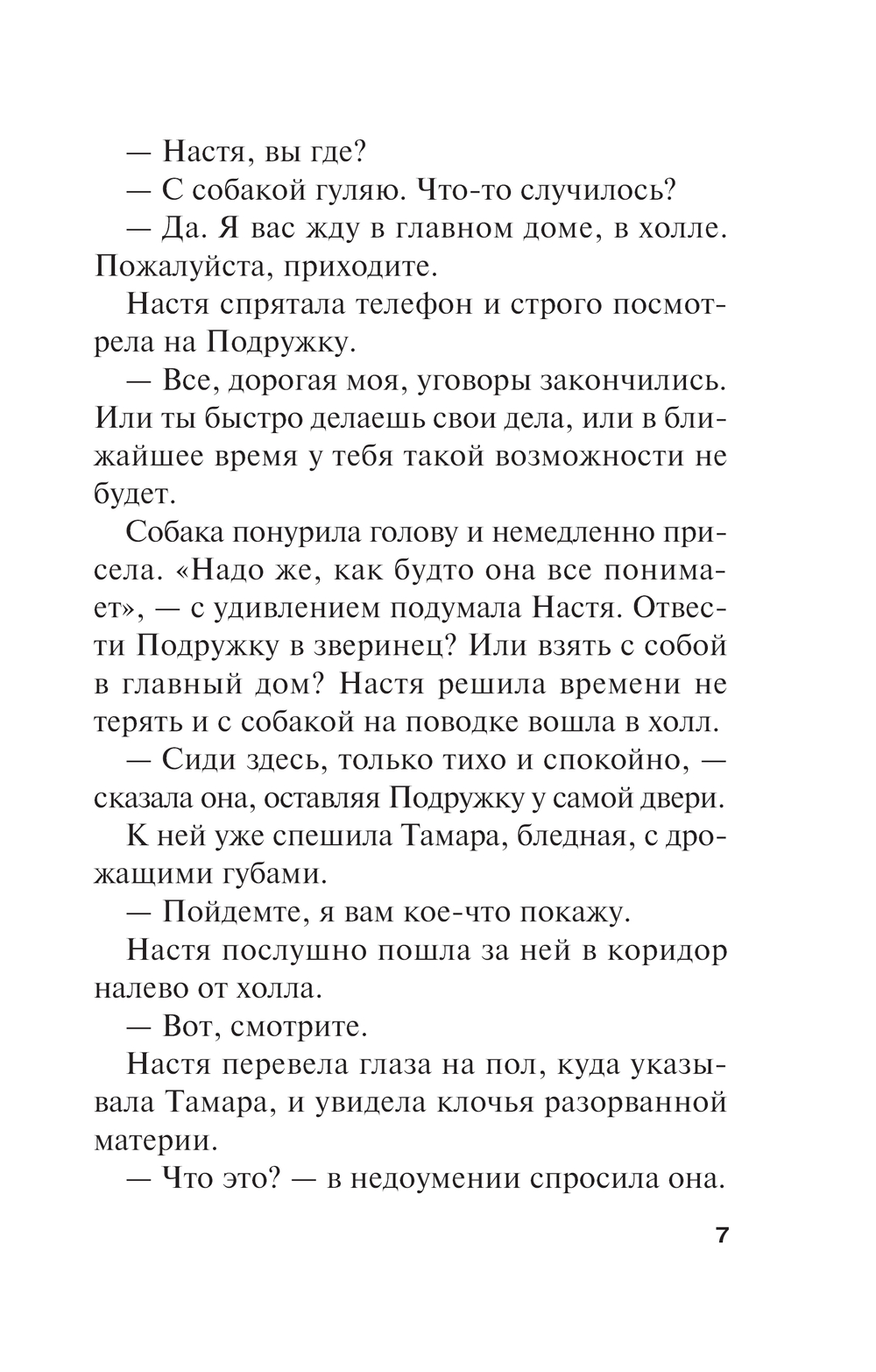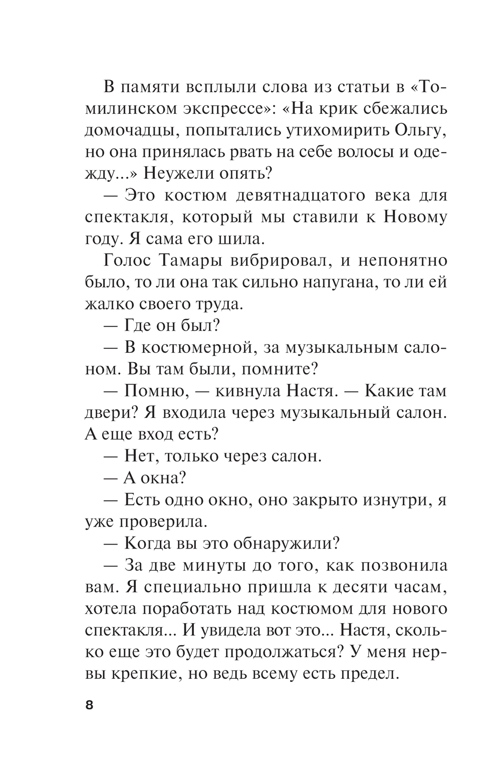 Разбитое зеркальце на груди, сережка, вырванная из уха – своеобразная "визитная карточка" убийцы. Кто убил этих двух почтенных женщин – маньяк, одержимый мрачноватыми легендами рода Вяземских, или его изощренный имитатор? Все версии неизменно заходят в тупик. Бизнесмен, чьи начинания в связи с этими преступлениями находятся под угрозой, решил прибегнуть к помощи частного детектива. Так Анастасия Каменская оказалась в провинциальном Томилине. Да-да, полковник милиции в отставке Каменская теперь работает в частном детективном агентстве, и это расследование – ее дебют на данном поприще. Теперь за её спиной нет могущественного и влиятельного ведомства, и это как-то непривычно. Но от Насти по-прежнему требуется ее умение разговаривать и слушать, систематизировать факты, интуитивно – а это есть вершина ее "сыскного таланта" – выбирать верное направление поисков. Словом, открывать все двери, которые встречаются на ее пути. Ведь за одной из них находится истина. Она-то неподвластна никаким переменам.
