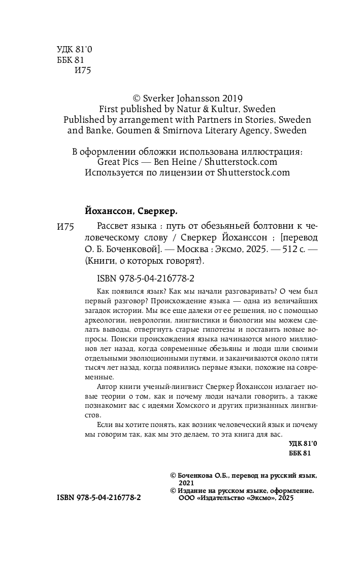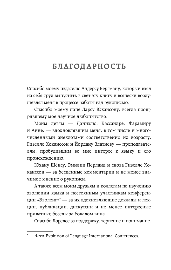 Автор книги ученый-лингвист Сверкер Йоханссон излагает новые теории о том, как и почему люди начали говорить, а также познакомит вас с идеями Хомского и других признанных лингвистов.