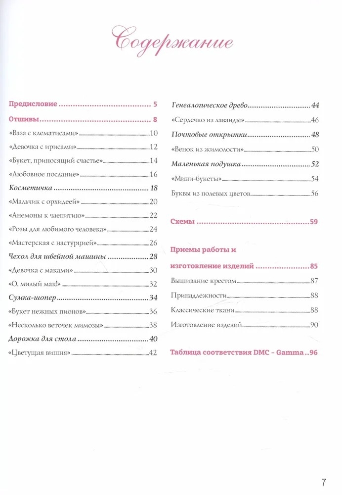 Все отшивы сопровождаются цветными схемами. В конце книги представлены подробные пошаговые инструкции по выполнению готовых изделий, а также справочная информация, которая позволит подобрать мулине в любом магазине
