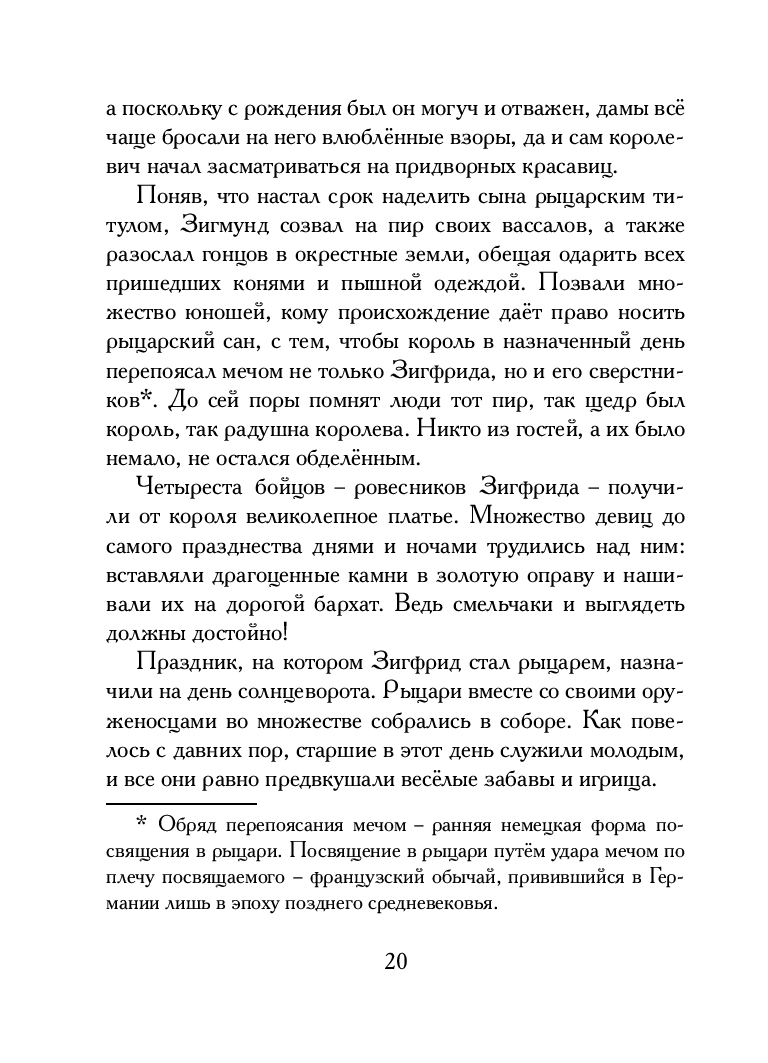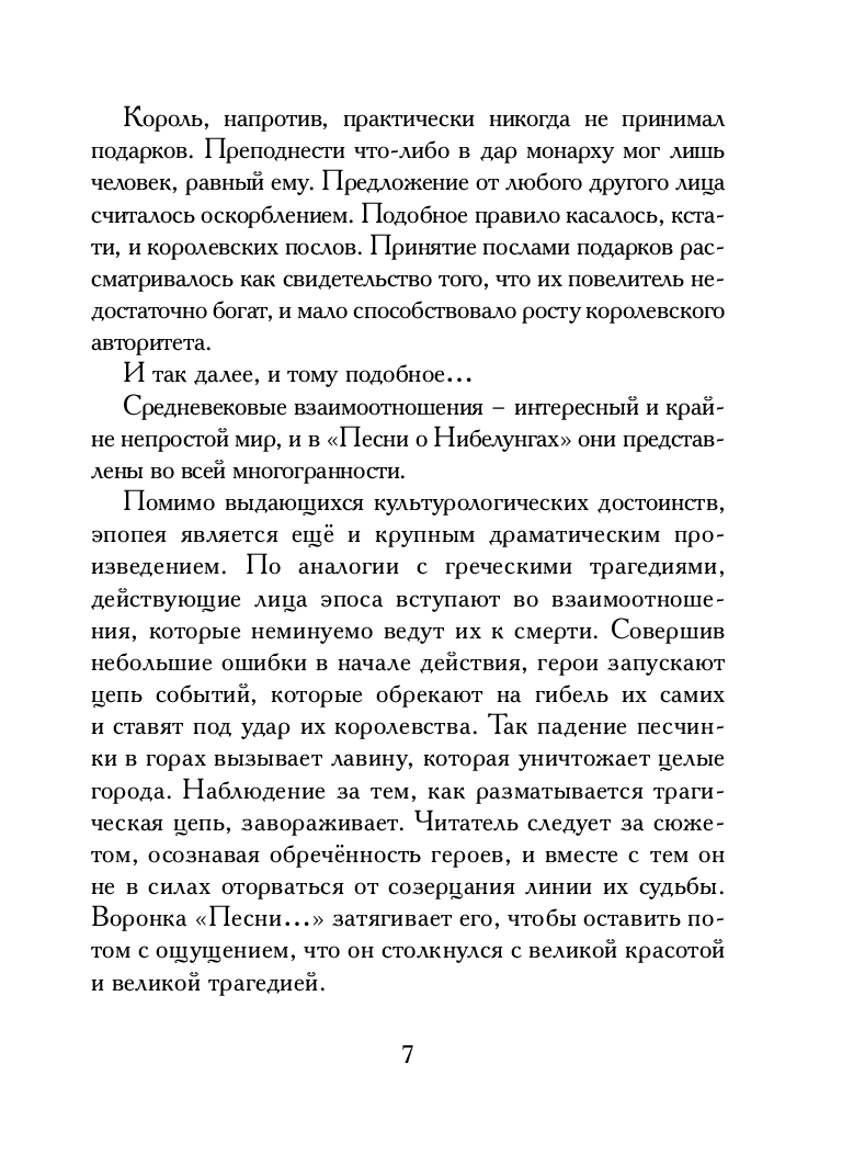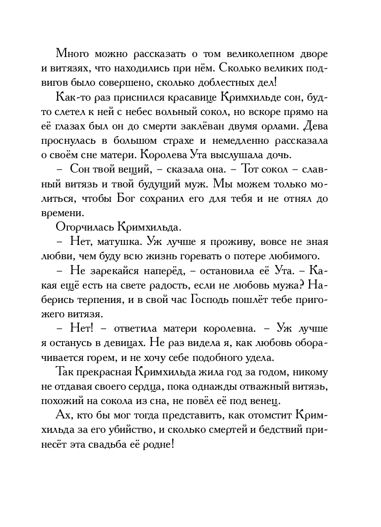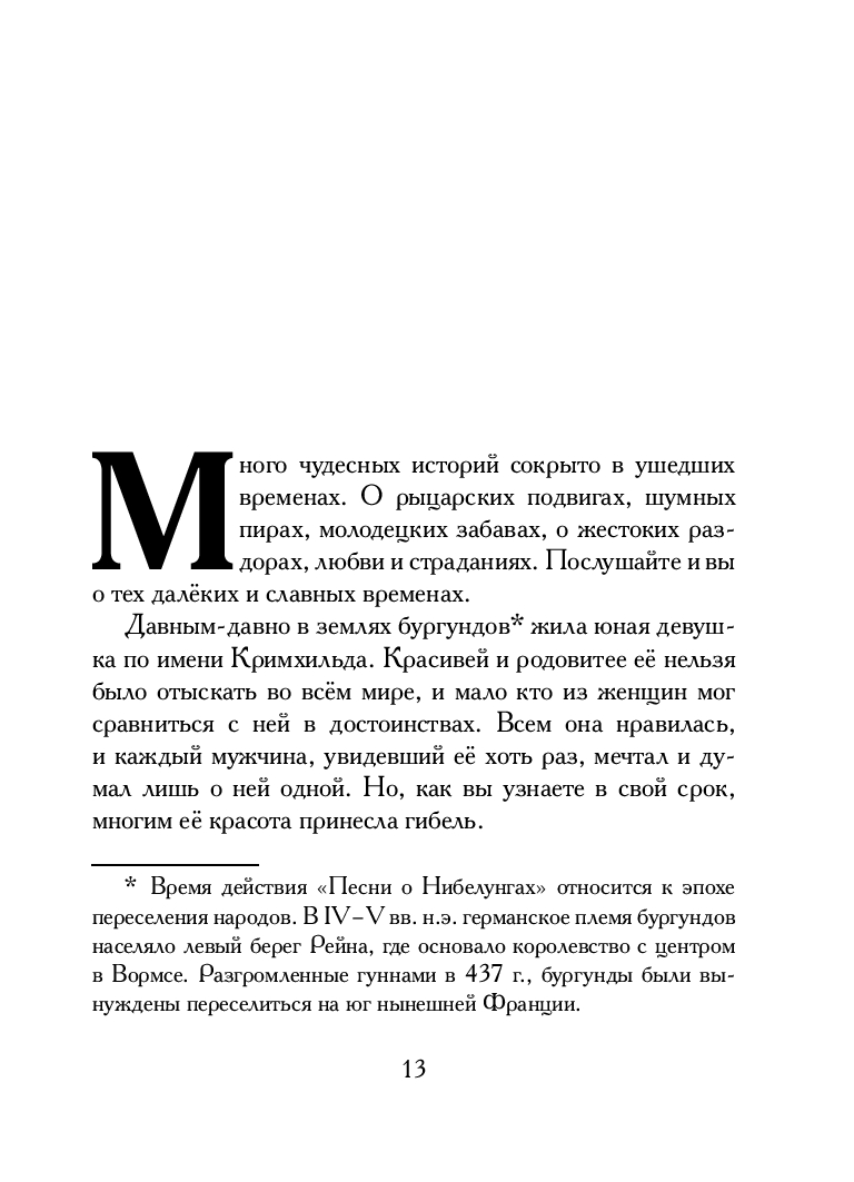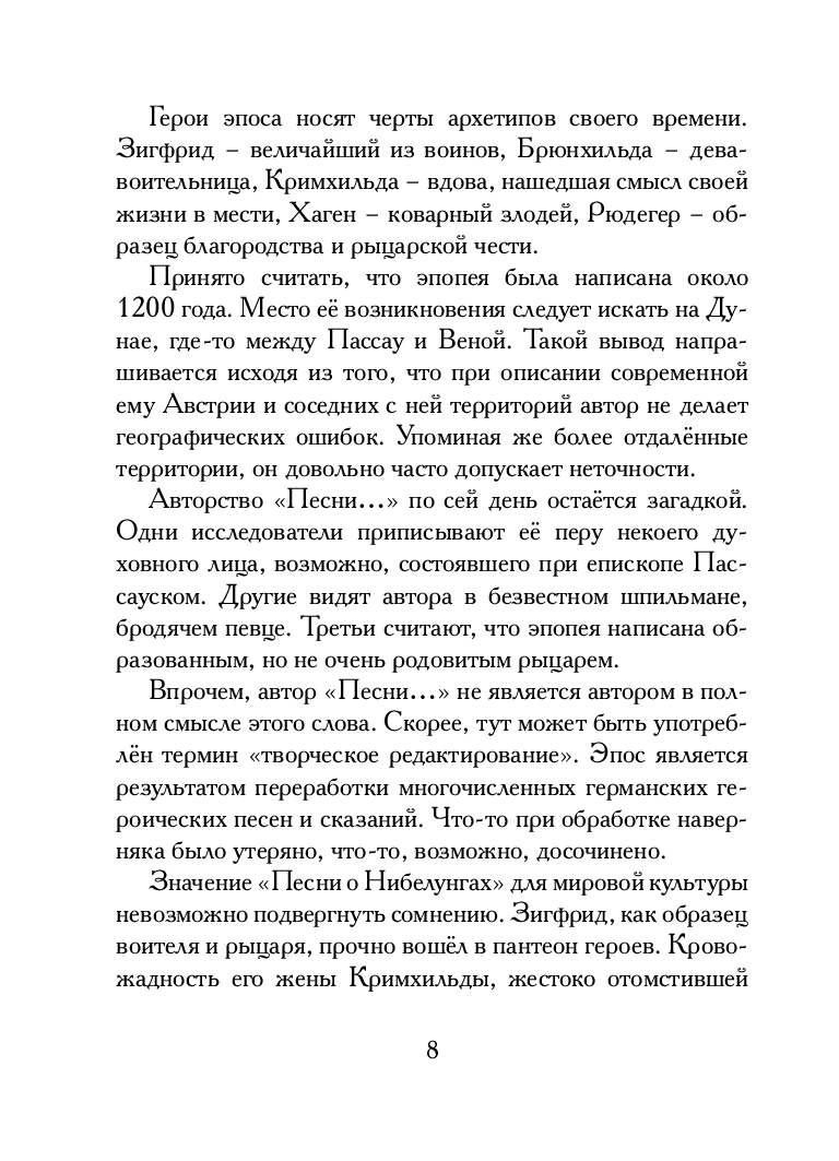 В число этих книг, несомненно, входит и средневековый германский эпос "Песнь о Нибелунгах". Насыщенный сюжет, суровые и страстные характеры героев, великая красота и великая трагедия не оставят равнодушными ни одного читателя.