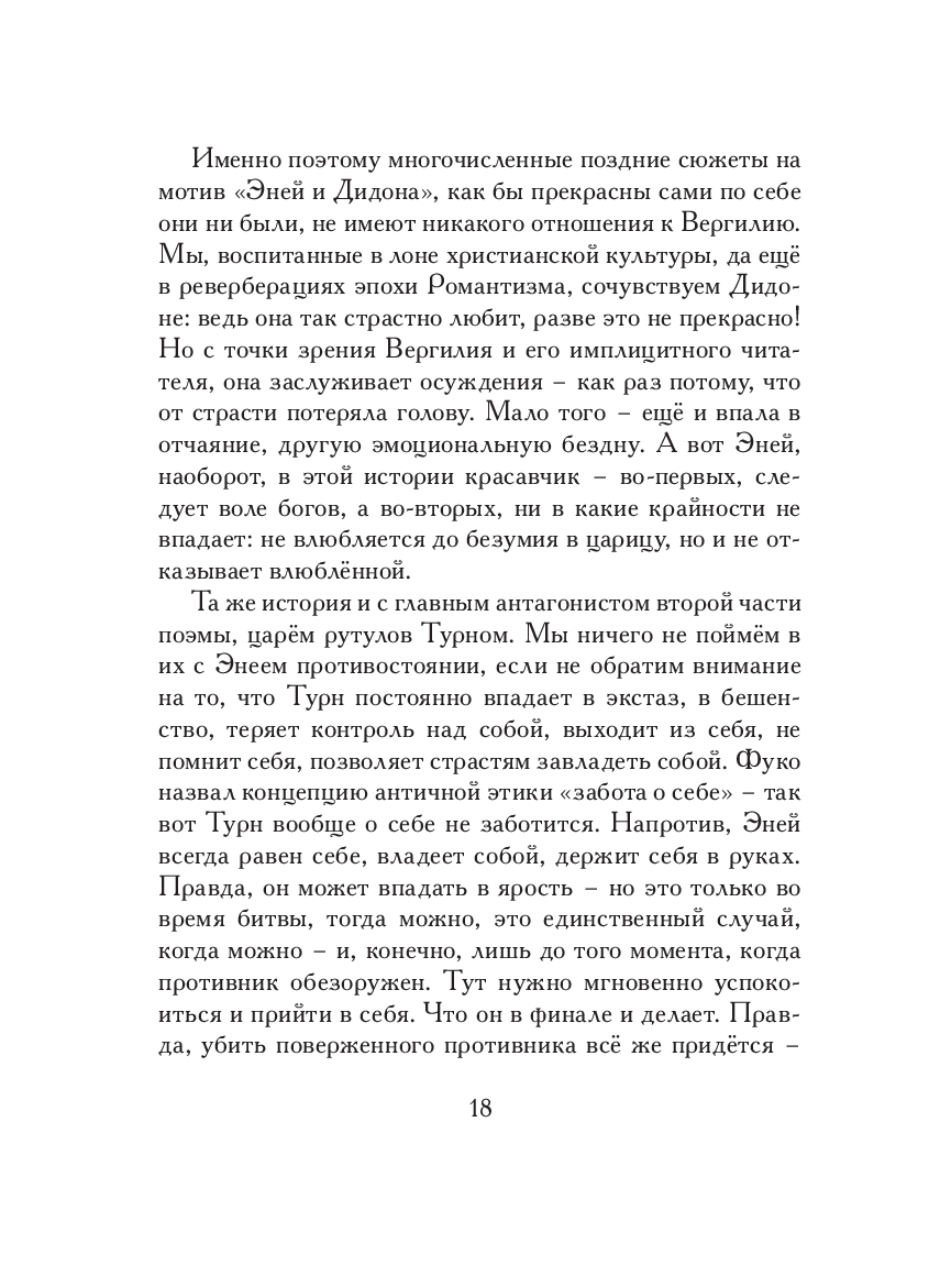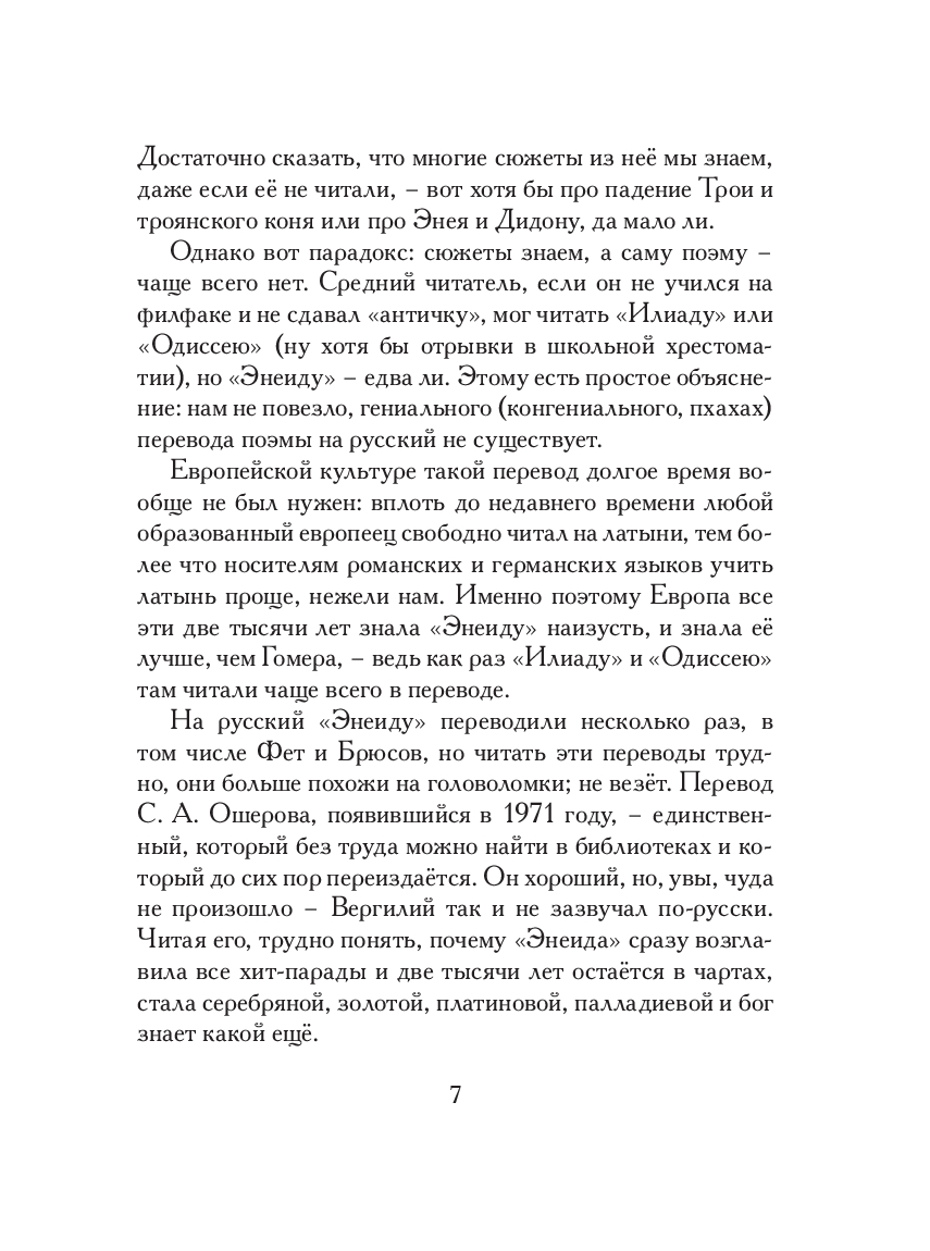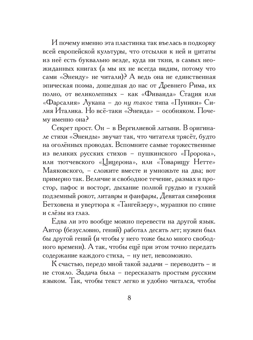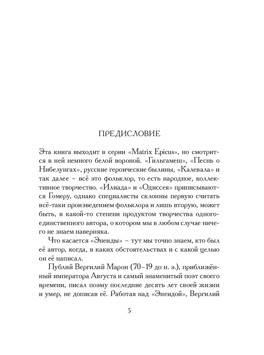 "Энеида" – главнейшее литературное достояние Римской империи. Падение Трои, история любви Энея и Дидоны, путешествие троянцев по полному опасных чудовищ Средиземному морю, посещение героем царства мёртвых, эпохальные битвы армий, распри коварных богов, картины будущего величия Рима и многое, многое другое – всё это составляет невиданное по размаху эпическое полотно, равного которому не выходило из-под пера поэта в Античности.