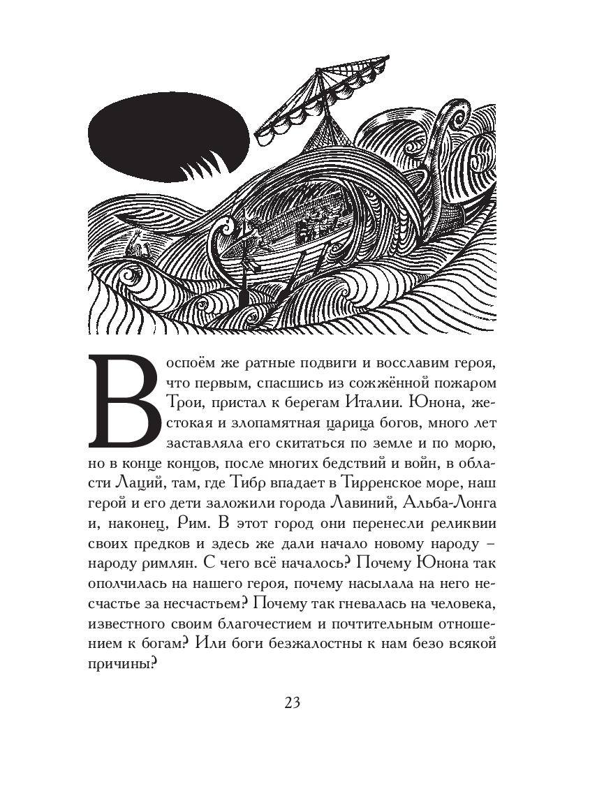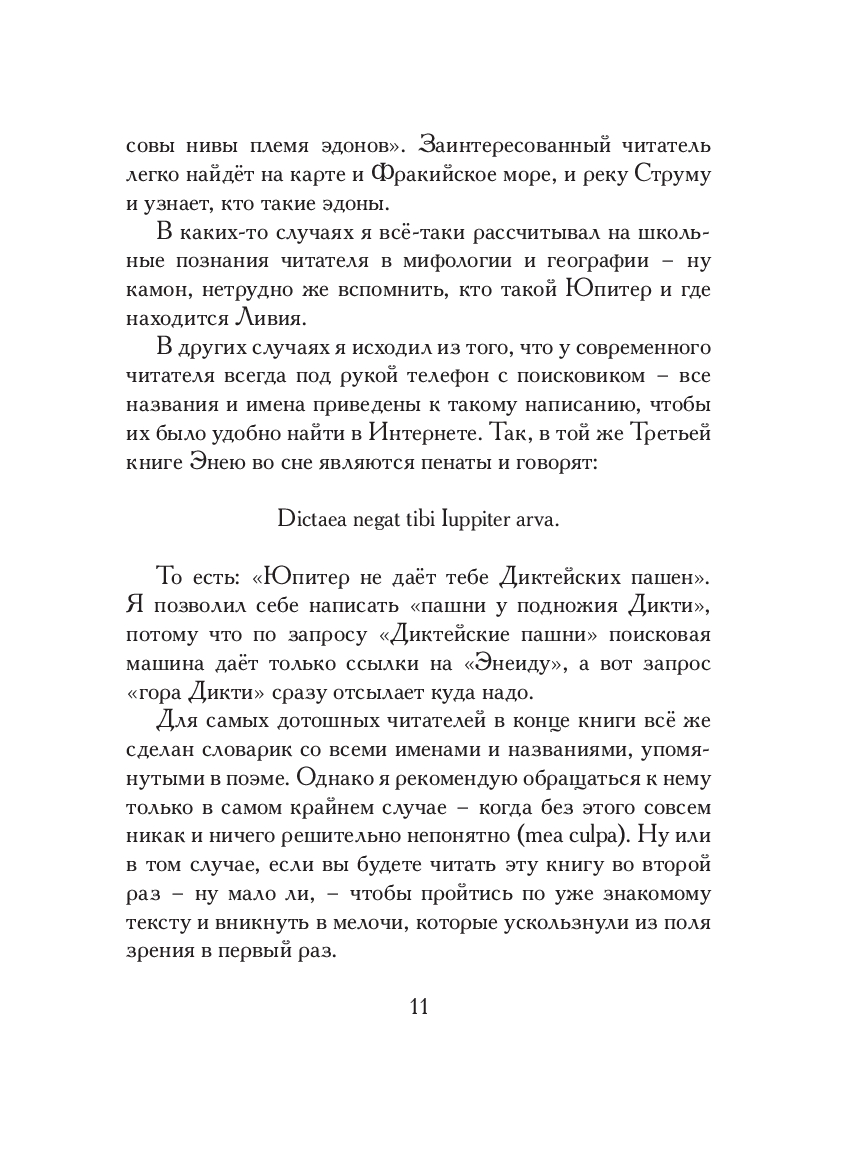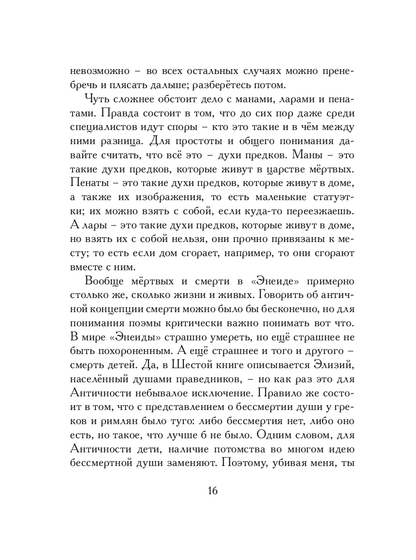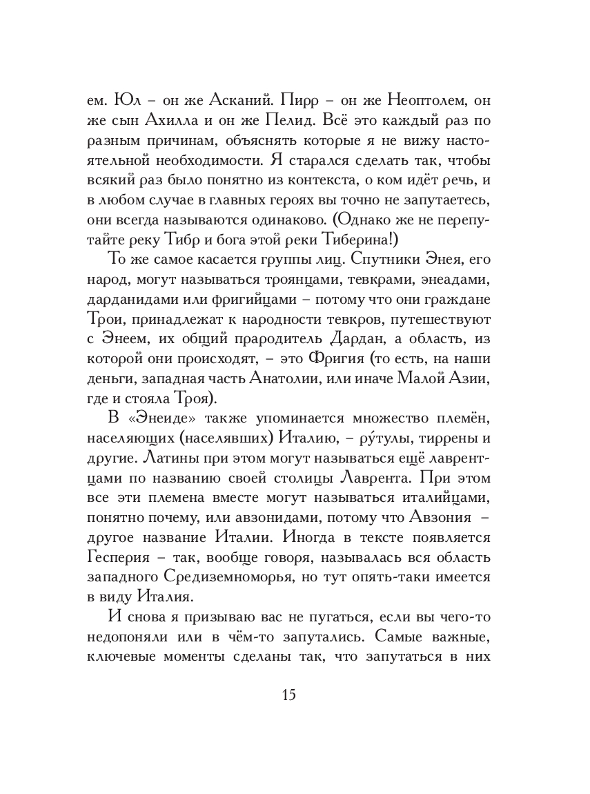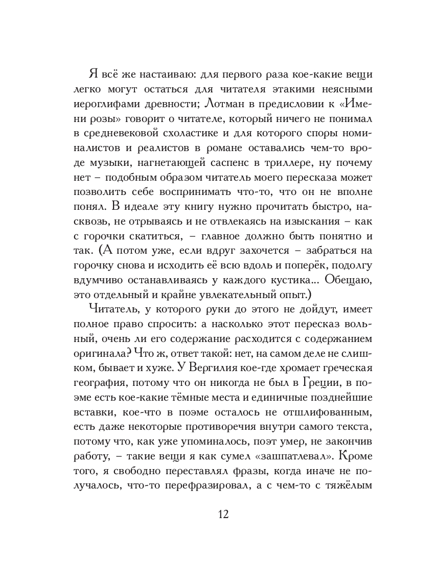 "Энеида" – главнейшее литературное достояние Римской империи. Падение Трои, история любви Энея и Дидоны, путешествие троянцев по полному опасных чудовищ Средиземному морю, посещение героем царства мёртвых, эпохальные битвы армий, распри коварных богов, картины будущего величия Рима и многое, многое другое – всё это составляет невиданное по размаху эпическое полотно, равного которому не выходило из-под пера поэта в Античности.