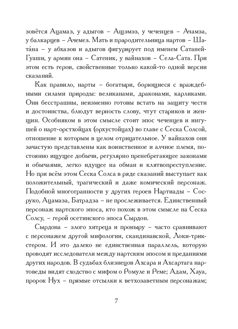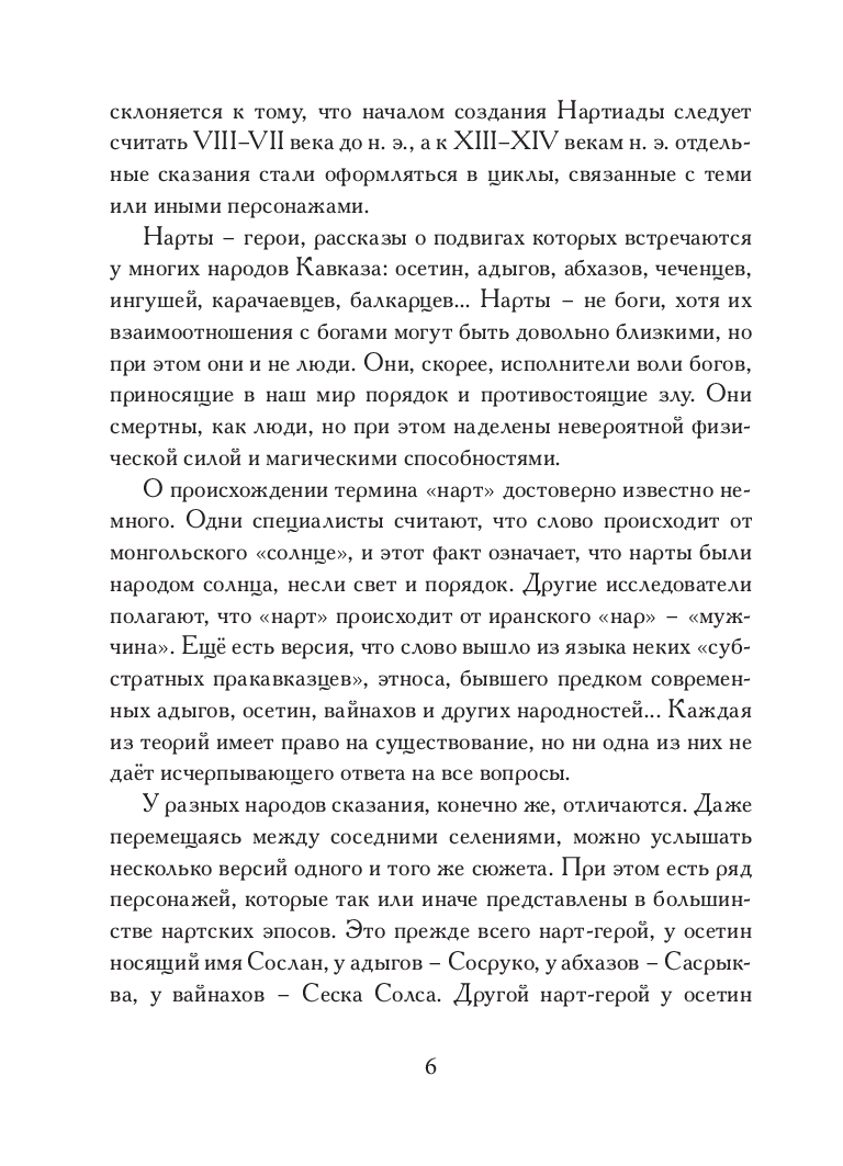 Многоцветие жанров Нартиады приводит в изумление: истории о подвигах и жертвенности, о любви и ненависти, байки о мудрецах и плутах, космогонические мифы и т. д. Корни этих историй уходят вглубь тысячелетий, но приглядитесь – всё здесь живое, всё трепещет, играет, искрится…