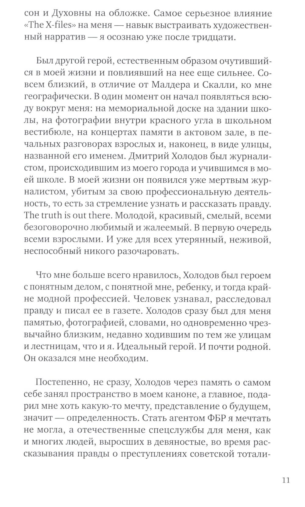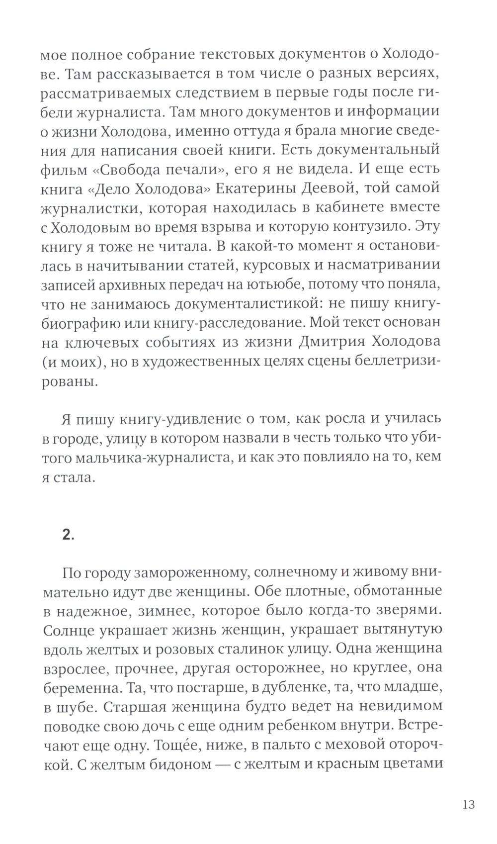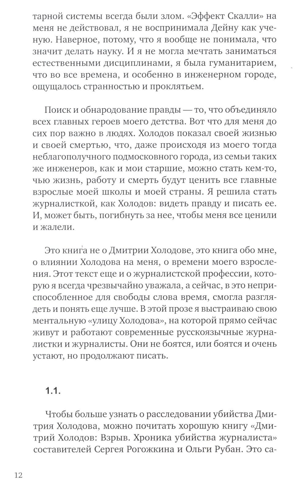 Эта книга – личный проект писательницы Евгении Некрасовой, которая выросла в одном городе с Холодовым и училась в той же школе, что и он. Она возвращается к хроникам девяностых, общается с коллегами Дмитрия и рассуждает, как фигура Холодова повлияла на ее понимание свободы.