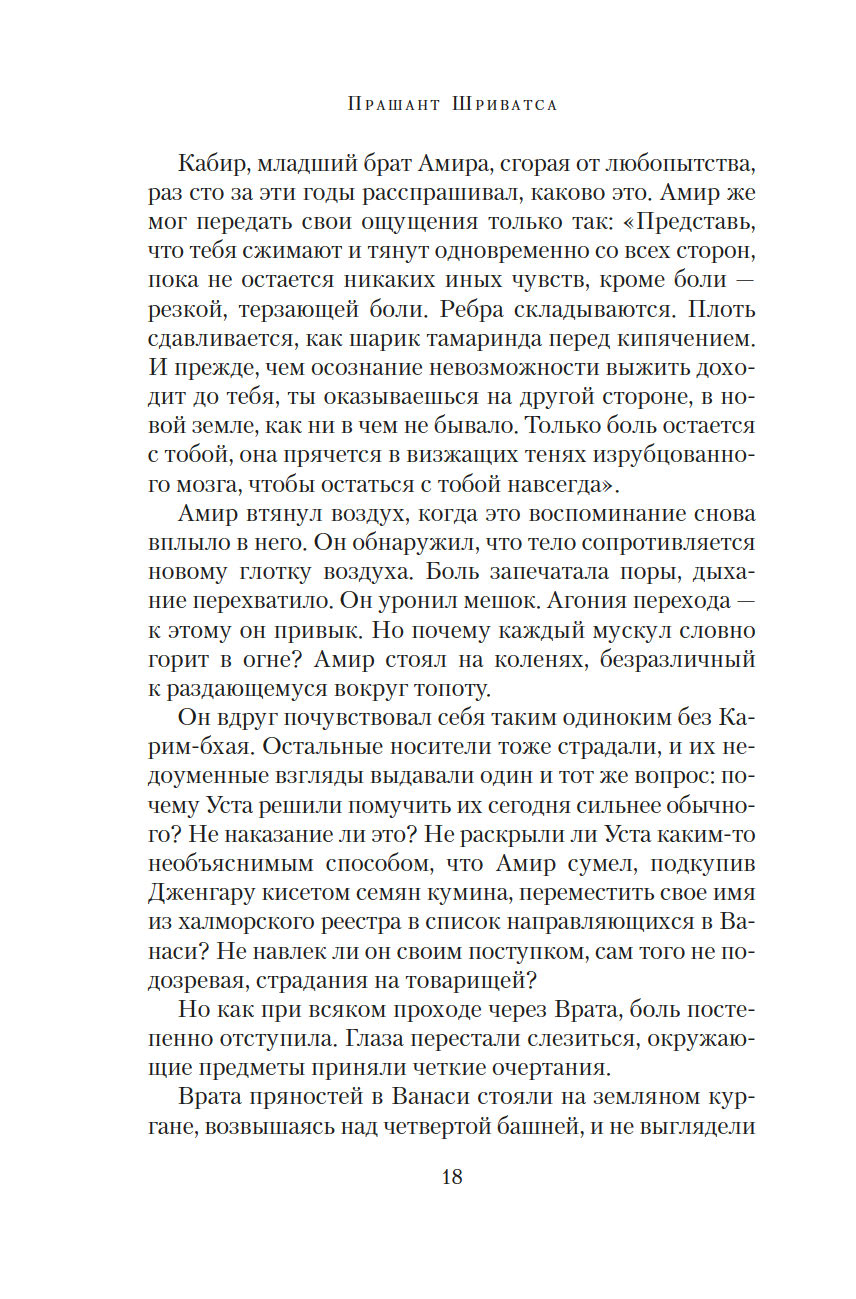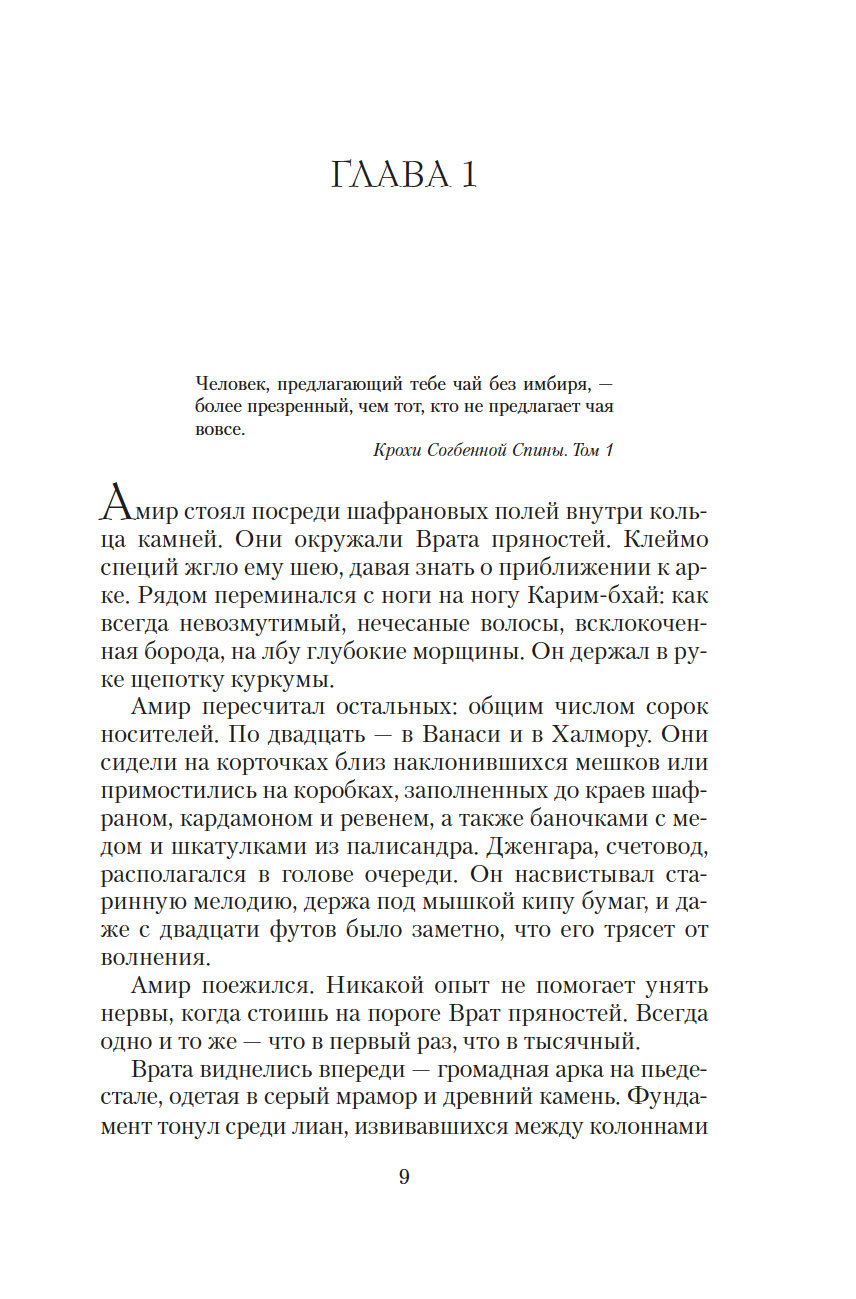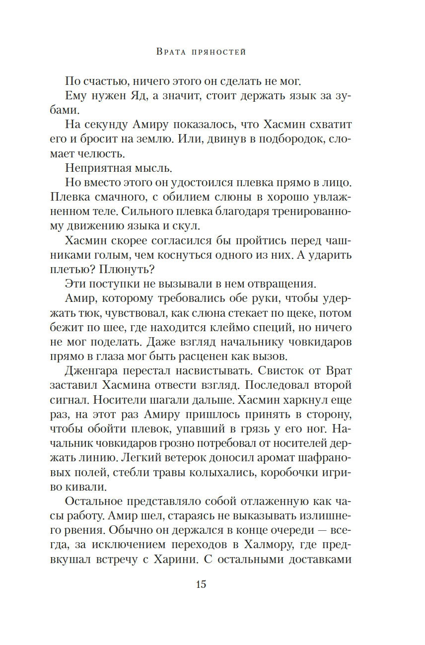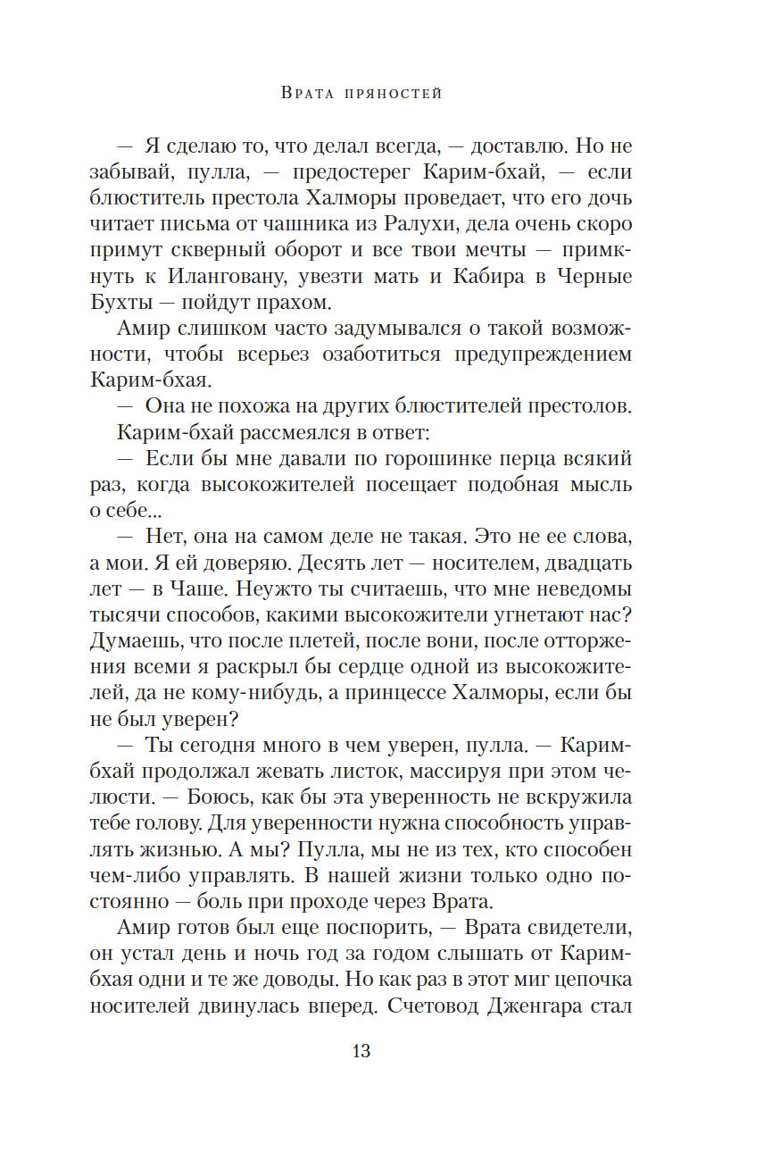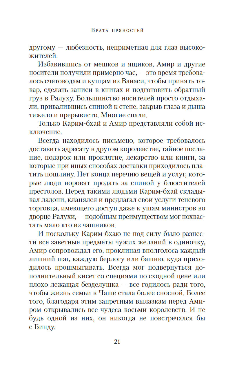 Врата пряностей – чудесный портал, соединяющий восемь королевств. В каждом из них выращивают только одну специю, но не могут обойтись без остальных. Поэтому в торговле пряностями заинтересованы все – воины, жрецы, убийцы, блюстители престолов... Однако пройти через Врата могут только люди с врожденной меткой, и это вовсе не является привилегией. Их называют носителями, они принадлежат к низшей касте, презираемой и живущей в нищете. Проход через Врата всегда причиняет страдания, но неужели плата за неведомые грехи прошлых воплощений так высока?.. Вырваться из жестокой кабалы и увезти своих родных на далекий остров мечтает молодой носитель Амир. В попытках осуществить свой дерзкий план он невольно впутывается в заговор, который может навсегда изменить хрупкое равновесие между королевствами...
