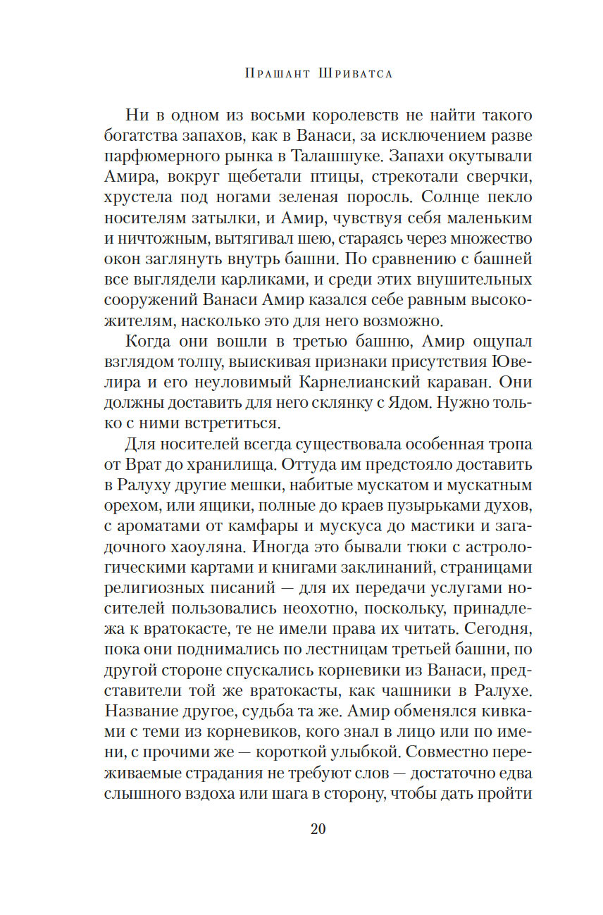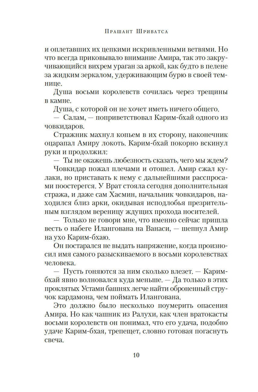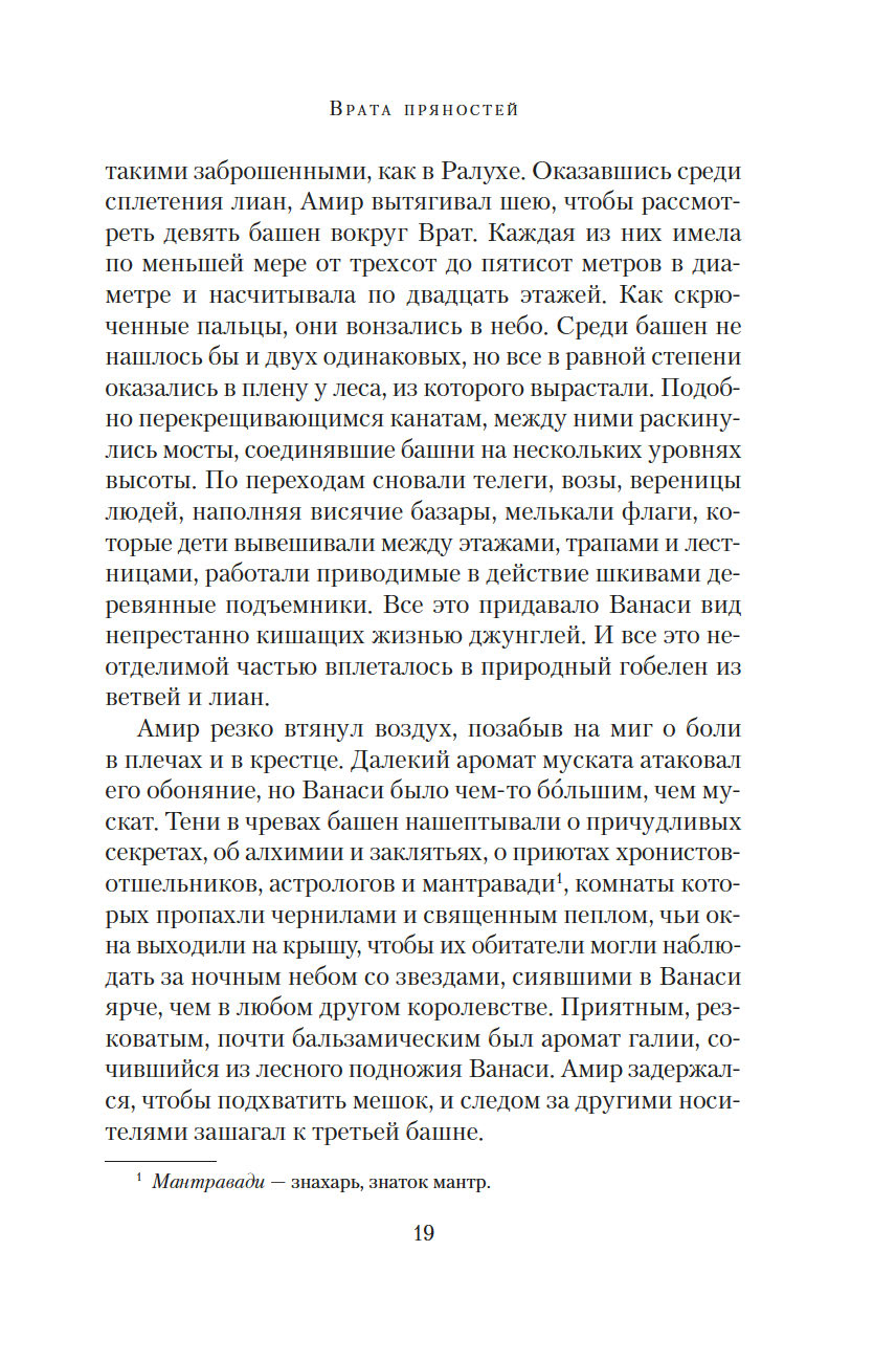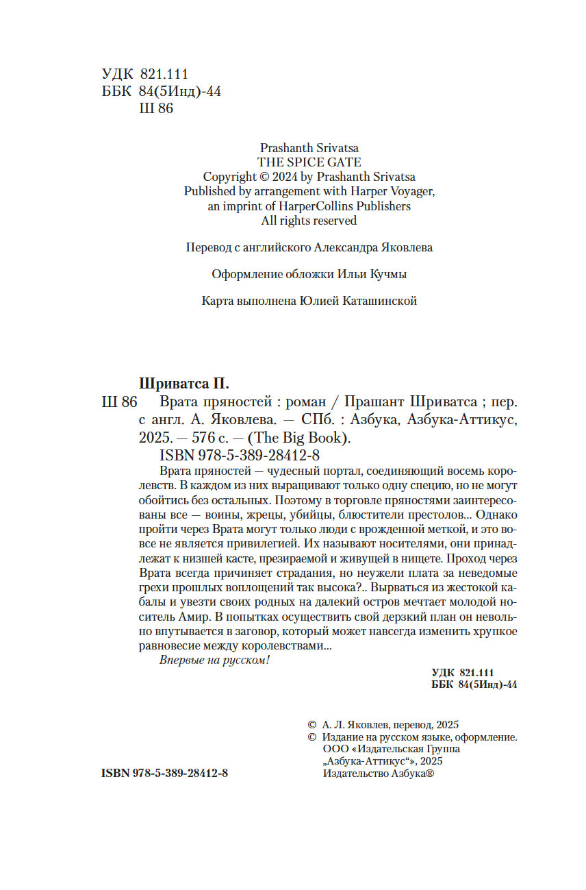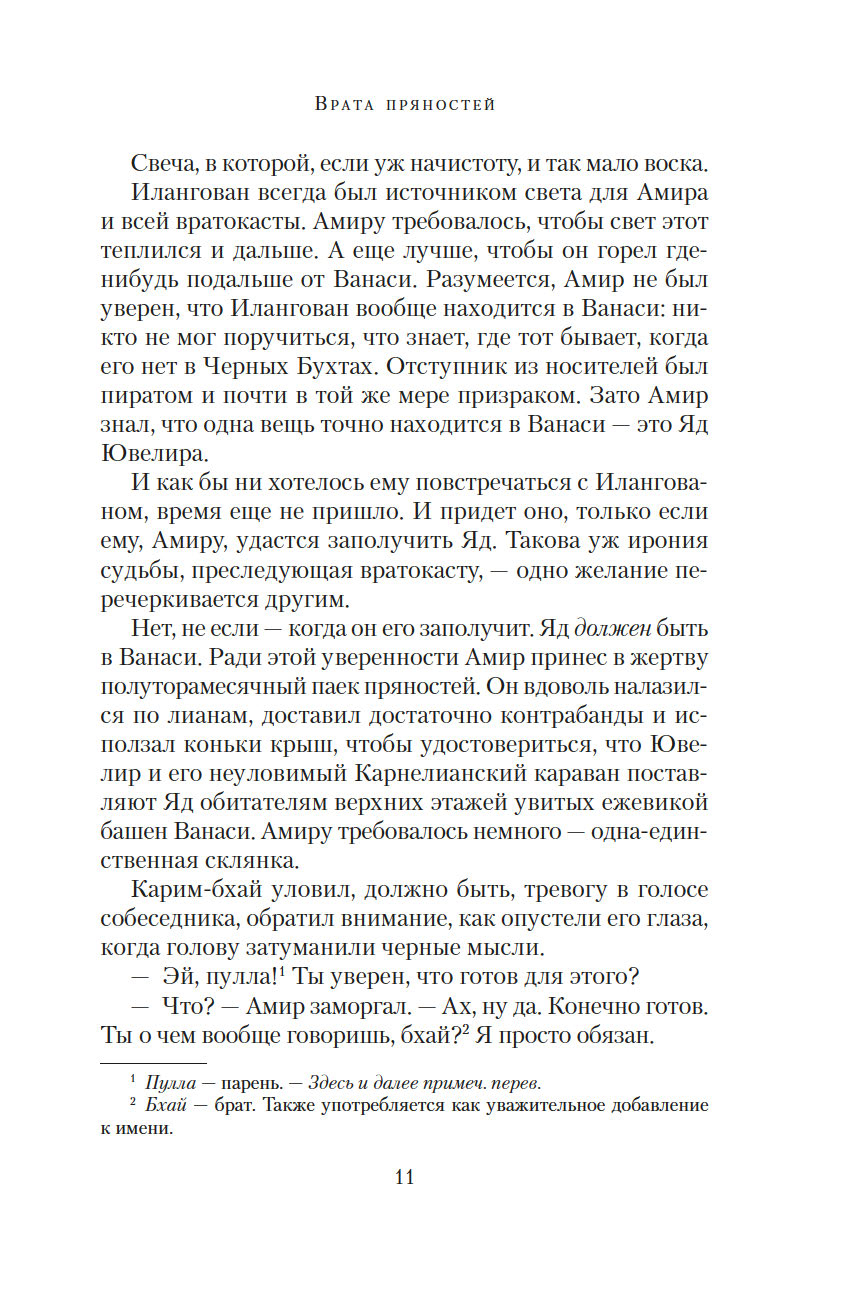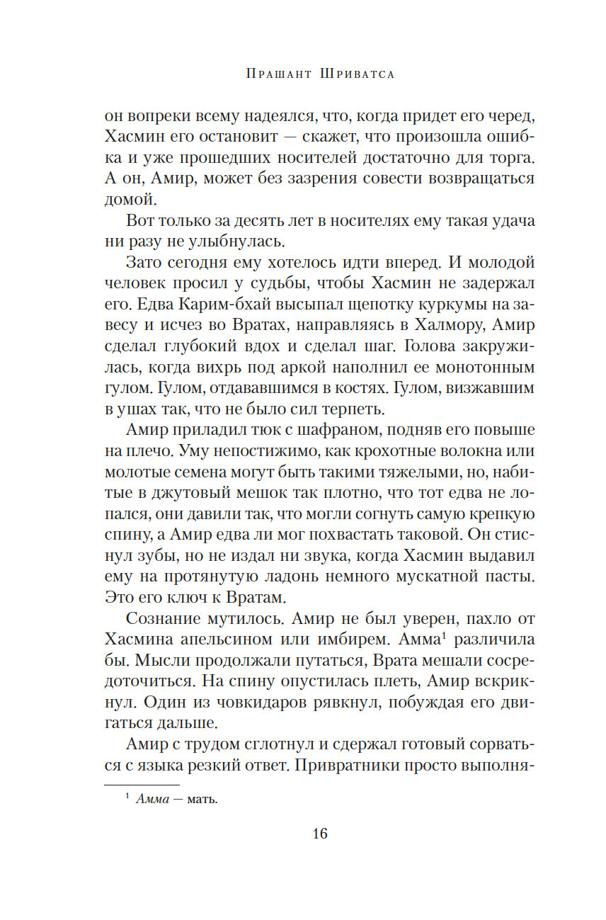 Врата пряностей – чудесный портал, соединяющий восемь королевств. В каждом из них выращивают только одну специю, но не могут обойтись без остальных. Поэтому в торговле пряностями заинтересованы все – воины, жрецы, убийцы, блюстители престолов... Однако пройти через Врата могут только люди с врожденной меткой, и это вовсе не является привилегией. Их называют носителями, они принадлежат к низшей касте, презираемой и живущей в нищете. Проход через Врата всегда причиняет страдания, но неужели плата за неведомые грехи прошлых воплощений так высока?.. Вырваться из жестокой кабалы и увезти своих родных на далекий остров мечтает молодой носитель Амир. В попытках осуществить свой дерзкий план он невольно впутывается в заговор, который может навсегда изменить хрупкое равновесие между королевствами...