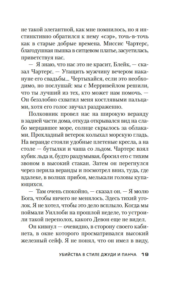 Роман "Убийства в стиле Джуди и Панча" продолжает серию о великолепном сэре Генри Мерривейле – обаятельном, взбалмошном толстяке, ставшем, по признанию критиков, одним из самых неординарных сыщиков в детективной литературе. Кенвуд Блейк, агент британской секретной службы, накануне собственной свадьбы получает телеграмму от сэра Генри, своего эксцентричного шефа, с требованием срочно выехать из Лондона в Торки по неотложному делу. Зная сумасбродный характер Мерривейла, Кенвуд понимает, что ничего хорошего эта поездка ему не сулит и все наверняка обернется очередной чертовщиной. За Кенвудом в Торки отправляется и невеста…