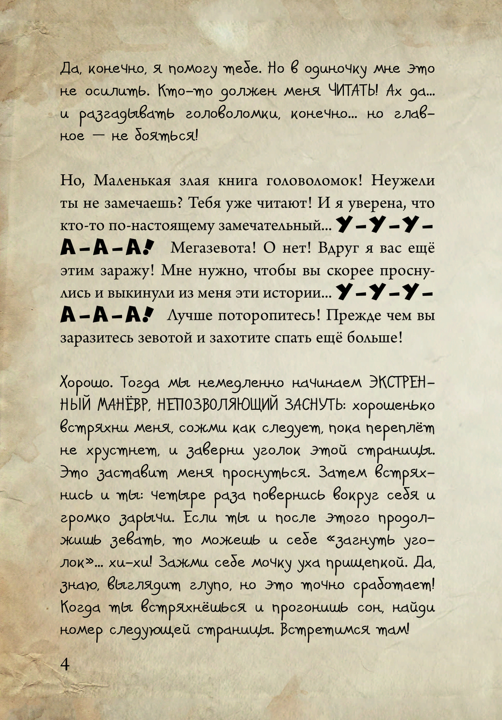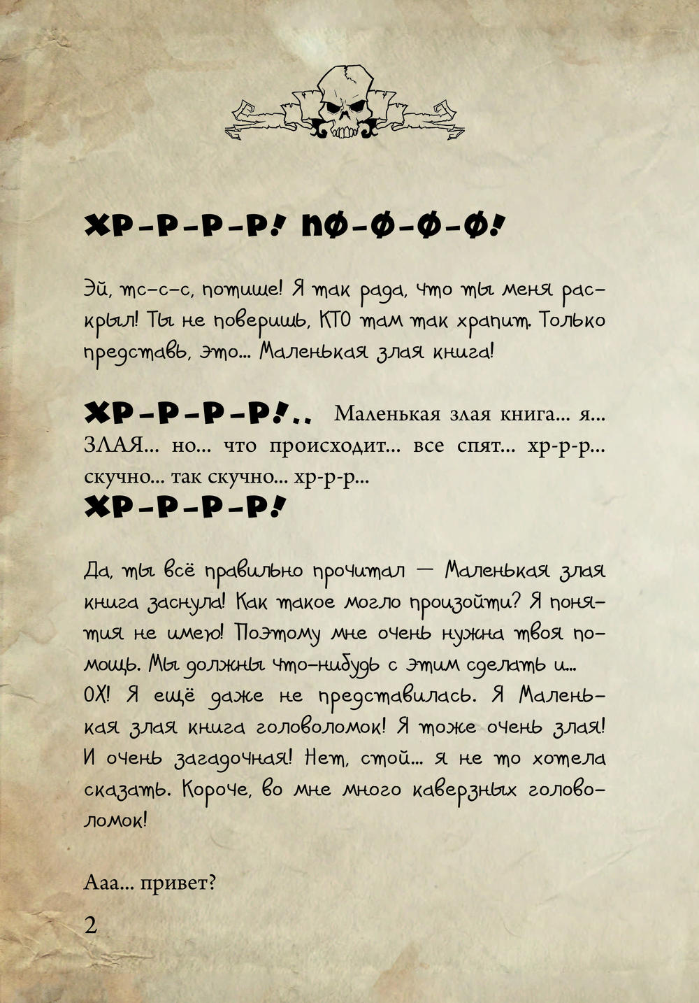 Спасите! Помогите! На связи Маленькая злая книга головоломок! Случилось страшное: кто-то погрузил мою сестрицу – Маленькую злую книгу – в ВЕЧНЫЙ СОН. Не передать словами, что я чувствую, АЖ ЗЛА НЕ ХВАТАЕТ! Кто за этим стоит? Что теперь делать? Если честно, то я в отчаянии… Но мне сказали, что именно ты можешь помочь. Правда ли, что ты умный да ещё к тому же любишь разгадывать головоломки? Тогда нам по пути, если тебя, конечно, не испугают ЗАКОВЫРИСТЫЕ ЗАДАНИЯ, ОПАСНЫЕ ЛАБИРИНТЫ и СЕКРЕТНЫЕ ШИФРЫ. И всё это будет происходить в таких необычных локациях, как, например, ЗАТХЛЫЙ ПОДВАЛ или ОТКРЫТЫЙ КОСМОС! Ох, если тебе тоже не терпится отправиться в НОВОЕ ЗАХВАТЫВАЮЩЕЕ ПРИКЛЮЧЕНИЕ – просто открой книгу!