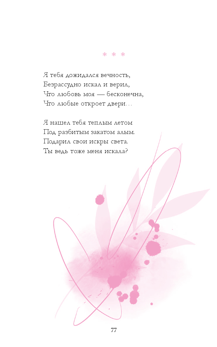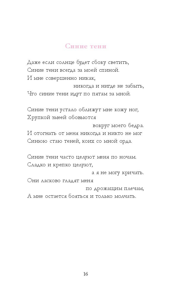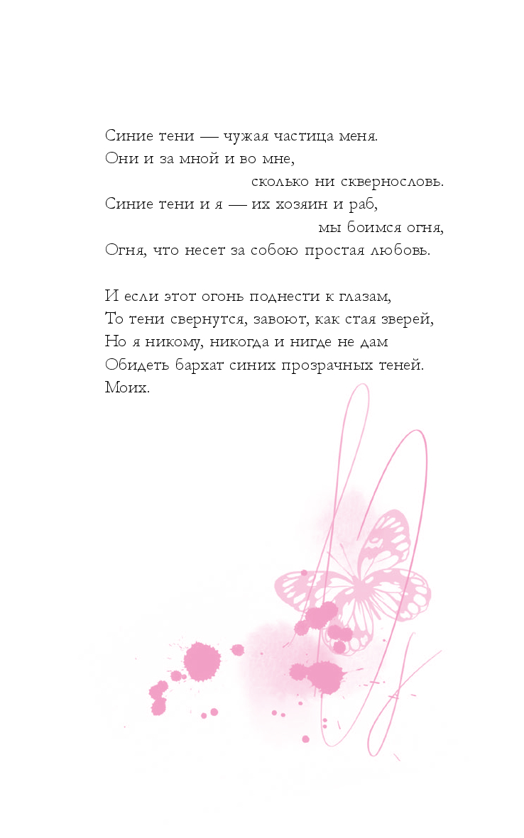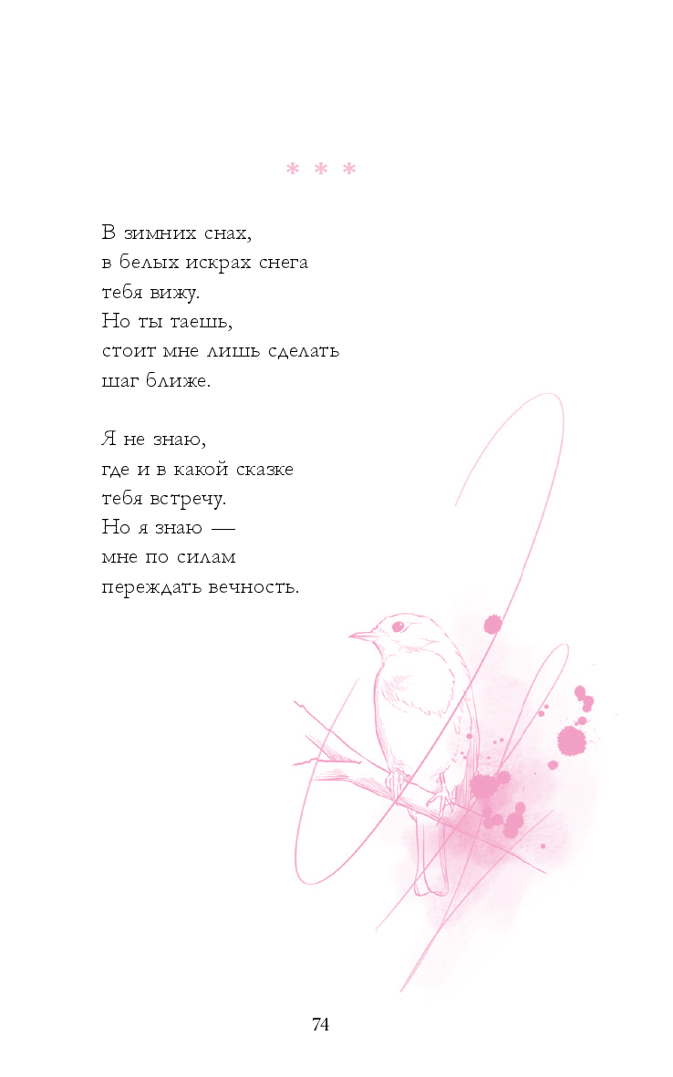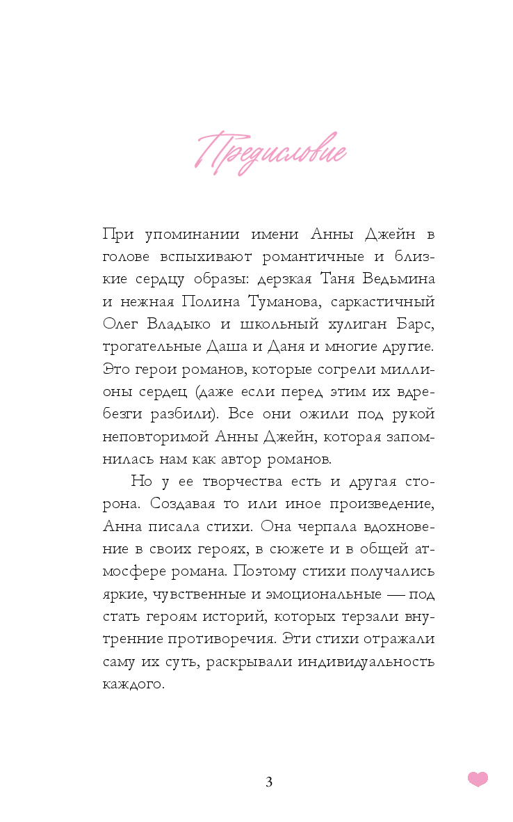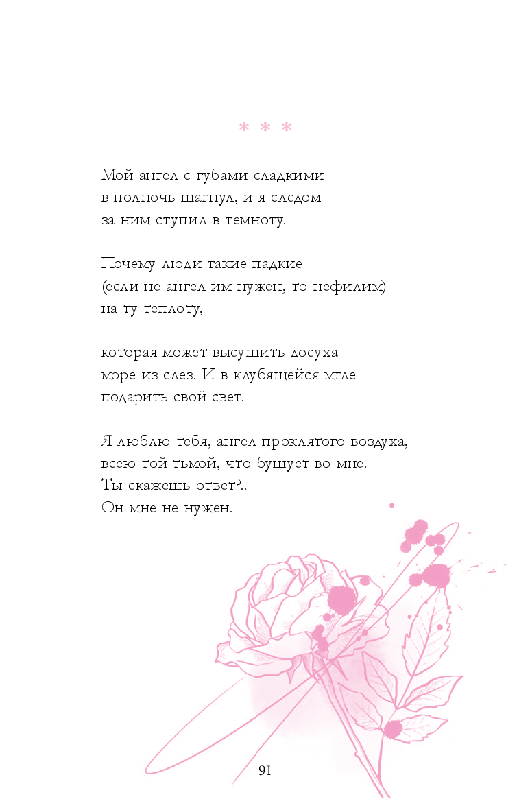 В первой части сборника ждут пронзительные стихи о любви, повседневных чудесах и тихих откровениях. Яркая, чувственная лирика Джейн полна тонких деталей, наблюдений и выверенных образов. Вторая часть – поэтическое отражение миров ее героев: от мятежной Тани Ведьминой до персонажей дилогии "Притворись моей парой", от нежной колыбельной "Нежеланной невесты" до резких слов "Поклонника" и даже строк по мотивам неоконченной книги "На подмостках волшебства".