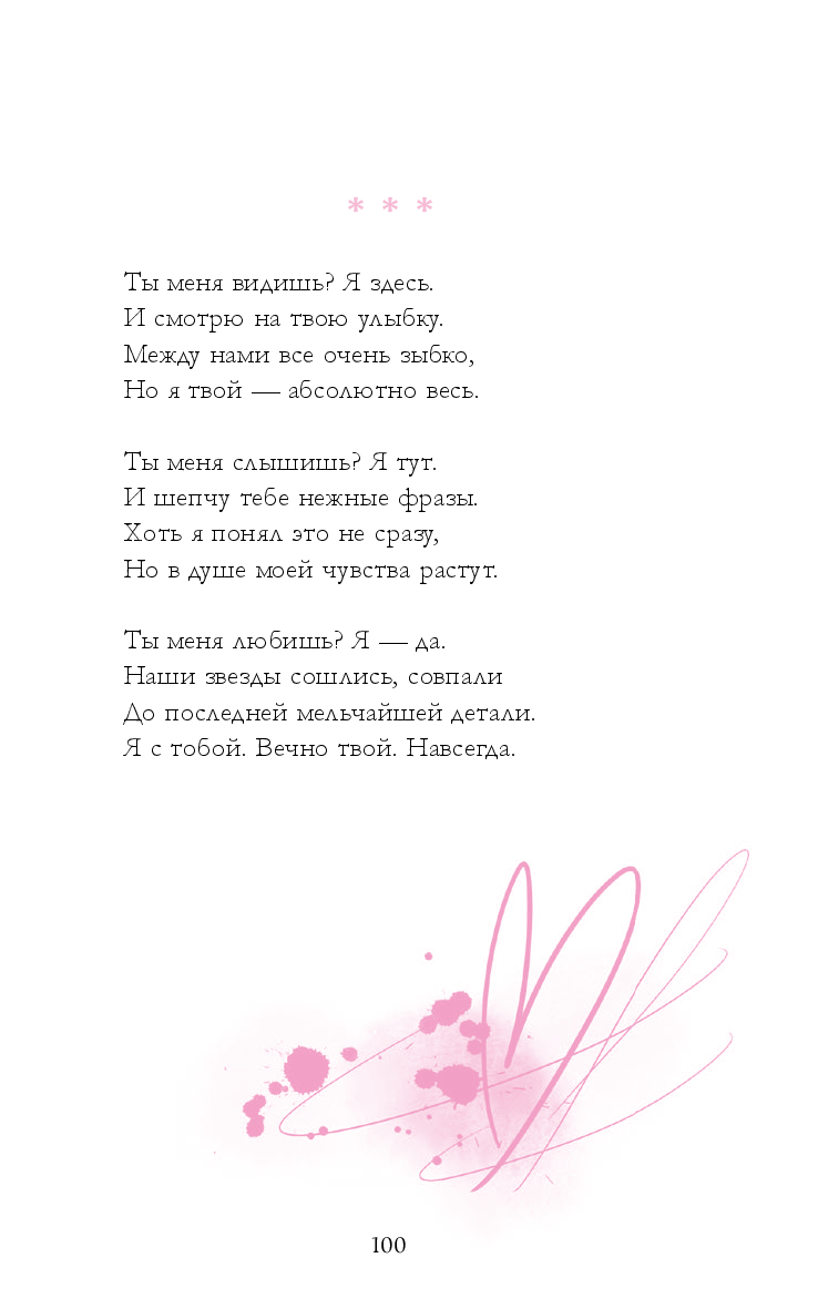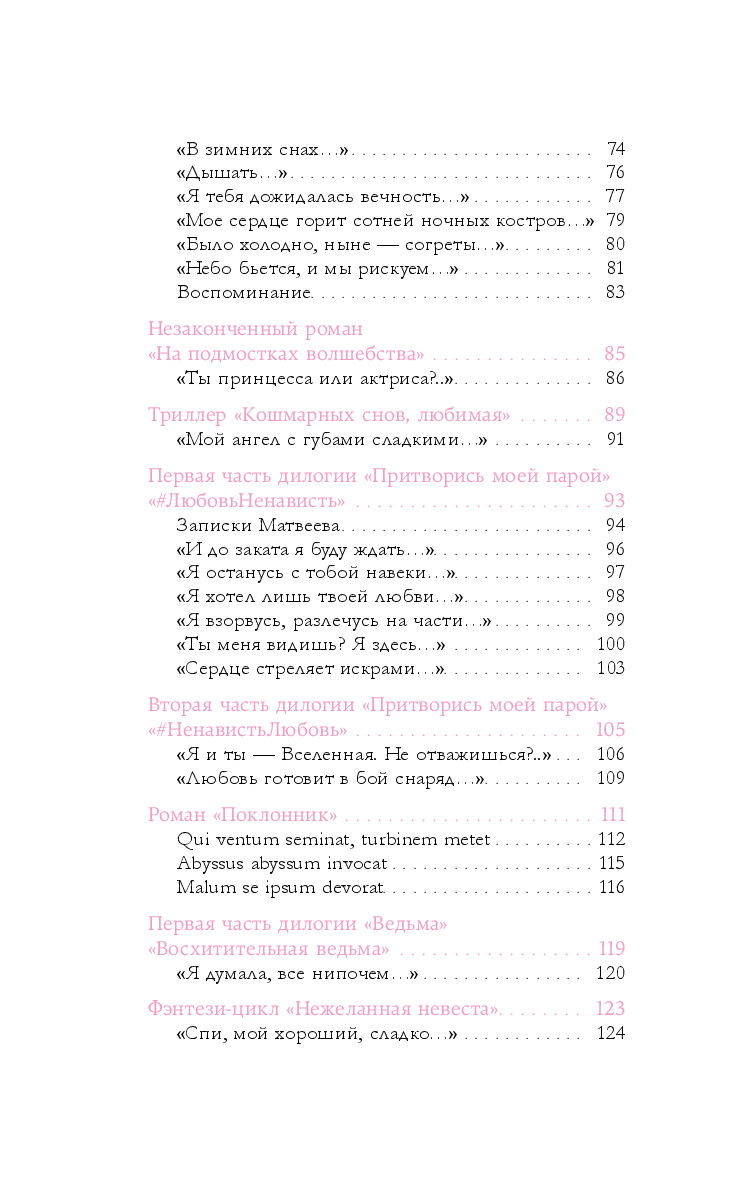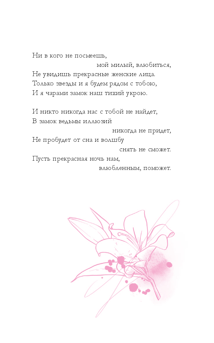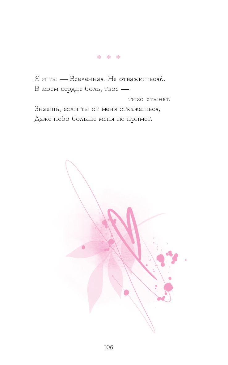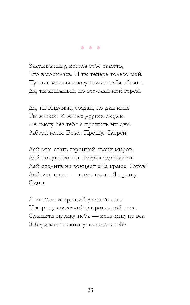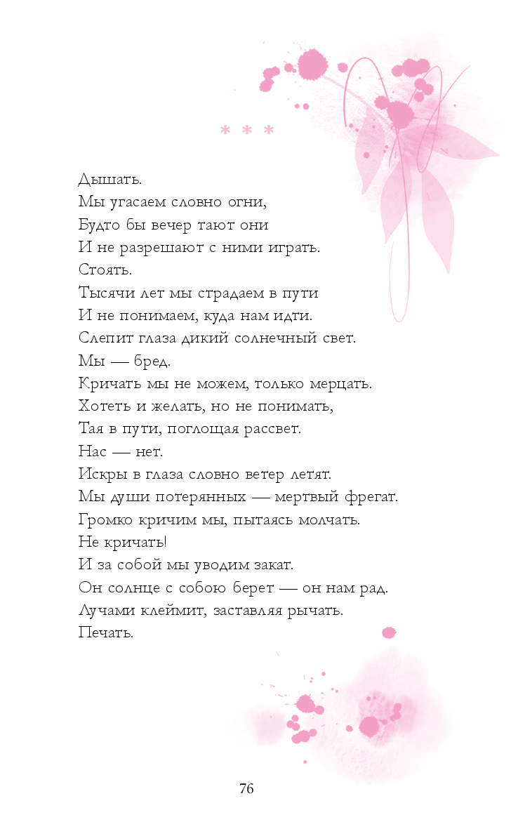 В первой части сборника ждут пронзительные стихи о любви, повседневных чудесах и тихих откровениях. Яркая, чувственная лирика Джейн полна тонких деталей, наблюдений и выверенных образов. Вторая часть – поэтическое отражение миров ее героев: от мятежной Тани Ведьминой до персонажей дилогии "Притворись моей парой", от нежной колыбельной "Нежеланной невесты" до резких слов "Поклонника" и даже строк по мотивам неоконченной книги "На подмостках волшебства".