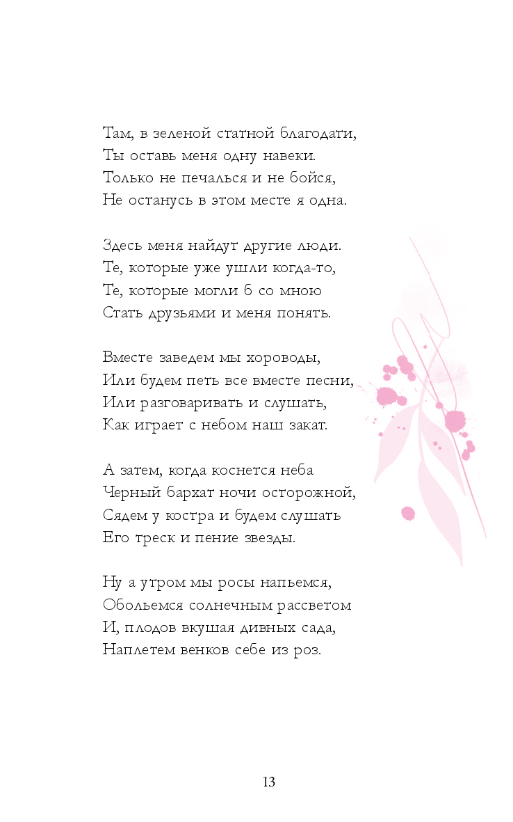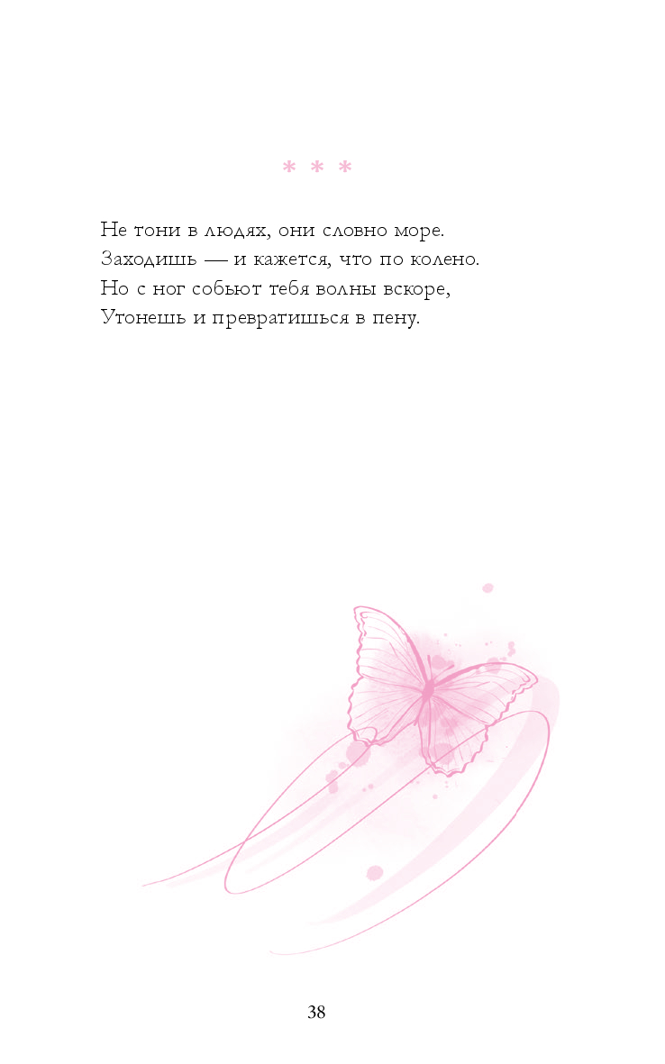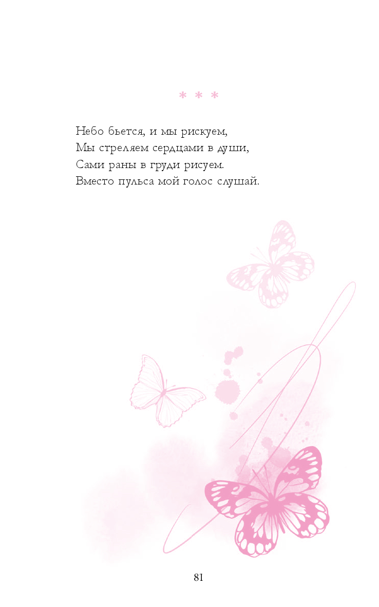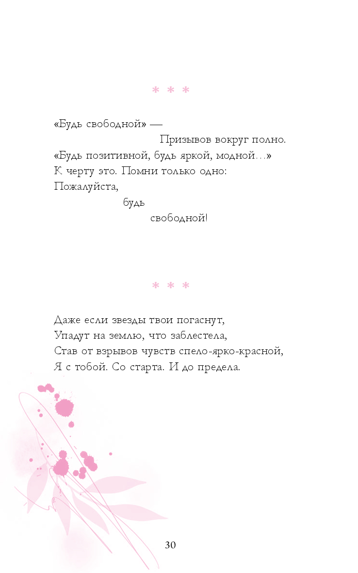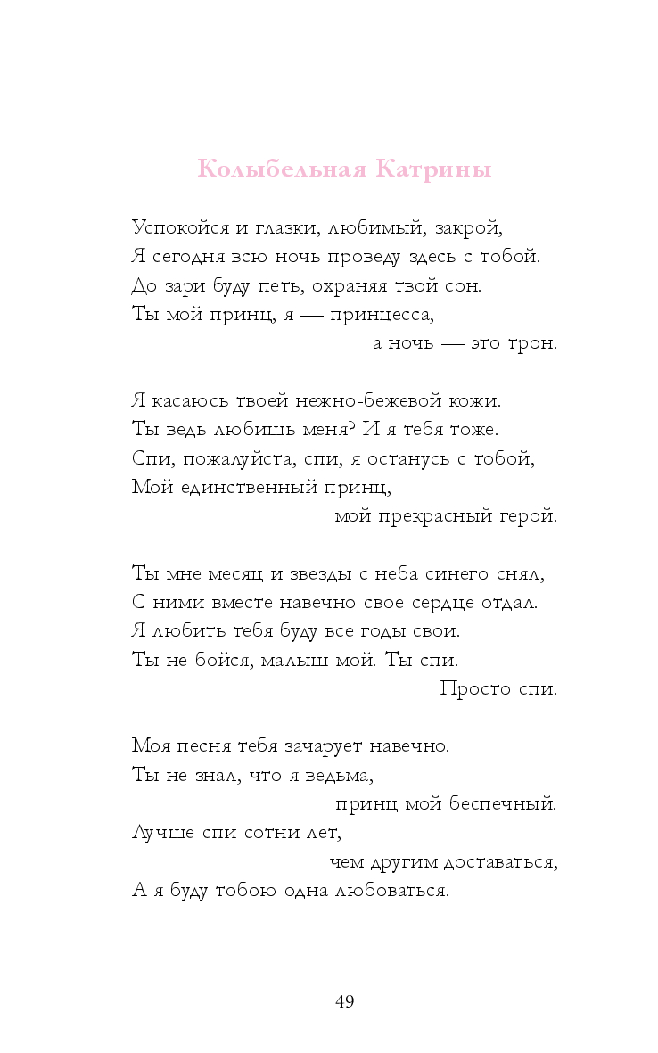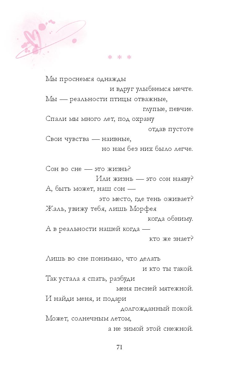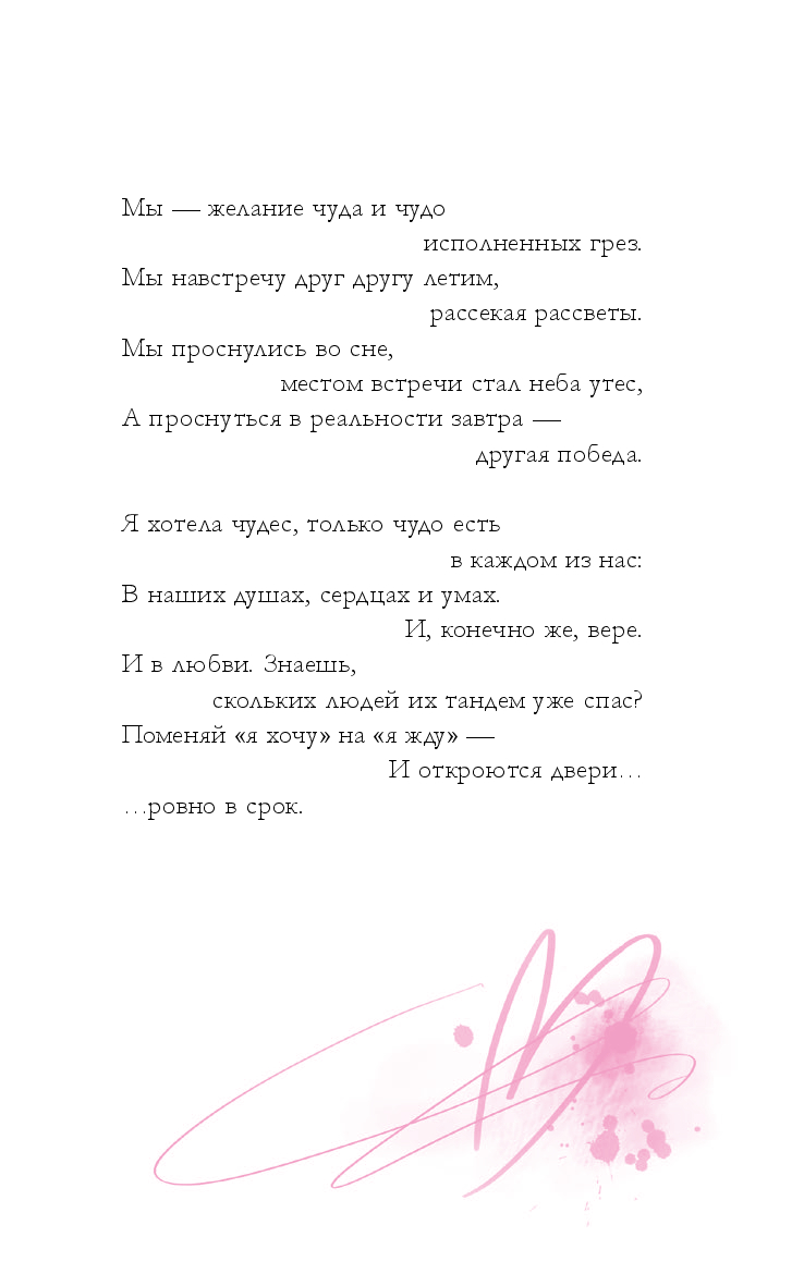 В первой части сборника ждут пронзительные стихи о любви, повседневных чудесах и тихих откровениях. Яркая, чувственная лирика Джейн полна тонких деталей, наблюдений и выверенных образов. Вторая часть – поэтическое отражение миров ее героев: от мятежной Тани Ведьминой до персонажей дилогии "Притворись моей парой", от нежной колыбельной "Нежеланной невесты" до резких слов "Поклонника" и даже строк по мотивам неоконченной книги "На подмостках волшебства".