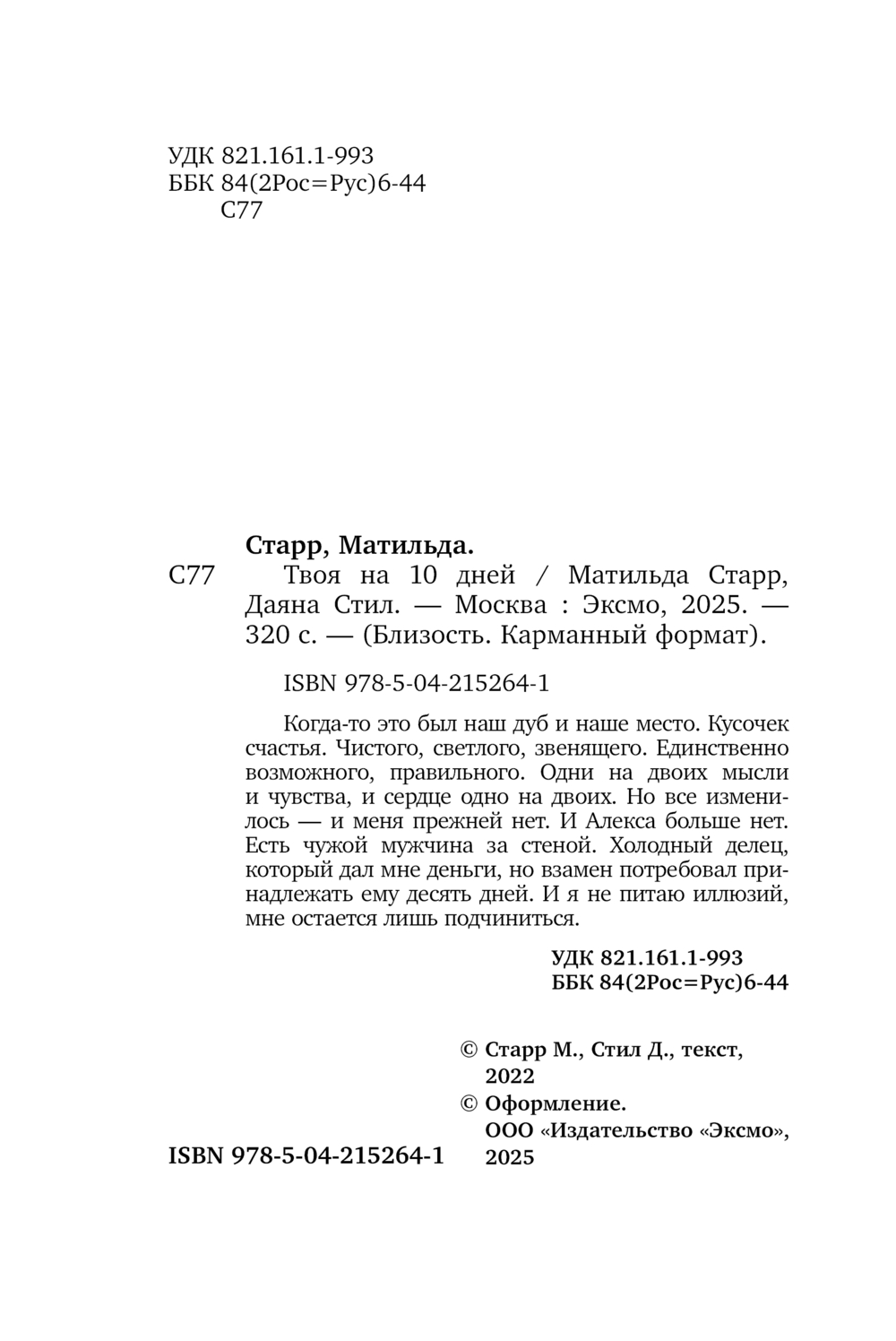 Когда-то это был наш дуб, и наше место. Кусочек счастья. Чистого, светлого, звенящего. Единственно возможного, правильного. Одни на двоих мысли, и чувства, и сердце одно на двоих. Счастье… Но все изменилось – и меня прежней нет. И Алекса больше нет. Есть чужой мужчина за стеной. Холодный делец, который дал мне деньги, но взамен потребовал принадлежать ему десять дней. И я не питаю иллюзий, мне остается лишь подчиниться.
