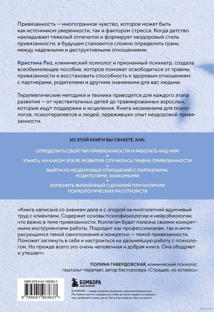 Кристина Риз, клинический психолог и признанный психиатр, создала всеобъемлющее руководство, которое поможет освободиться от травмы привязанности, прекратить разрушающие отношения и восстановить способность к здоровым отношениям: с партнерами, родителями и другими значимыми людьми.