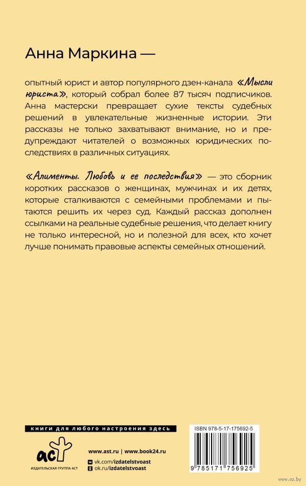 "Алименты. Любовь и ее последствия" – это сборник коротких рассказов о женщинах, мужчинах и их детях, которые сталкиваются с семейными проблемами и пытаются решить их через суд. Каждый рассказ дополнен ссылками на реальные судебные решения, что делает книгу не только интересной, но и полезной для всех, кто хочет лучше понимать правовые аспекты семейных отношений.