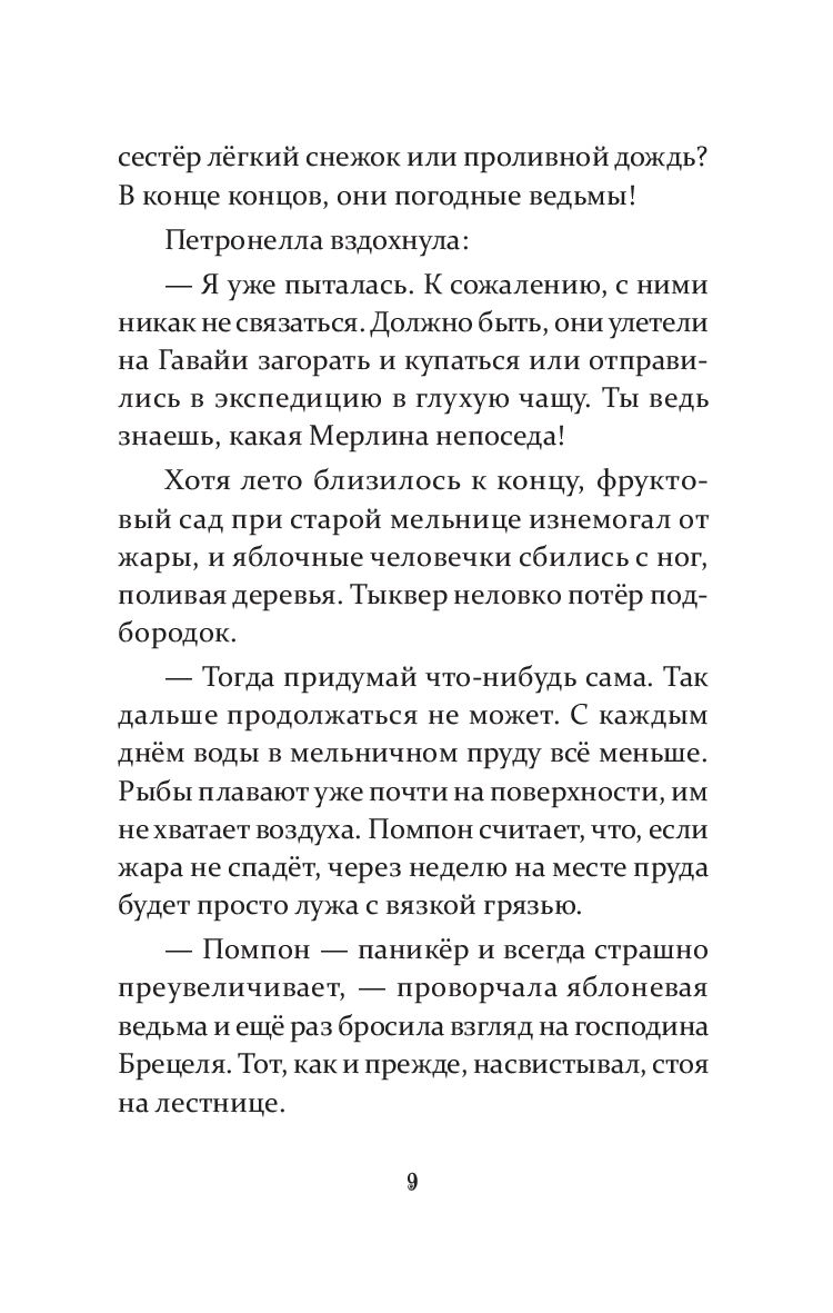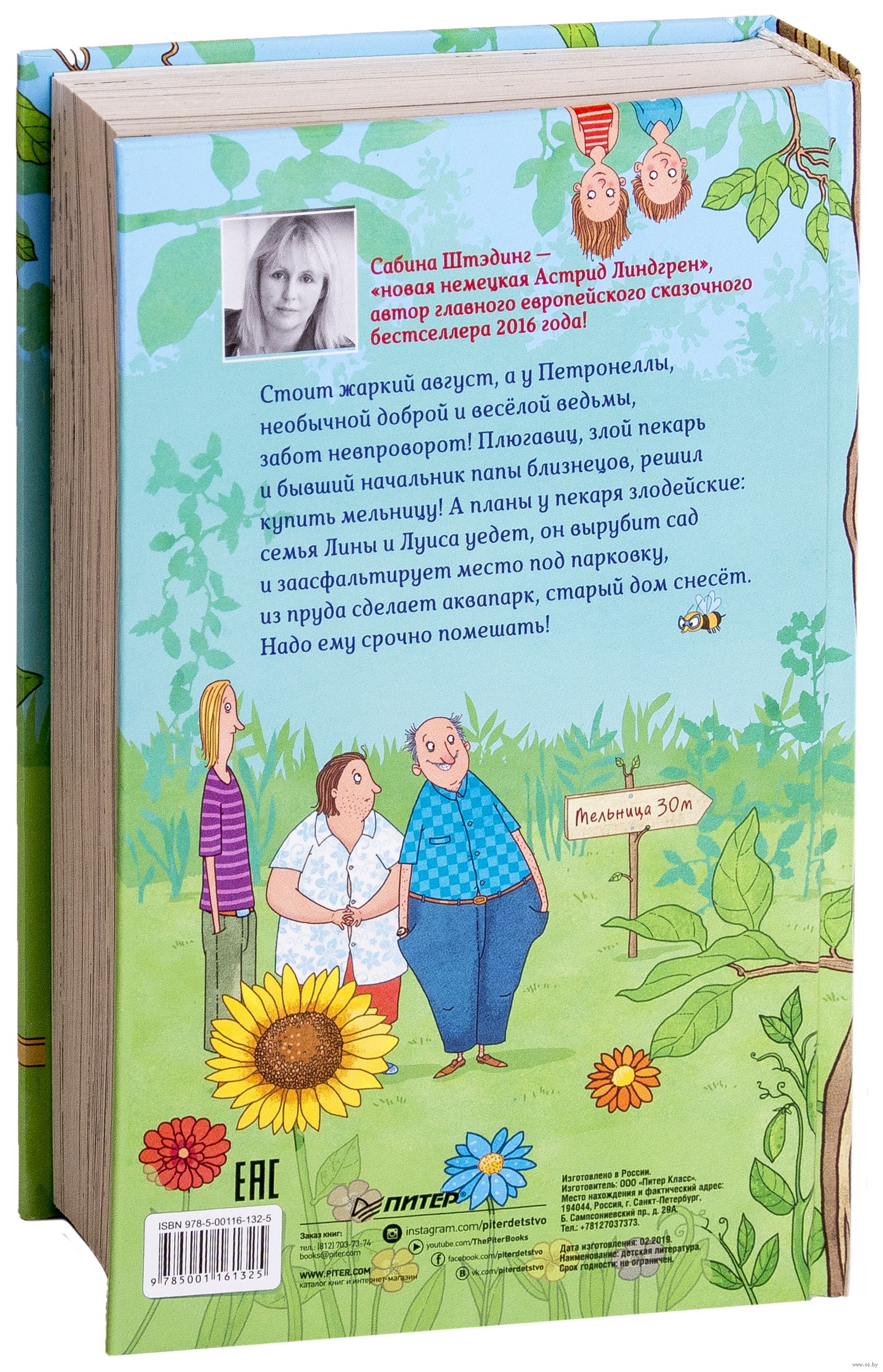 Стоит жаркий август, а у Петронеллы, необычной доброй и весёлой ведьмы, забот невпроворот! Плюгавиц, злой пекарь и бывший начальник папы близнецов, решил купить мельницу! А планы у пекаря злодейские: семья Лины и Луиса уедет, он вырубит сад и заасфальтирует под парковку, из пруда сделает аквапарк, старый дом снесет. Надо ему срочно помешать!