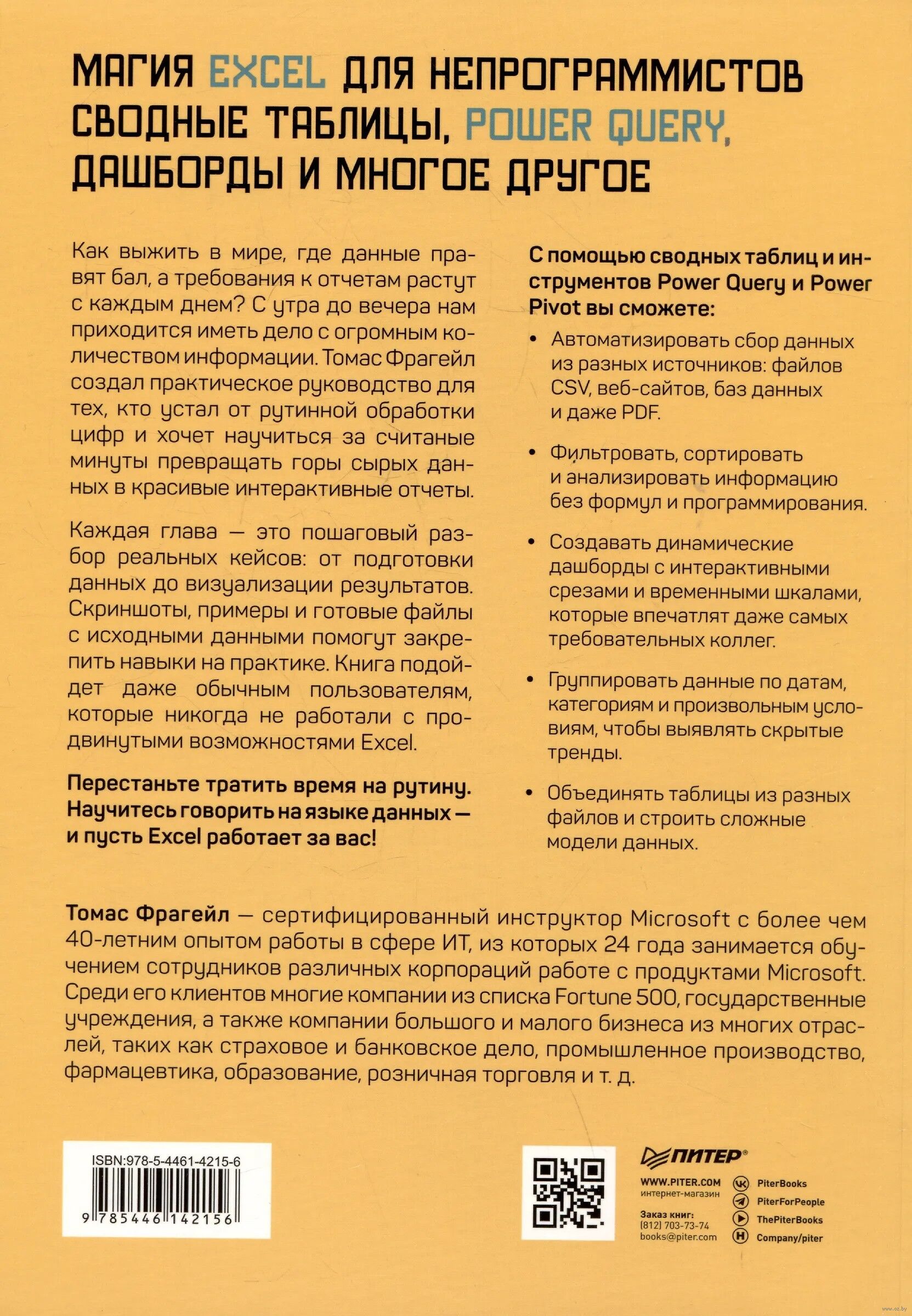 Каждая глава – это пошаговый разбор реальных кейсов: от подготовки данных до визуализации результатов. Скриншоты, примеры и готовые файлы с исходными данными помогут закрепить навыки на практике. Книга подойдет даже обычным пользователям, которые никогда не работали с продвинутыми возможностями Excel.
