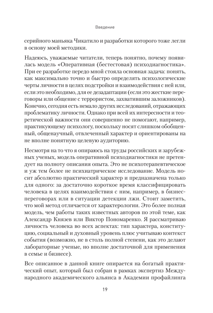 Авторская методика оперативной психодиагностики поможет точно и быстро оценить человека менее чем за 2 минуты общения – понять, кто перед вами, каков его поведенческий портрет, как он будет реагировать на те или иные ситуации. Метод может быть использован для того, чтобы максимально точно и быстро подстроиться под собеседника или оппонента, а при необходимости – даже дезадаптировать его (например, в случае жесткой беседы, сложных переговоров или общения с преступником или террористами).