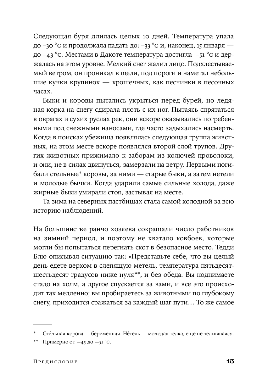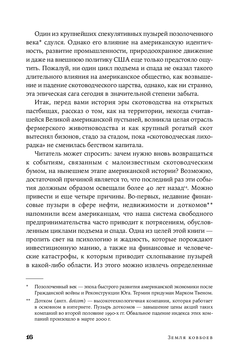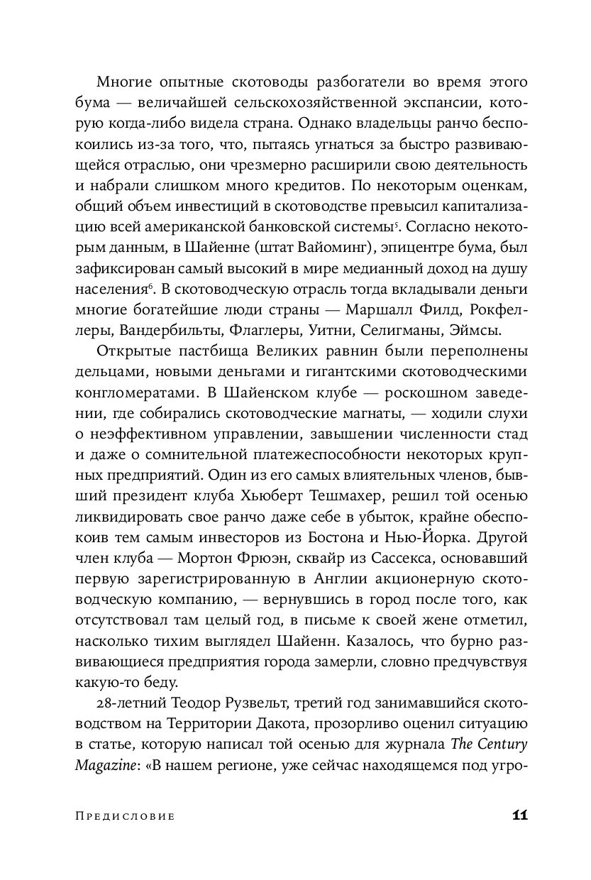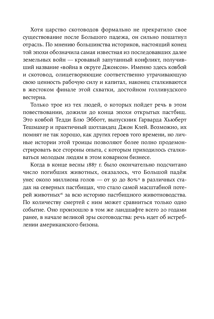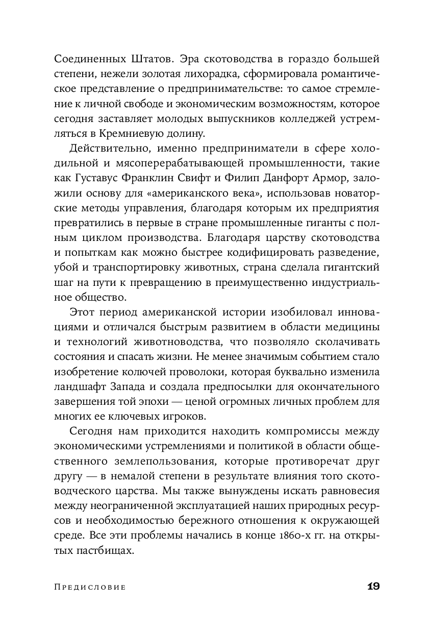 Ковбои Дикого Запада, обретшие статус почти мифических героев, канули в прошлое, однако миф о них оказался удивительно живуч: он не только породил новое направление – вестерн – в искусстве и индустрии развлечений, но и повлиял на национальную политику США. К тому же "скотоводческая лихорадка" в еще большей степени, чем золотая, сформировала романтическое представление о предпринимательстве: стремление к личной свободе и экономическим возможностям, которое и сегодня заставляет выпускников колледжей отправляться в Кремниевую долину.