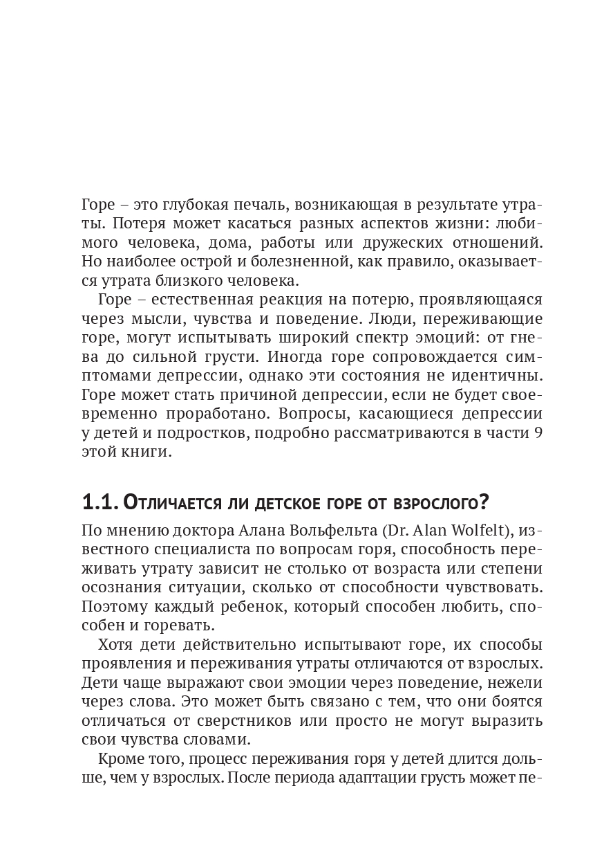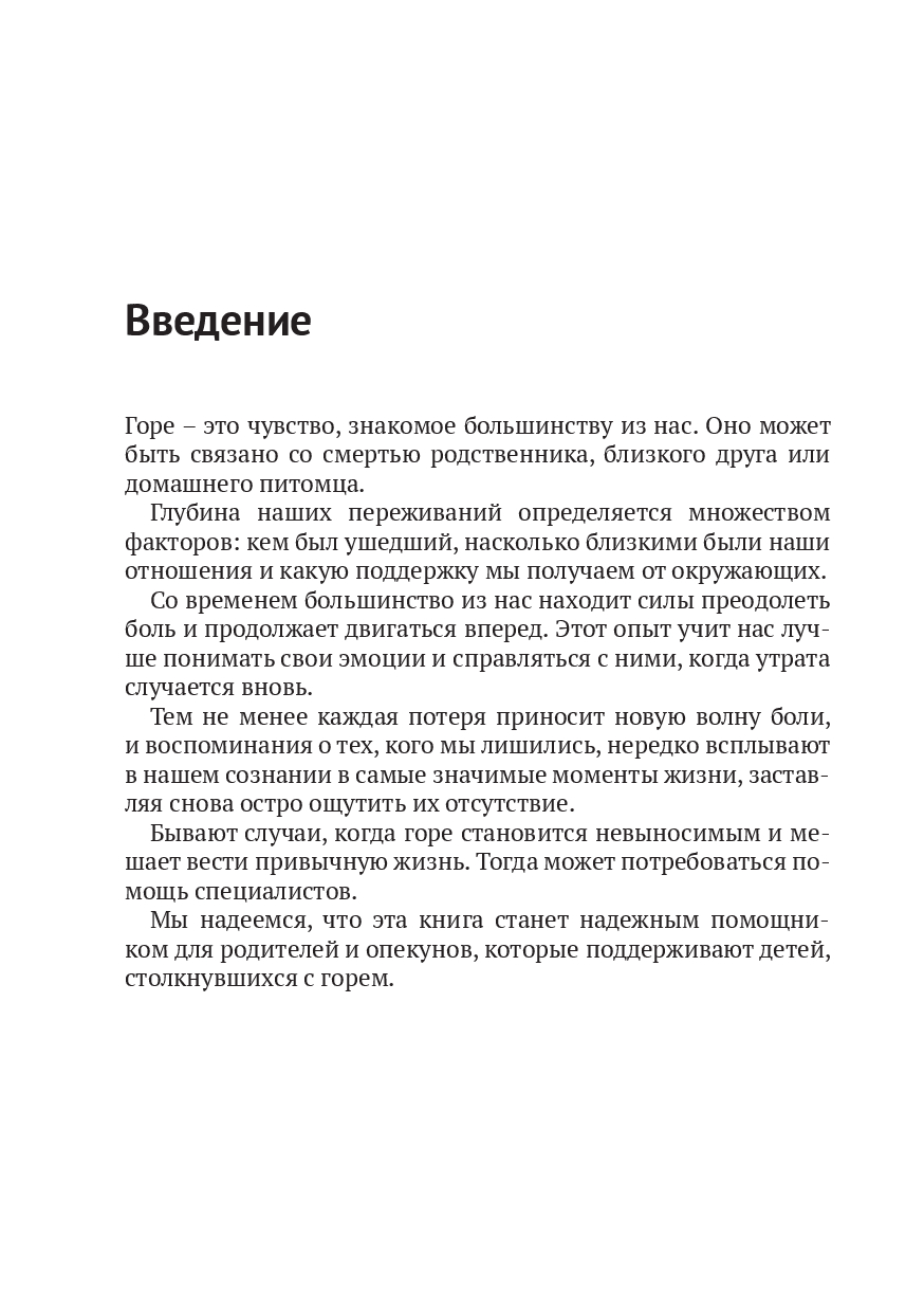 В книге рассказывается, как можно поддержать детей, которые столкнулись с утратой значимого для них человека. Опытные психологи объясняют, какие формы принимает проживание горя, как родные и близкие могут помочь ребенку в период горевания и когда имеет смысл прибегнуть к помощи специалиста.