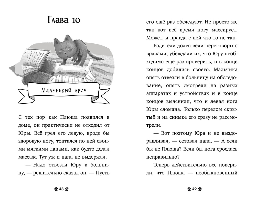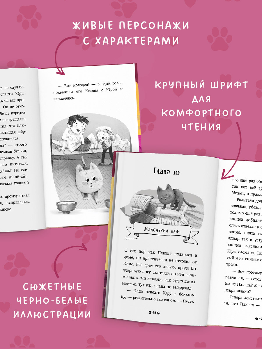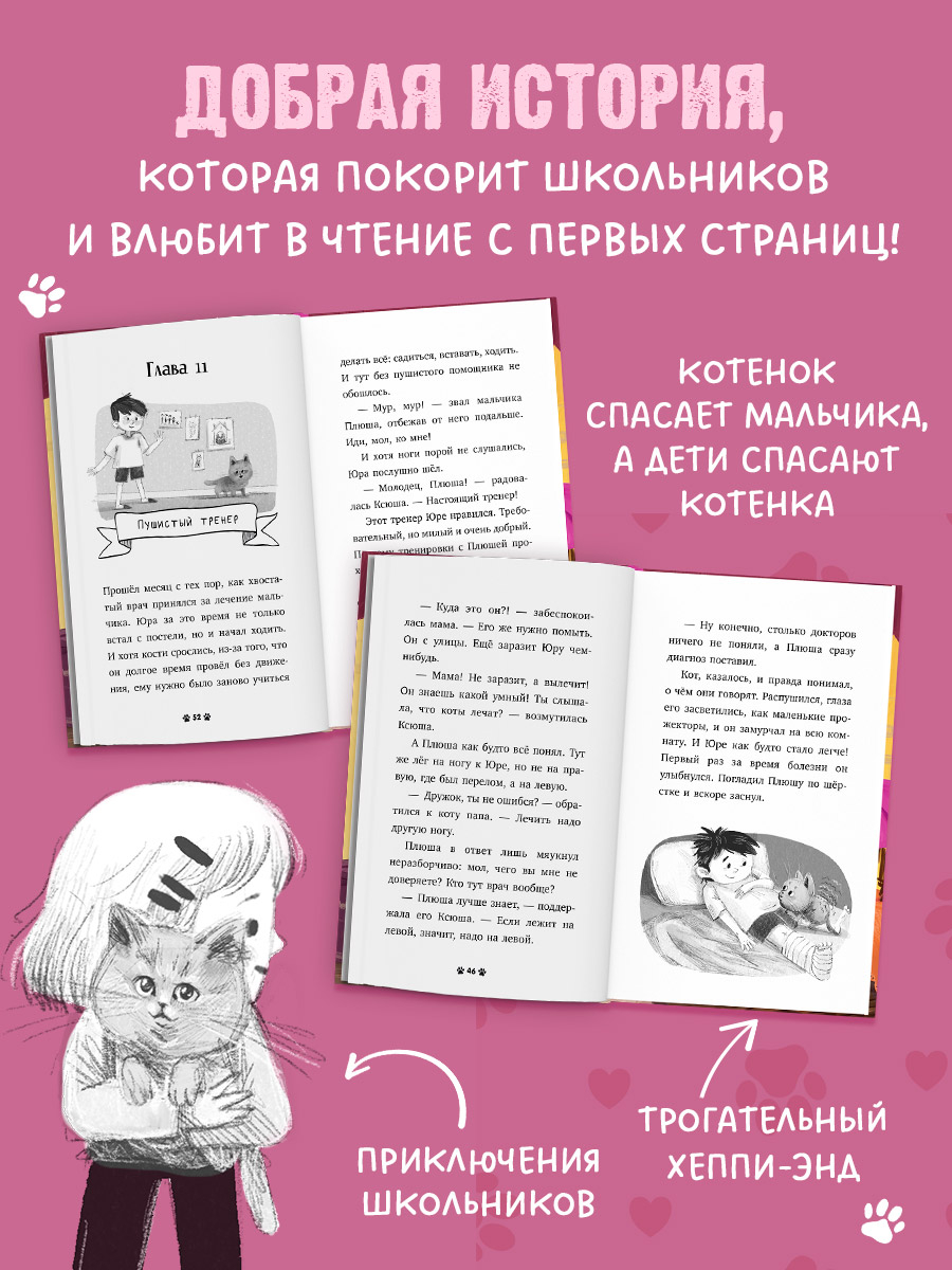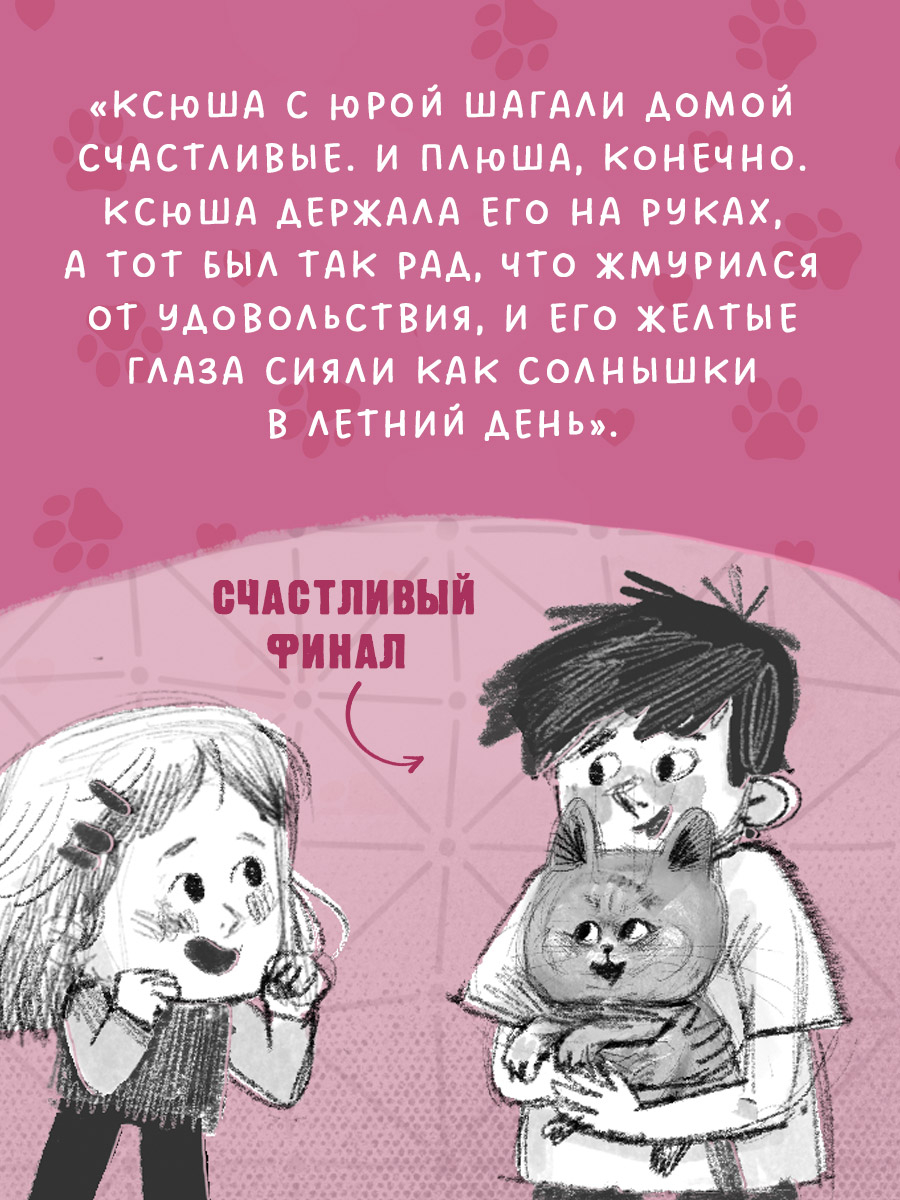 Восьмилетняя Ксюша мечтала о котенке. Гуляя по птичьему рынку, она увидела пушистый серый комочек с жёлтыми, как солнышко, глазами. Но родители не разрешили бы завести кота. Они были заняты только ее братом – спортсменом и чемпионом Юрой. Однажды Юра получил травму и заболел… И в доме появился котенок Плюша. Поможет ли Плюша Юре выздороветь? Кто захочет украсть котёнка Плюшу? Какие приключения ждут Ксюшу и ее питомца?