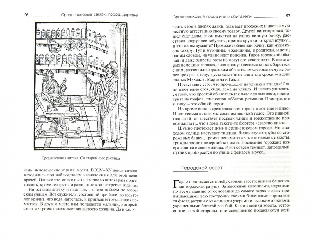 Увлекаемый автором, читатель изучает устройство замка, прогуливается по узким городским улочкам, заглядывает в аптеку, лабораторию алхимика и лавки ремесленников, проникает на заседание городского совета, участвует в судебном разбирательстве, оказывается на пиру в баронском замке и узнает много любопытного о меню и убранстве стола, присутствует при посвящении в рыцари, неожиданно замешивается в толпу бичующих себя религиозных фанатиков, знакомится с разбойниками и инквизицией, посещает дом богатого горожанина и крестьянское подворье, получает приглашения на рыцарские турниры, свадьбы и деревенские праздники, развлекается игрой бродячих актеров – словом, попадает в круговорот повседневности Средних веков…