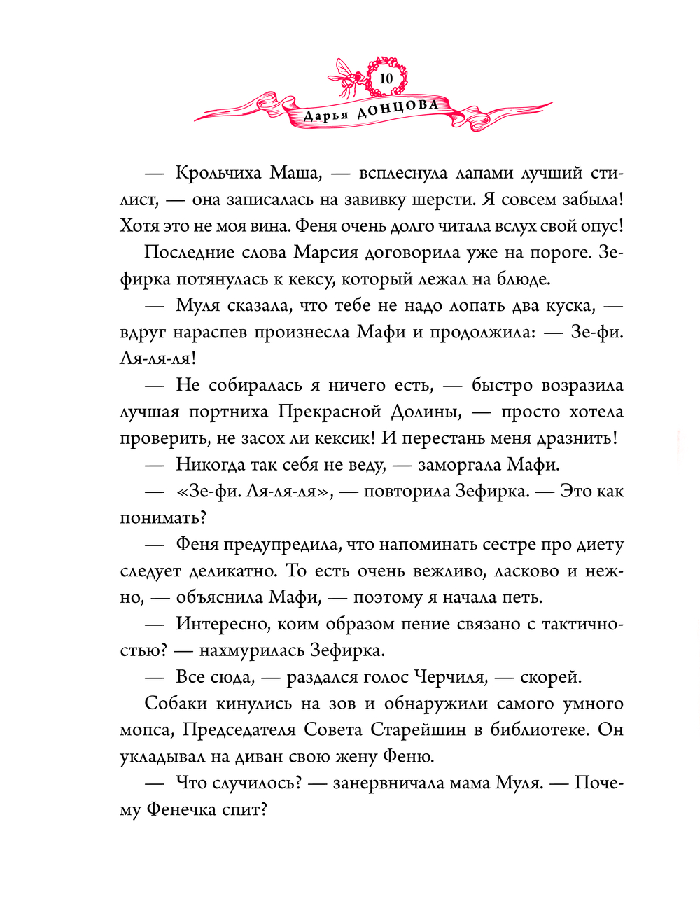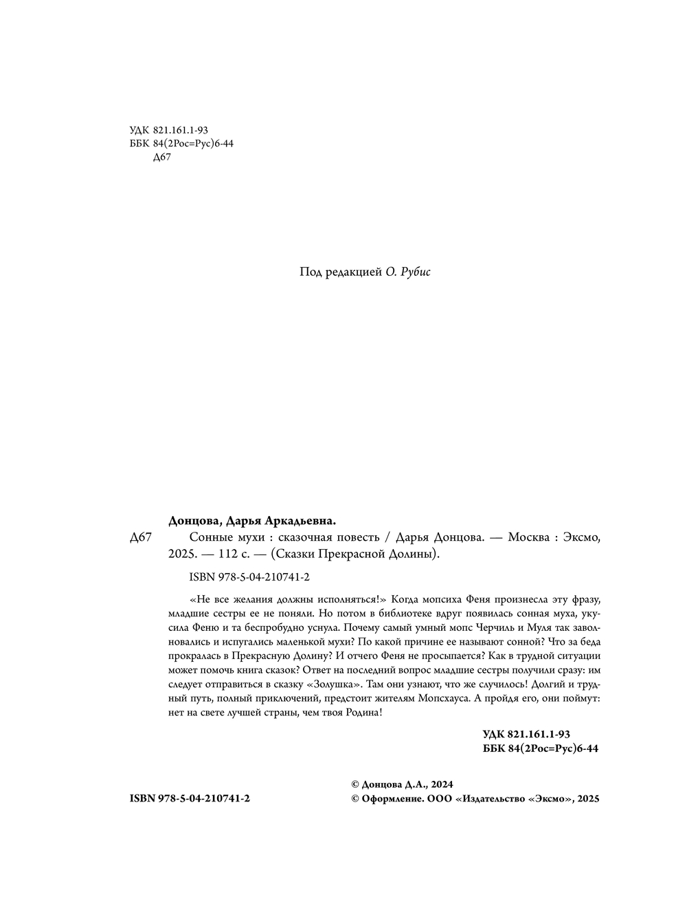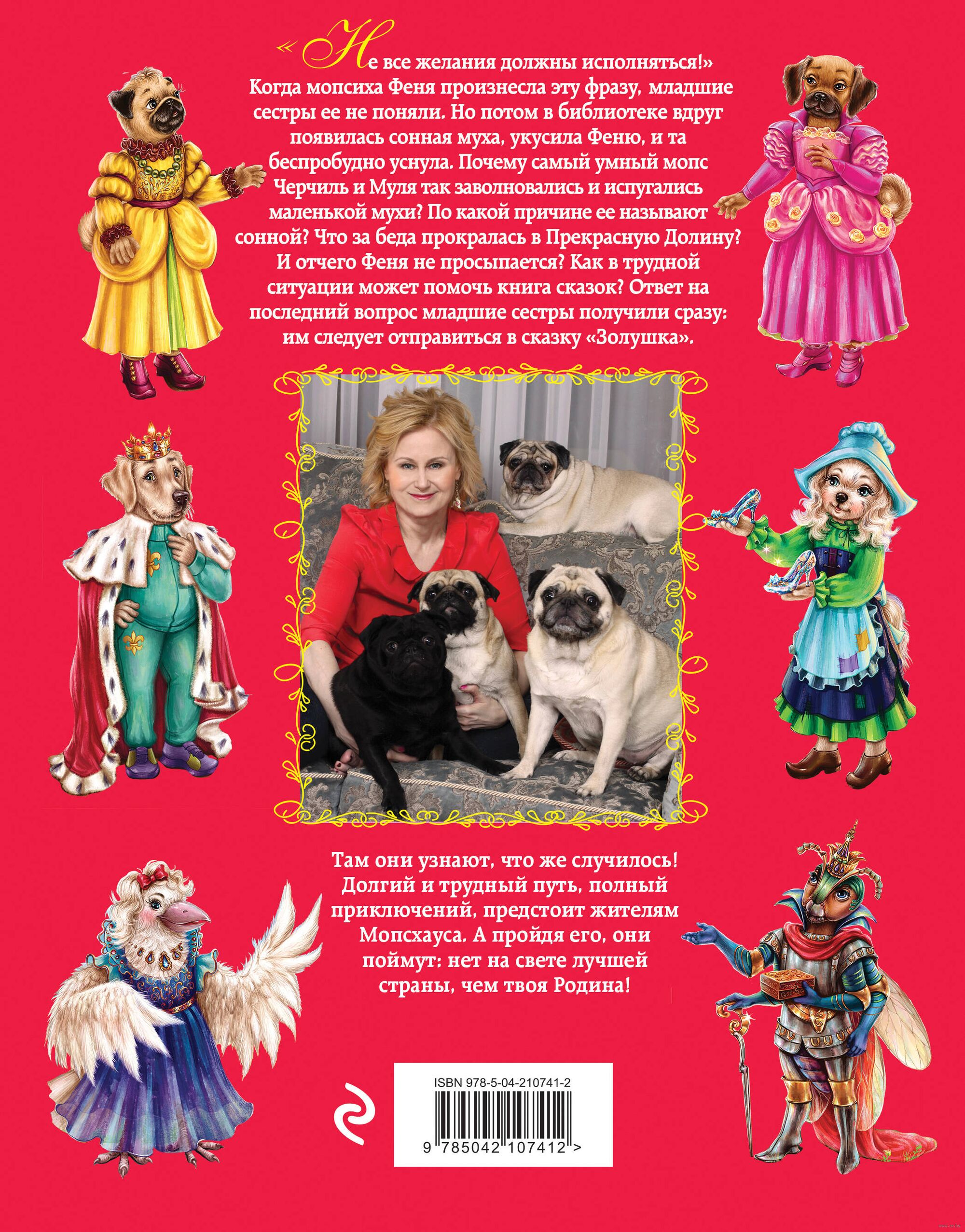 "Не все желания должны исполняться!". Когда мопсиха Феня произнесла эту фразу младшие сестры ее не поняли. Но потом в библиотеке вдруг появилась сонная муха, укусила Феню, и та беспробудно уснула. Почему самый умный мопс Черчиль и Муля так заволновались и испугались маленькой мухи? По какой причине ее называют сонной? Что за беда прокралась в Прекрасную Долину? И отчего Феня не просыпается? Как в трудной ситуации может помочь книга сказок? Ответ на последний вопрос младшие сестры получили сразу: им следует отправиться в сказку "Золушка". Там они узнают, что же случилось! Долгий и трудный путь, полный приключений, предстоит жителям Мопсхауса. А пройдя его они поймут: нет на свете лучшей страны, чем твоя Родина!