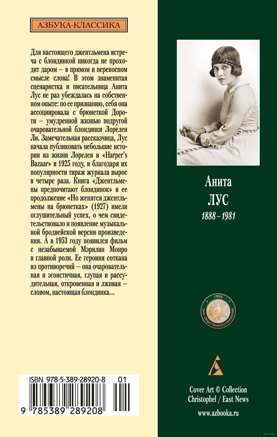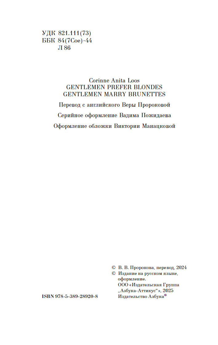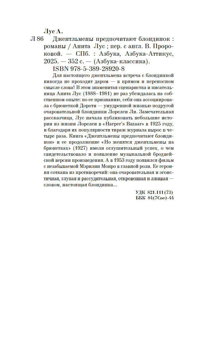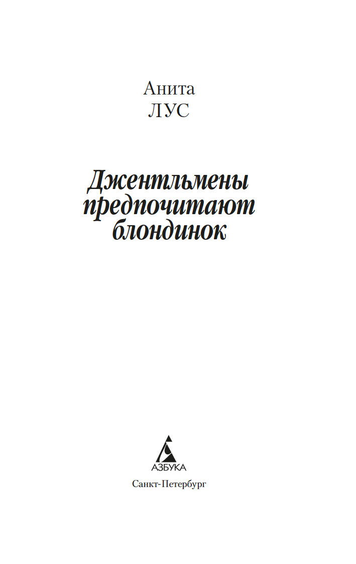 Для настоящего джентльмена встреча с блондинкой никогда не проходит даром – в прямом и переносном смысле слова! В этом знаменитая сценаристка и писательница Анита Лус (1888–1981) не раз убеждалась на собственном опыте: по ее признанию, себя она ассоциировала с брюнеткой Дороти – умудренной жизнью подругой очаровательной блондинки Лорелеи Ли. Замечательная рассказчица, Лус начала публиковать небольшие истории из жизни Лорелеи в "Harper’s Bazaar" в 1925 году, и благодаря их популярности тираж журнала вырос в четыре раза. Книга "Джентльмены предпочитают блондинок" и ее продолжение "Но женятся джентльмены на брюнетках" (1927) имели оглушительный успех, о чем свидетельствовало и появление музыкальной бродвейской версии произведения. А в 1953 году появился фильм с незабываемой Мэрилин Монро в главной роли. Ее героиня соткана из противоречий: она очаровательная и эгоистичная, глупая и рассудительная, откровенная и лживая – словом, настоящая блондинка…