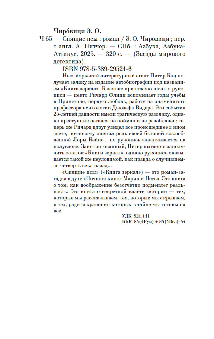 "Спящие псы" ("Книга зеркал") – это роман-загадка в духе "Ночного кино" Мариши Пессл. Это книга о том, как воображение безотчетно подменяет реальность. Это книга о секретной власти историй – тех, которые мы рассказываем, тех, которые мы скрываем, и тех, ради сохранения которых в тайне мы готовы на все.