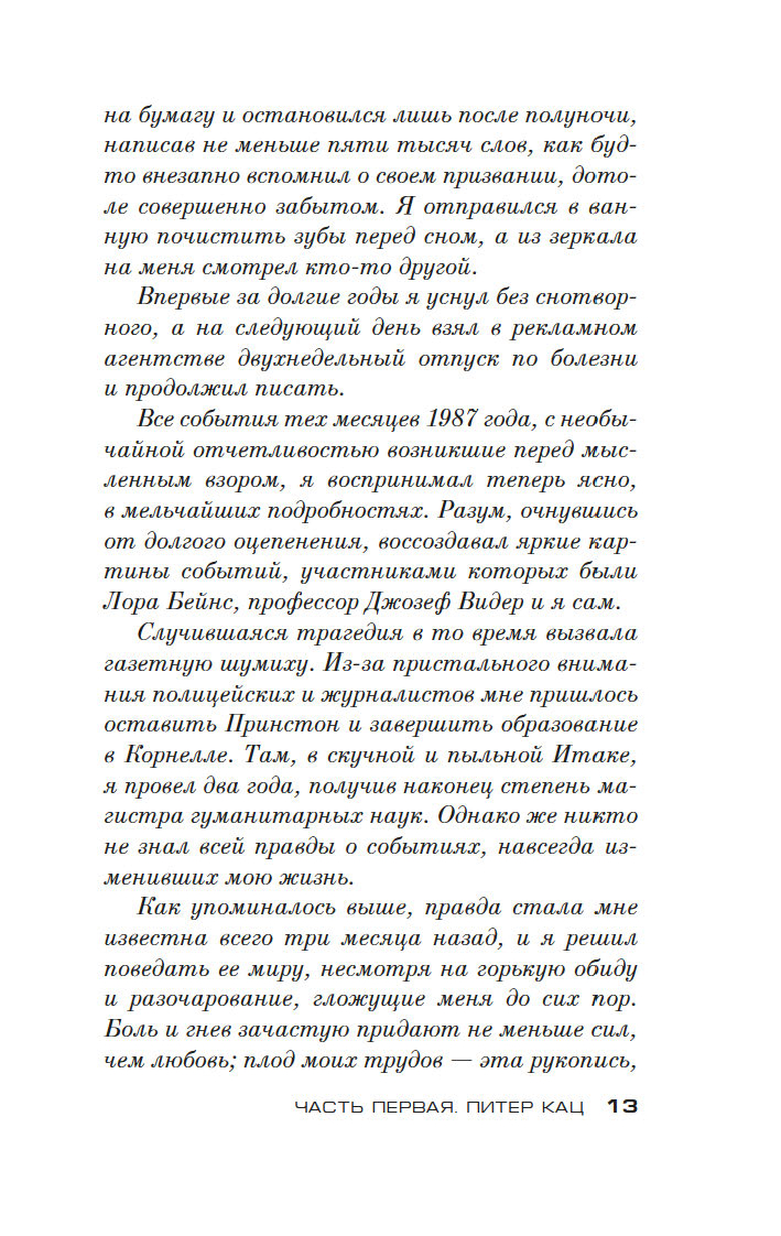 Нью-йоркский литературный агент Питер Кац получает заявку на издание автобиографии под названием "Книга зеркал". К заявке приложено начало рукописи – некто Ричард Флинн вспоминает годы учебы в Принстоне, первую любовь, работу на знаменитого профессора психологии Джозефа Видера. Эти события 25-летней давности имели трагическую развязку, однако преступник остался не пойман и не разоблачен; теперь же Ричард вдруг увидел все происшедшее в ином свете, по-новому оценил роль своей бывшей возлюбленной Лоры Бейнс… но рукопись заканчивается на полуслове. Заинтригованный, Питер пытается заполучить остаток "Книги зеркал", однако рукопись оказывается такой же неуловимой, как правда о случившемся четверть века назад…