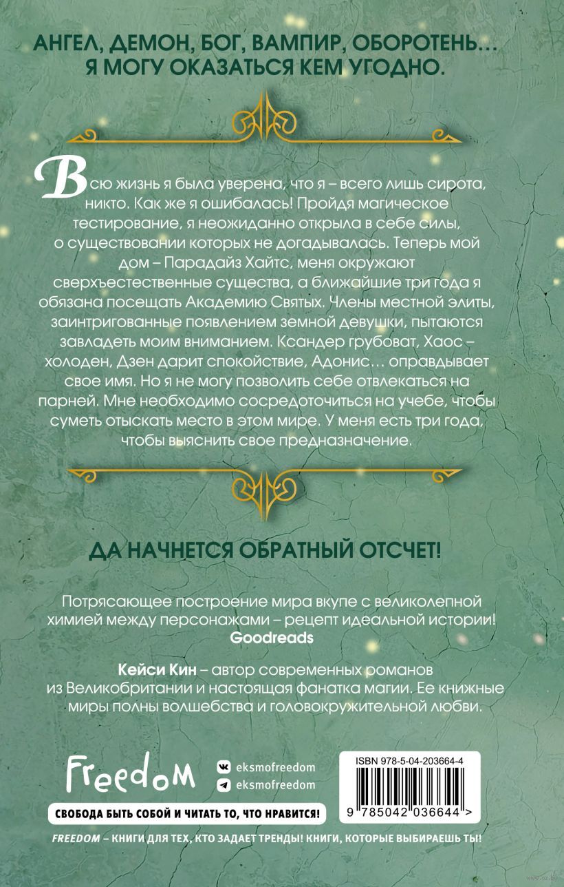 Всю свою жизнь я бродила по улицам родного городка, точно уверенная в том, что я – всего лишь сирота, обычная девушка, никто... Как же я ошибалась! Мой мир изменился в двадцать второй день рождения: пройдя магическое тестирование, я неожиданно открыла в себе силы, о существовании которых и не догадывалась. Теперь мой дом – Парадайз Хайтс, меня окружают сверхъестественные существа, а ближайшие три года я обязана посещать Академию Святых. Члены местной элиты, заинтригованные появлением земной девушки, пытаются завладеть моим вниманием. Ксандер грубоват, Хаос – холоден, Дзен дарит спокойствие, а Адонис… оправдывает свое имя. Но я не могу позволить себе отвлекаться на парней. Мне необходимо сосредоточиться на учебе, чтобы суметь отыскать свое место в этом мире. Ангел, демон, бог, вампир, оборотень… Я могу оказаться кем угодно, и чтобы выяснить свое предназначение, у меня есть три года. Да начнется обратный отсчет!