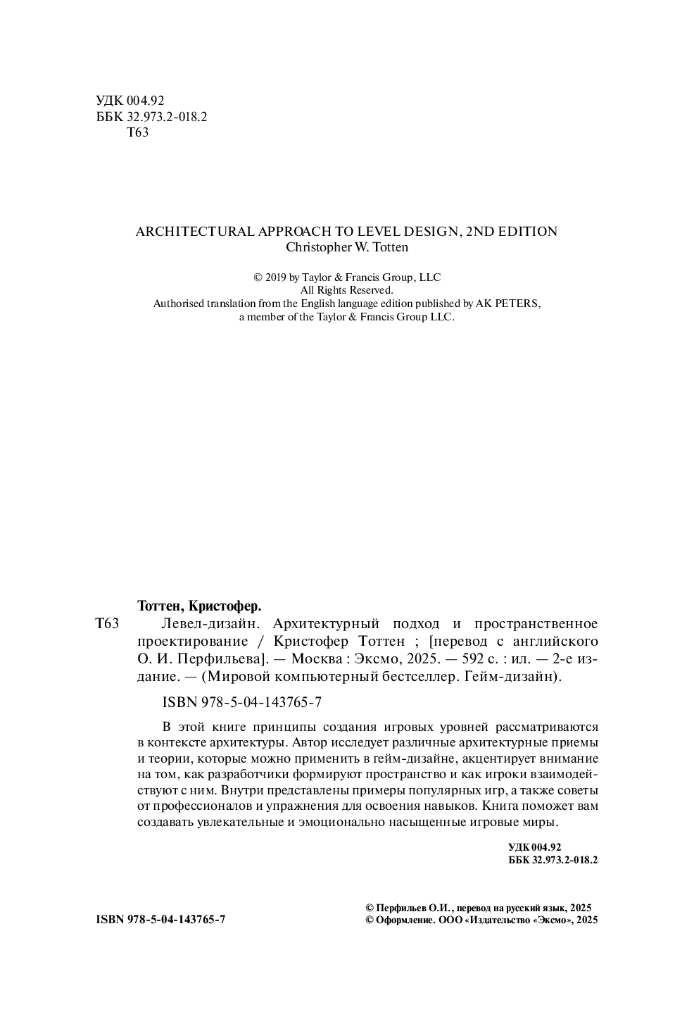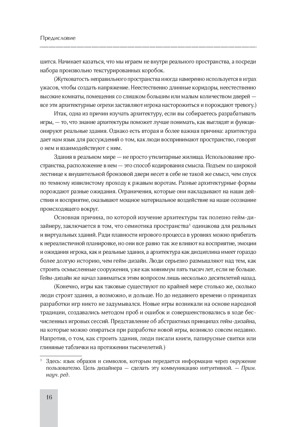 В этой книге принципы создания игровых уровней рассматриваются в контексте архитектуры. Автор исследует различные архитектурные приемы и теории, которые можно применить в гейм-дизайне, акцентирует внимание на том, как разработчики формируют пространство и как игроки взаимодействуют с ним. Внутри представлены примеры популярных игр, а также советы от профессионалов и упражнения для освоения навыков. Книга поможет вам создавать увлекательные и эмоционально насыщенные игровые миры.