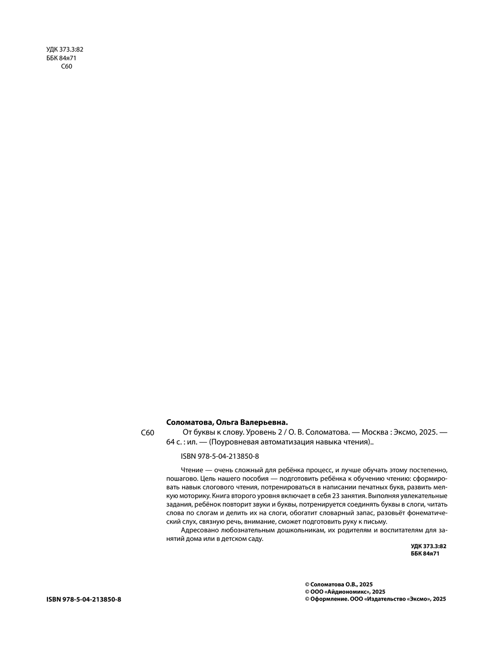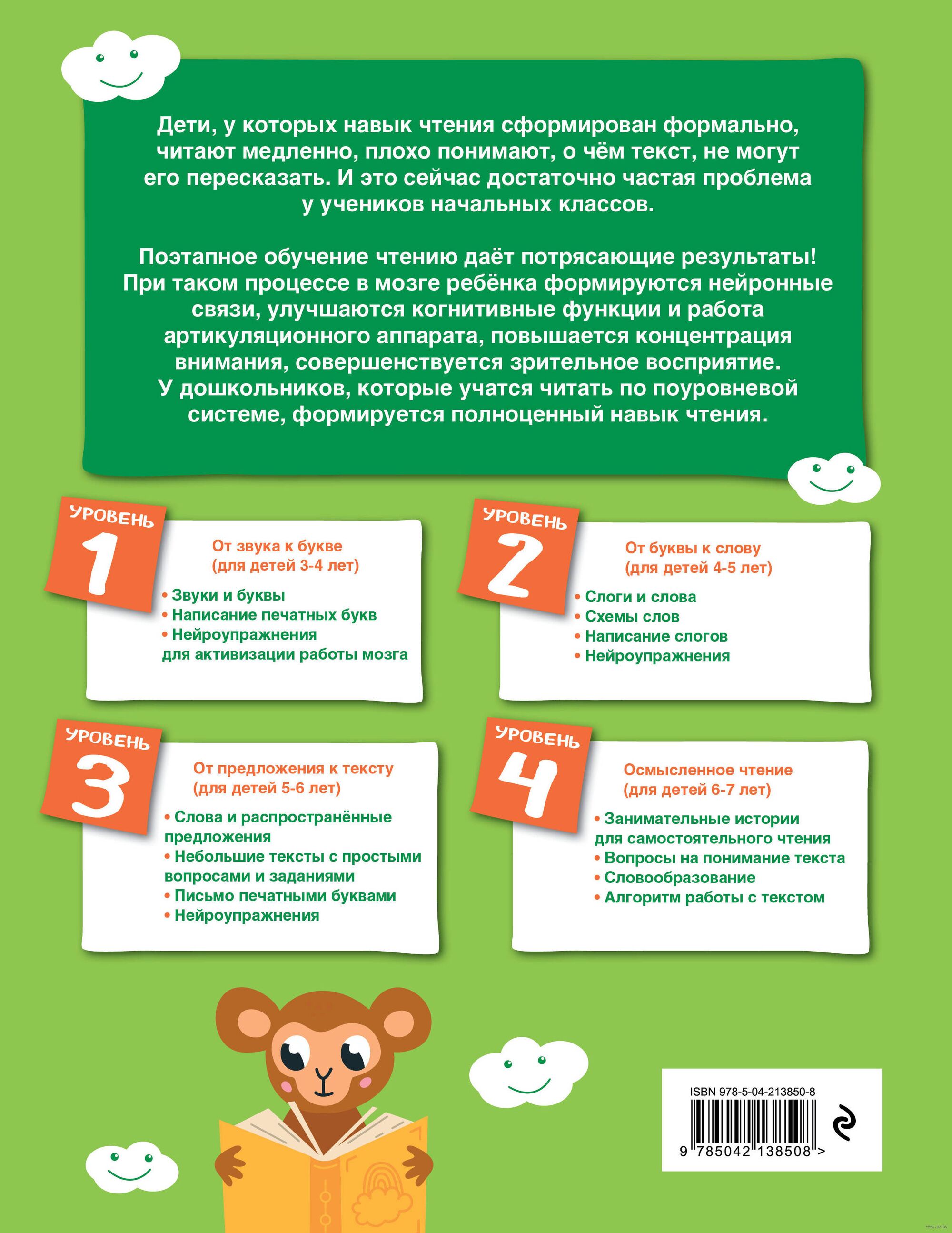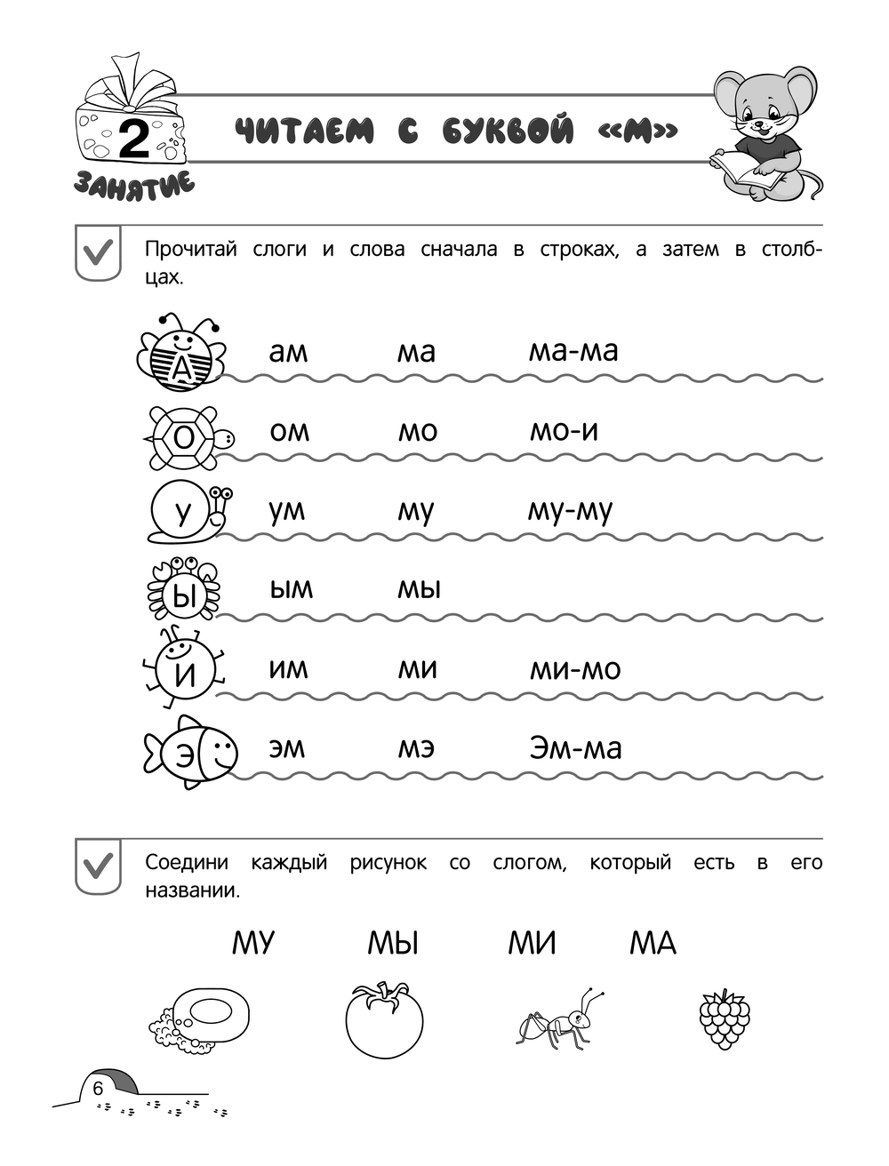 Чтение – очень сложный для ребенка процесс и лучше делать это постепенно, пошагово. Цель нашего пособия – подготовить ребёнка к обучению чтению: сформировать навык слогового чтения, потренироваться в написании печатные букв, развить мелкую моторику. Книга второго уровня включает в себя 23 занятия. Выполняя увлекательные задания, ребёнок повторит звуки и буквы, потренируется соединять буквы в слоги, читать слова по слогам и делить их на слоги, обогатит словарный запас, разовьёт фонематический слух, связную речь, внимание, сможет подготовить руку к письму.