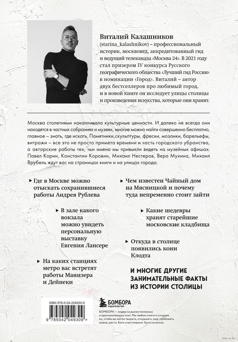 Москва столетиями накапливала культурные ценности. И далеко не всегда они находятся в частных особняках и музеях, многие можно найти совершенно бесплатно, главное – знать, где искать. Памятники, скульптуры, фрески, мозаики, барельефы, витражи – многое из этого не просто примета времени и часть городского убранства, а авторские работы тех, чьи имена мы привыкли видеть на музейных афишах. Павел Корин, Виктор Васнецов, Михаил Нестеров, Вера Мухина, Михаил Врубель ждут вас на страницах книги и на улицах города.