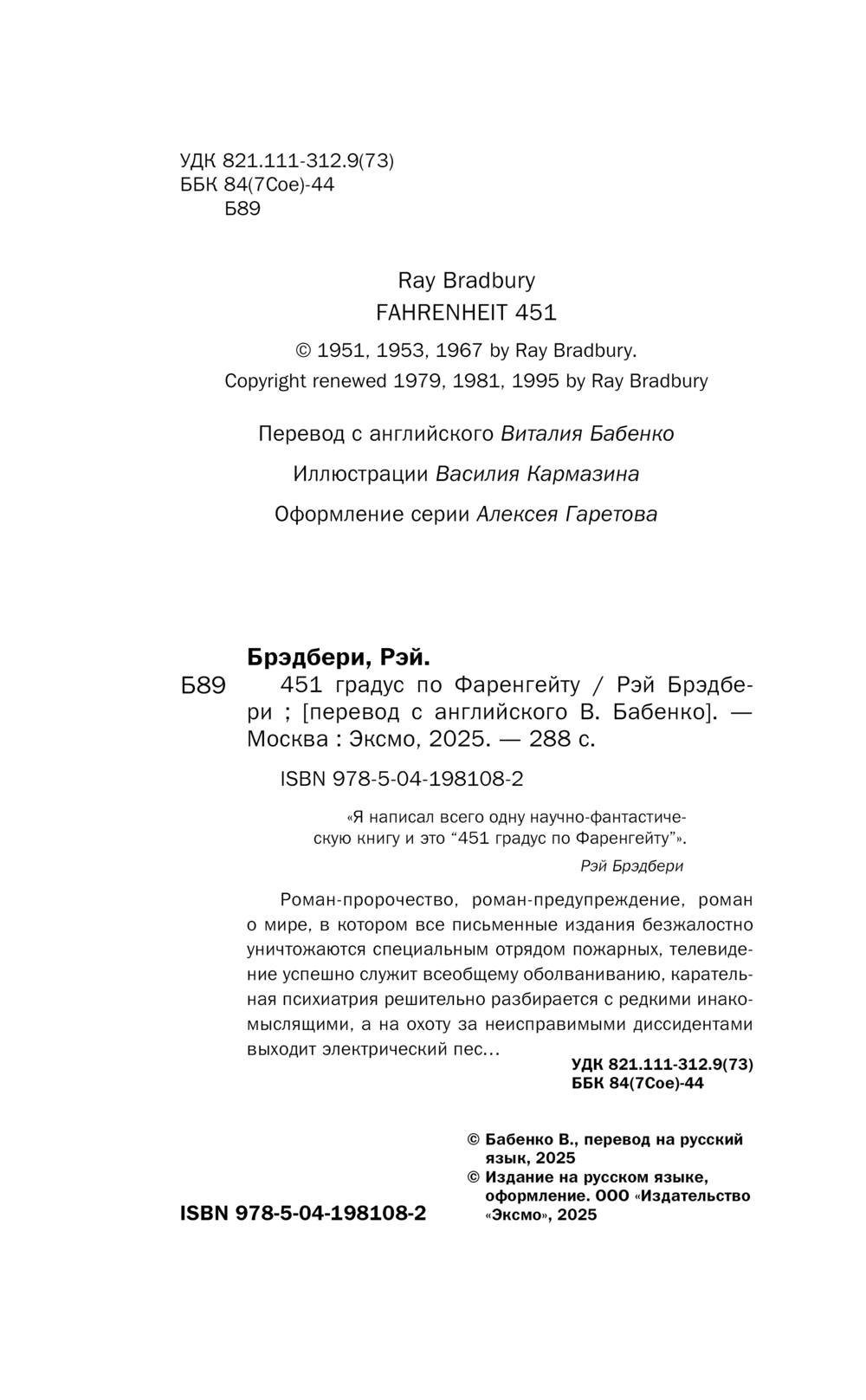 Роман-пророчество, роман-предупреждение, роман о мире, в котором все письменные издания безжалостно уничтожаются специальным отрядом пожарных, телевидение успешно служит всеобщему оболваниванию, карательная психиатрия решительно разбирается с редкими инакомыслящими, а на охоту за неисправимыми диссидентами выходит электрический пес…