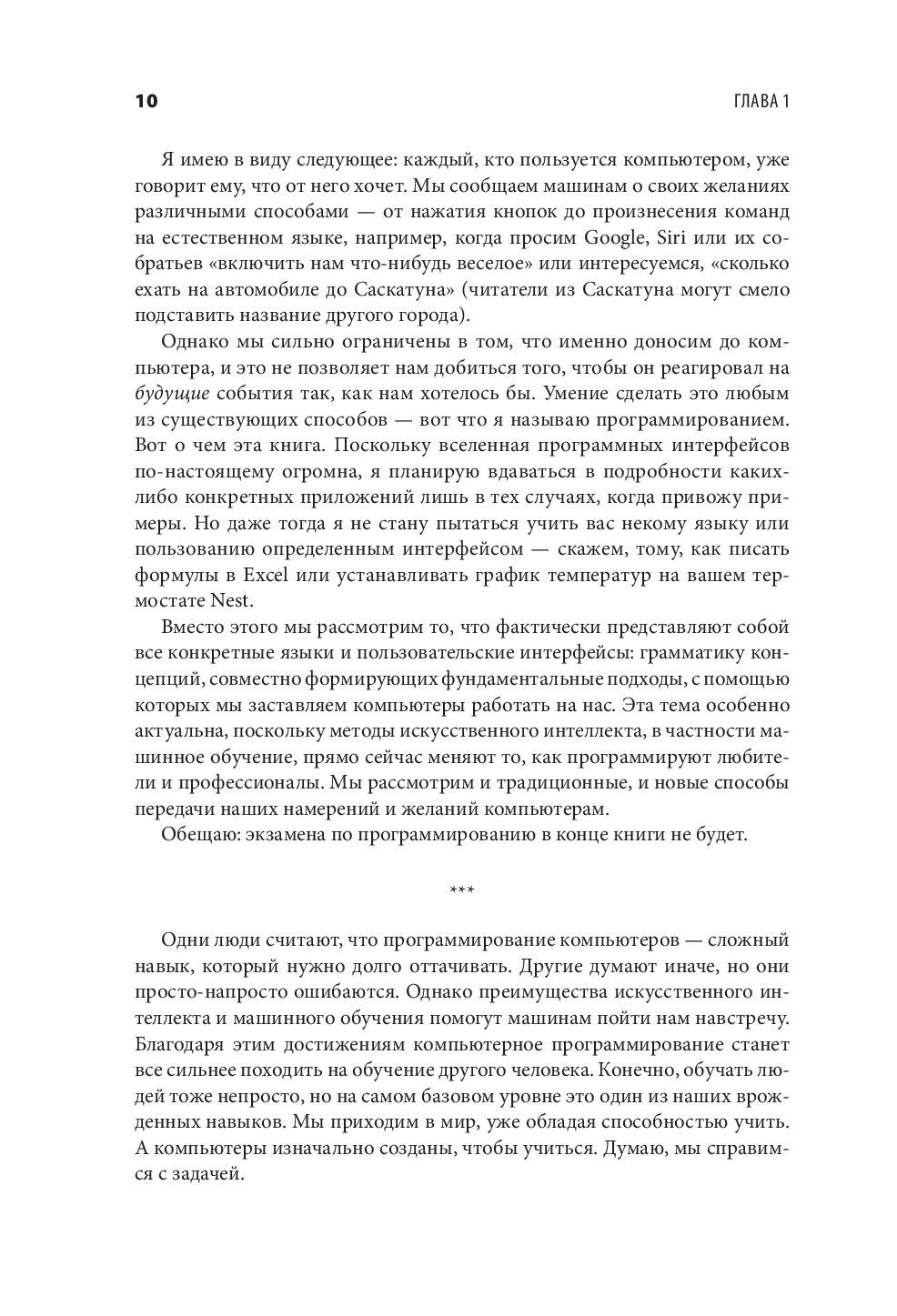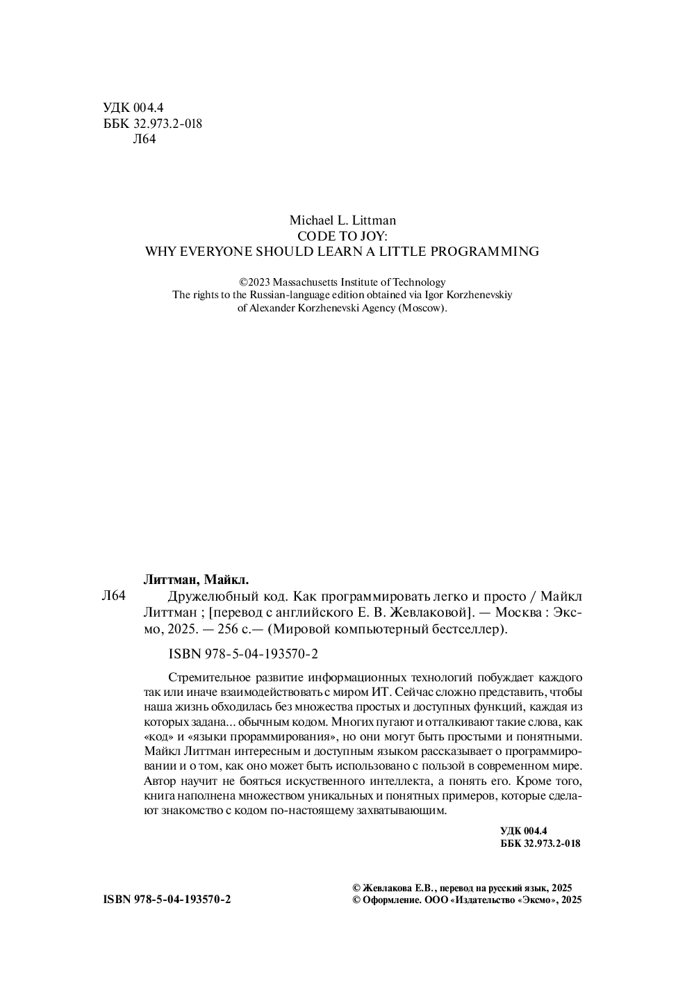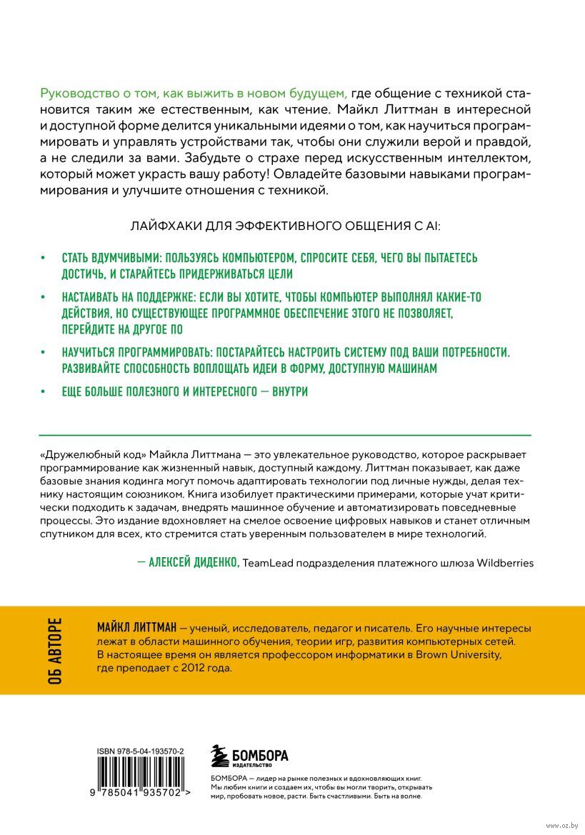 Стремительное развитие информационных технологий побуждает каждого так или иначе взаимодействовать с миром ИТ. Сейчас сложно представить, чтобы наша жизнь обходилась без множества простых и доступных функций, каждая из которых задана... обычным кодом. Многих пугают и отталкивают такие слова, как "код" и "языки программирования", но они могут быть простыми и понятными. Майкл Литтман интересным и доступным языком рассказывает о программировании и о том, как оно может быть использовано с пользой в современном мире. Автор научит не бояться искусственного интеллекта, а понять его. Кроме того, книга наполнена множеством уникальных и понятных примеров, которые сделают знакомство с кодом по-настоящему захватывающим.