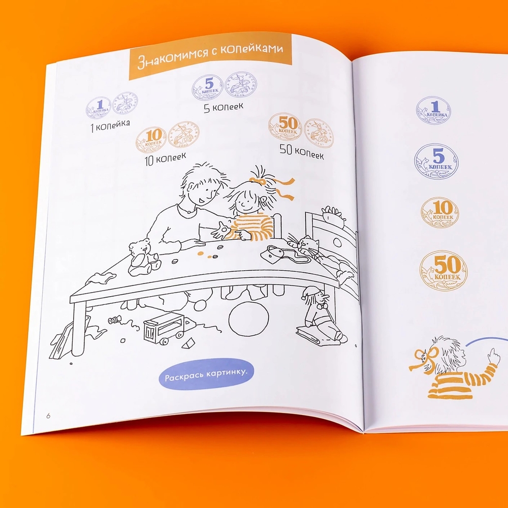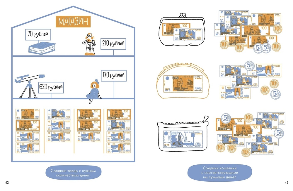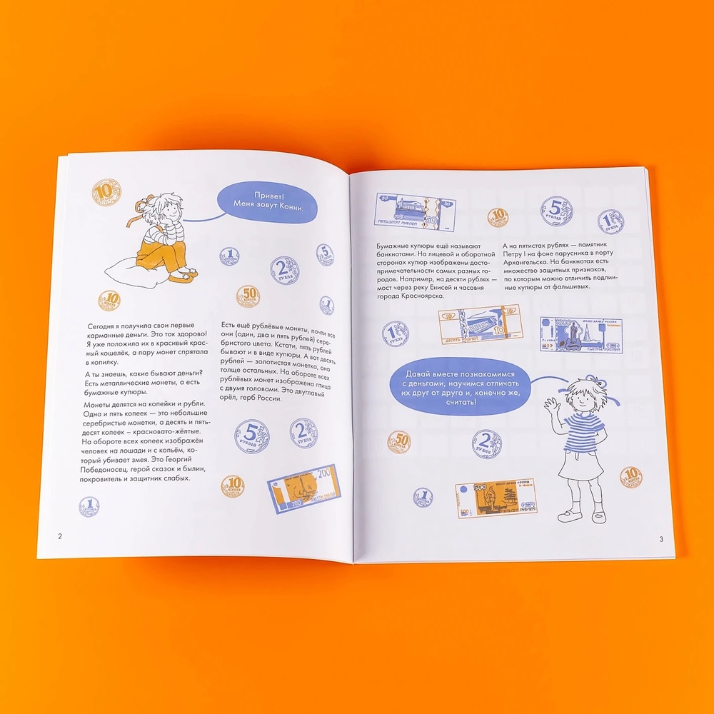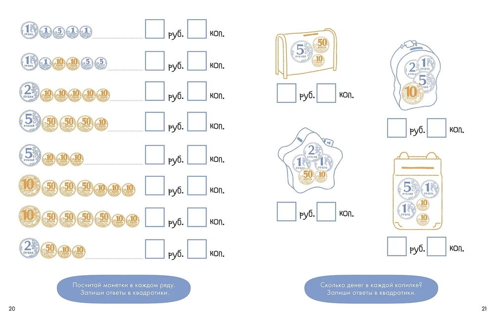Какие бывают монеты и купюры? Чем они отличаются друг от друга? Сколько копеек в одном рубле? Как посчитать сдачу? Ваш малыш легко запомнит все купюры и монеты и научится их считать с красочными головоломками, находилками и раскрасками.
